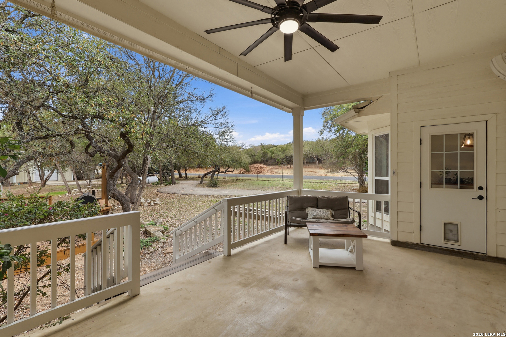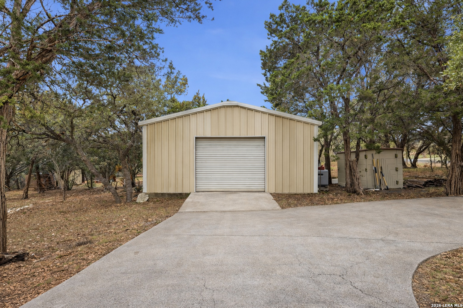 Enjoy peaceful Hill Country living in this spacious 3-bedroom, 3-bath home offering approximately 2,400 square feet, situated on a flat 1.26-acre corner lot with mature oak trees, room for a horse and chickens, RV or boat parking, and a large workshop. Inside, the home is filled with natural light, high ceilings, and warm, inviting living spaces designed for both relaxing and entertaining. A cozy study/office with its own fireplace provides the perfect place for working from home, reading, or enjoying a quiet moment. The spacious primary suite offers a private retreat with large windows and an ensuite bathroom featuring dual vanities, a soaking tub, and a separate shower. The third bedroom is thoughtfully located on the opposite side of the home with a full bathroom next to it, providing added privacy for guests or family members. Step outside and enjoy the expansive covered back porch and outdoor deck, perfect for morning coffee, evening sunsets, or hosting gatherings while taking in the peaceful Hill Country surroundings. A standout feature of the property is the large metal workshop with its own separate entrance, ideal for hobbies, storage, equipment, or additional workspace. The separate access and spacious lot also provide convenient room for RV, boat, or trailer parking. With 1.26 acres of flat usable land, mature oak trees, room for animals, and convenient access to San Antonio, this property offers the perfect blend of relaxed Hill Country living and everyday convenience.