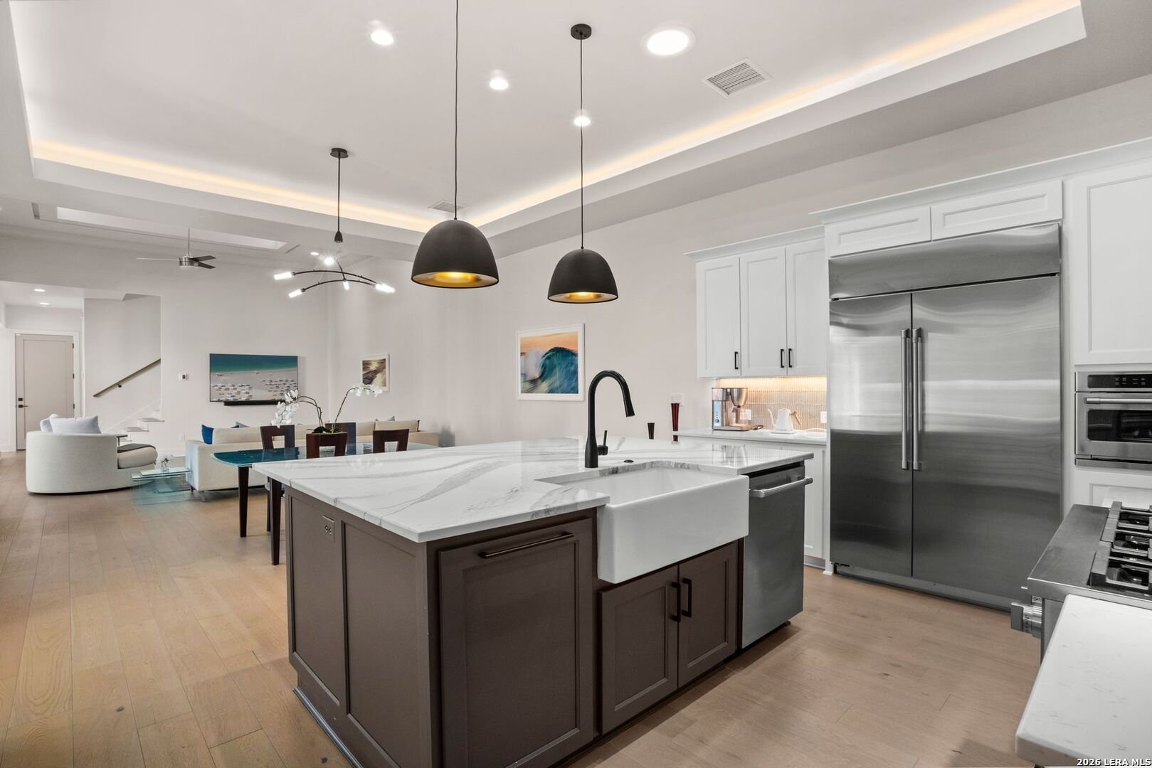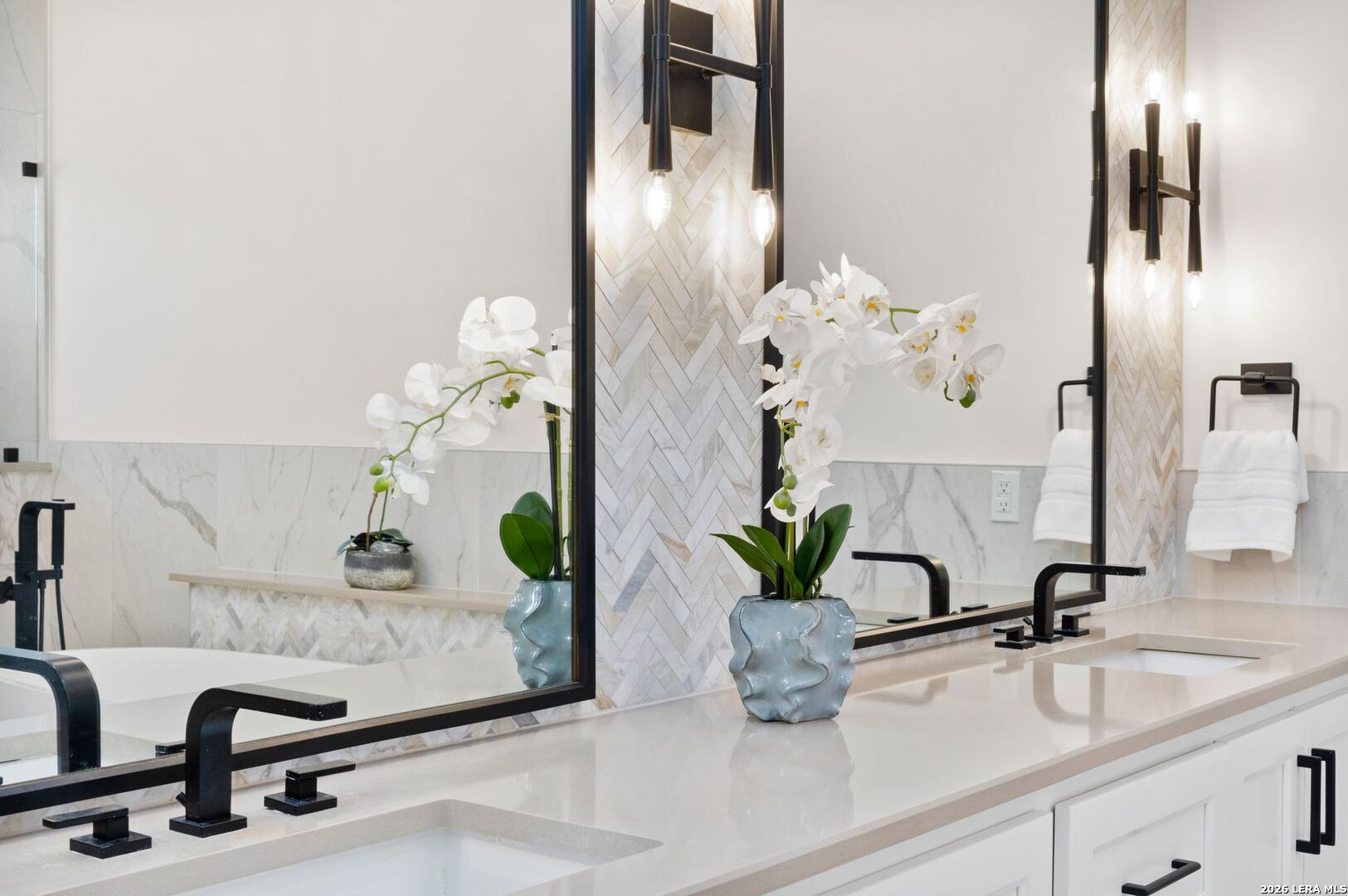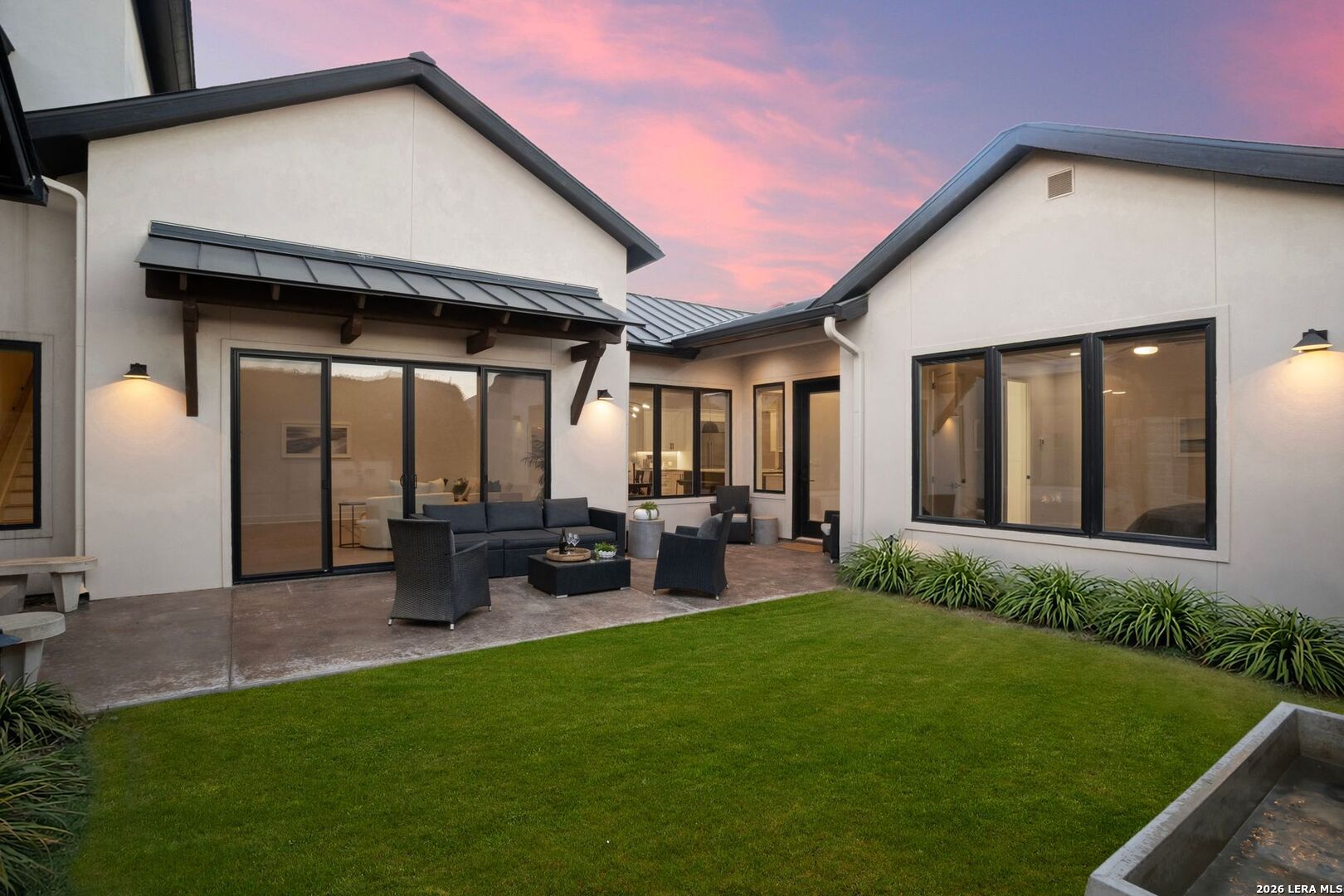 Sophisticated low-maintenance living in one of San Antonio's most prestigious communities, just moments from The Dominion Country Club. Designed by award-winning architect Gustavo Arredondo and built by Dwell Dominion, blending modern elegance with a thoughtfully designed. A striking 10-foot pivot door opens to a dramatic double-height foyer, leading into an open-concept great room, dining area, and chef's kitchen framed by soaring 10-16-foot ceilings and expansive natural light. The kitchen serves as the heart of the home, featuring an oversized island, gas cooking, double ovens, built-in appliances, and a walk-in pantry-perfect for both entertaining and everyday living. Elevated finishes, custom cabinetry, designer lighting, and premium materials are showcased throughout. The luxurious primary suite offers a spa-inspired bath with a freestanding soaking tub, spacious walk-in shower, and generous closet. A secondary bedroom with full bath on the main level provides flexibility for guests or a home office, while upstairs features a private third bedroom with en-suite bath and a cozy loft retreat. The home is thoughtfully centered around a private courtyard, where a tranquil water feature and inviting fire pit create a serene outdoor focal point creating beautiful views and seamless indoor-outdoor living ideal for relaxing or entertaining. An oversized two-car garage includes a climate-controlled workspace or can be used as storage. As a rare added benefit, the seller is offering an assumable mortgage at an exceptional interest rate, presenting a unique opportunity for significant savings.