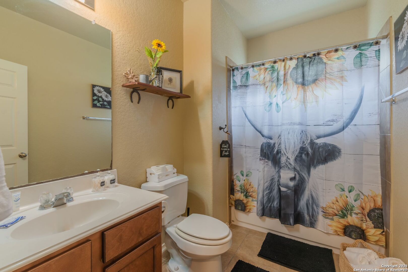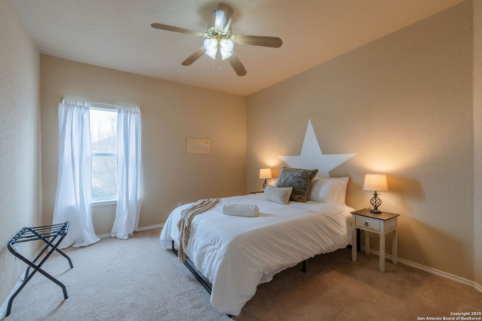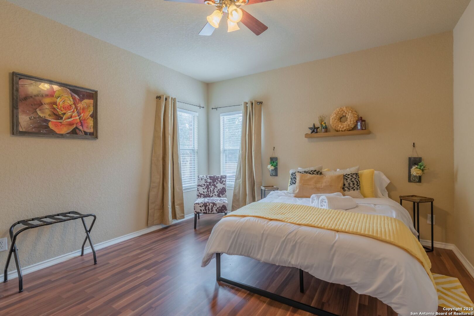 Discover elegance and space in this grand two-story residence, situated on a mature, oversized corner lot in the highly sought-after Fairway Ridge neighborhood. The regal stone and brick facade welcomes you inside to soaring ceilings and bright, airy living spaces. Host festive dinners in the formal dining room, relax in the spacious family room with wall-to-wall windows, or entertain in the gourmet kitchen featuring granite counters, stainless appliances, and a walk-in pantry. The convenient guest suite on the first floor offers versatile living options. Upstairs, the luxurious master retreat awaits with dual walk-in closets, arched windows, and a spa-style bath. Three additional upstairs bedrooms share a full bath, and a massive "Texas-sized" game room provides abundant room for recreation, office use, or creative flexibility. Outdoor living is made effortless with a covered patio, play-ready court area, and mature shade trees. Quality upgrades like wrought iron railings, and softener plumbing add exceptional value. Located with easy access to I-35 and top-rated schools, in a vibrant, growing community known for safety and charm. Experience comfortable, stylish living in a home made for both casual family life and memorable entertaining.