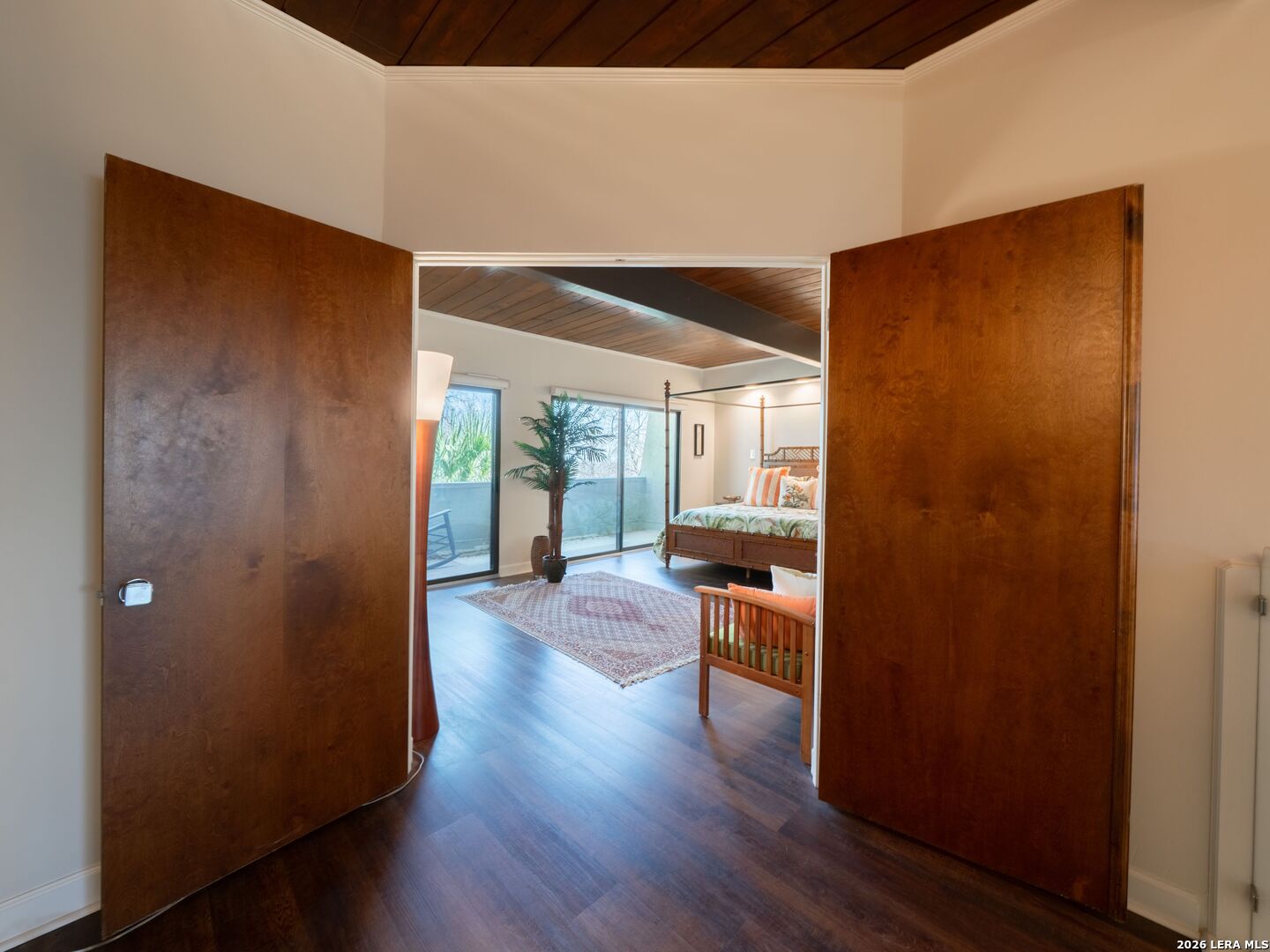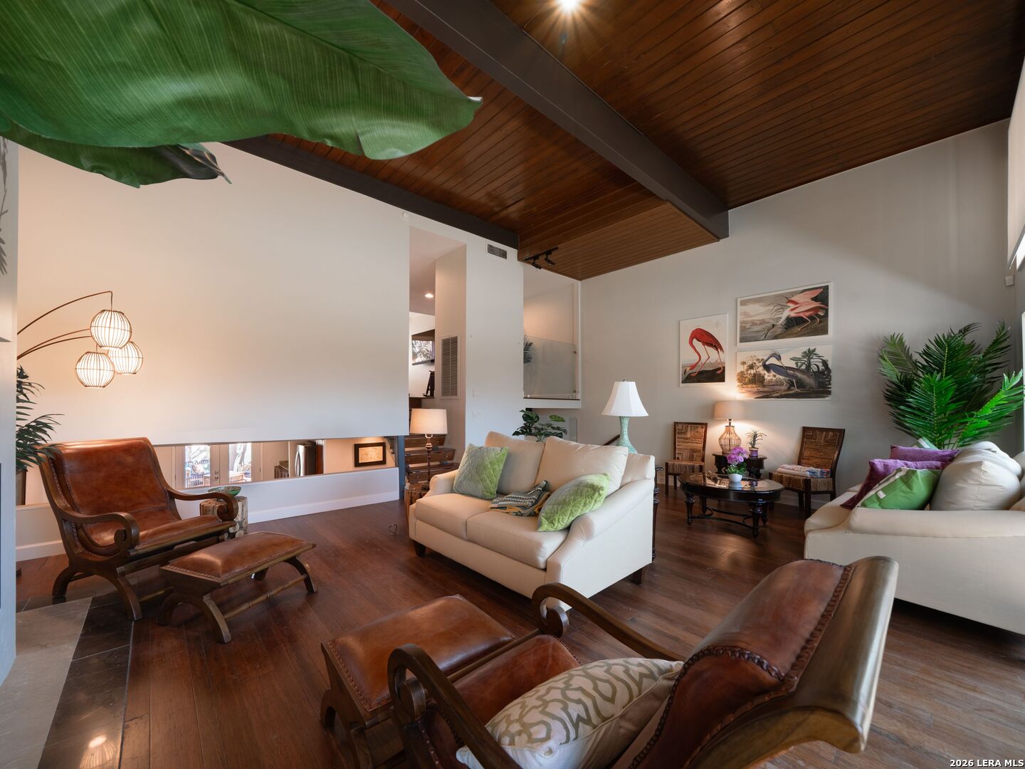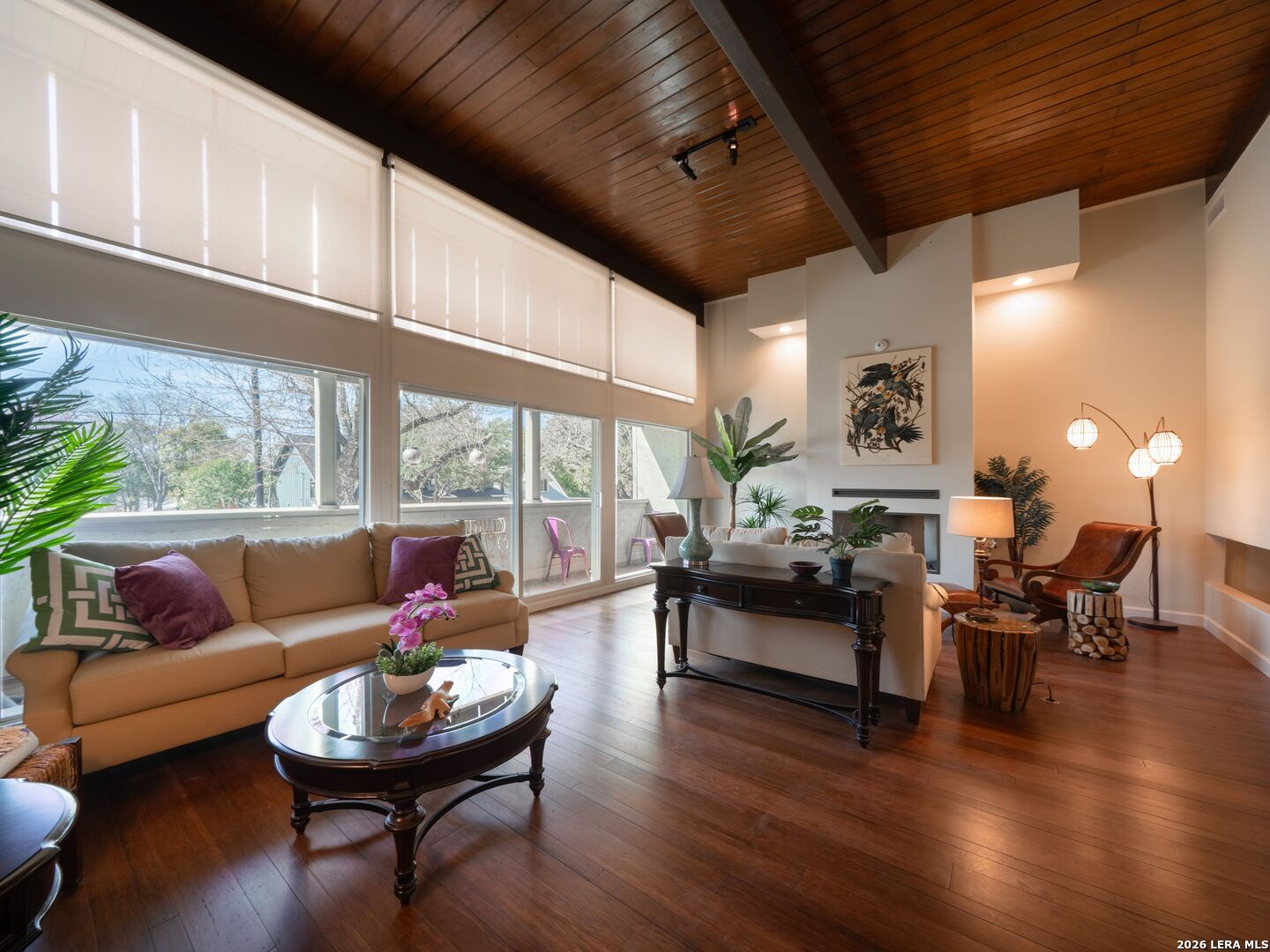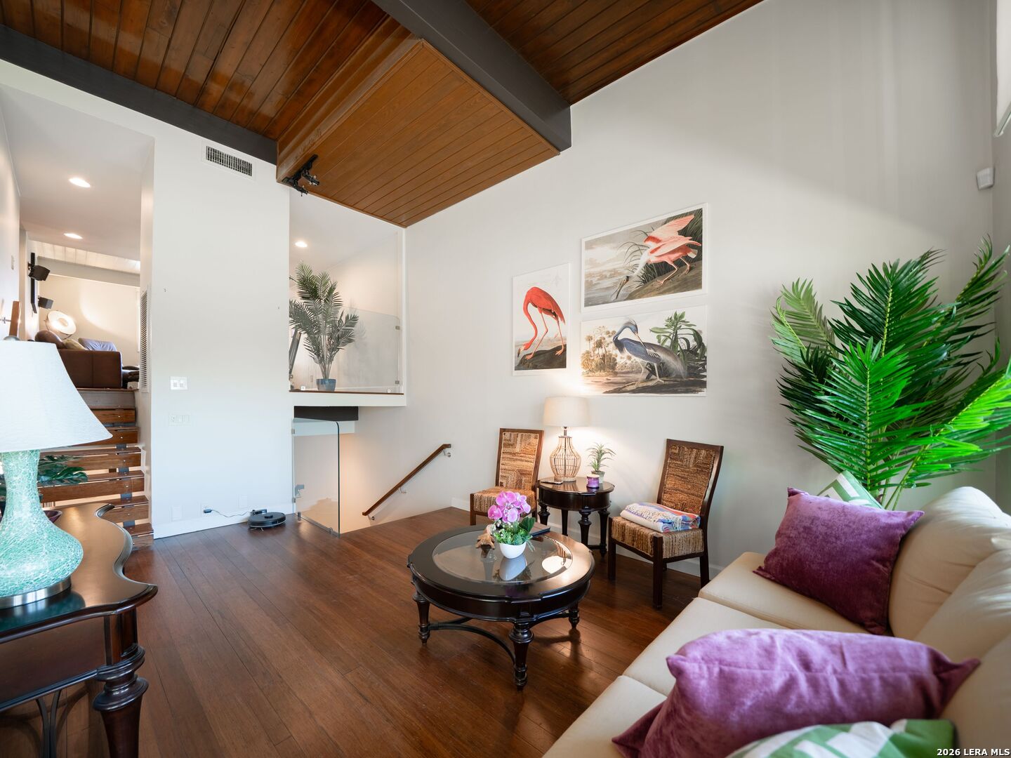 Stunning three-story Woodbridge corner unit updated with superior craftsmanship. One of the larger units onsite, this light-filled residence features soaring ceilings, expansive windows, wood floors, tongue-and-groove ceilings, and sleek glass railings. Granite kitchen with detailed glass tile backsplash and state-of-the-art appliances. Private patio plus two balconies for seamless indoor-outdoor living. Spacious primary suite offers a sunroom, walk-through shower, and enormous custom cherry-wood walk-in closet. Bonus room ideal for gym or office. Community pool and tennis courts. A true contemporary showpiece!