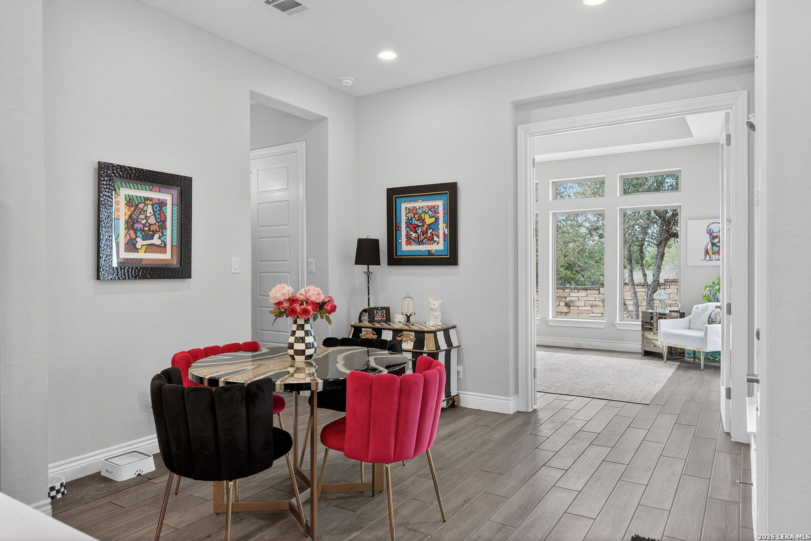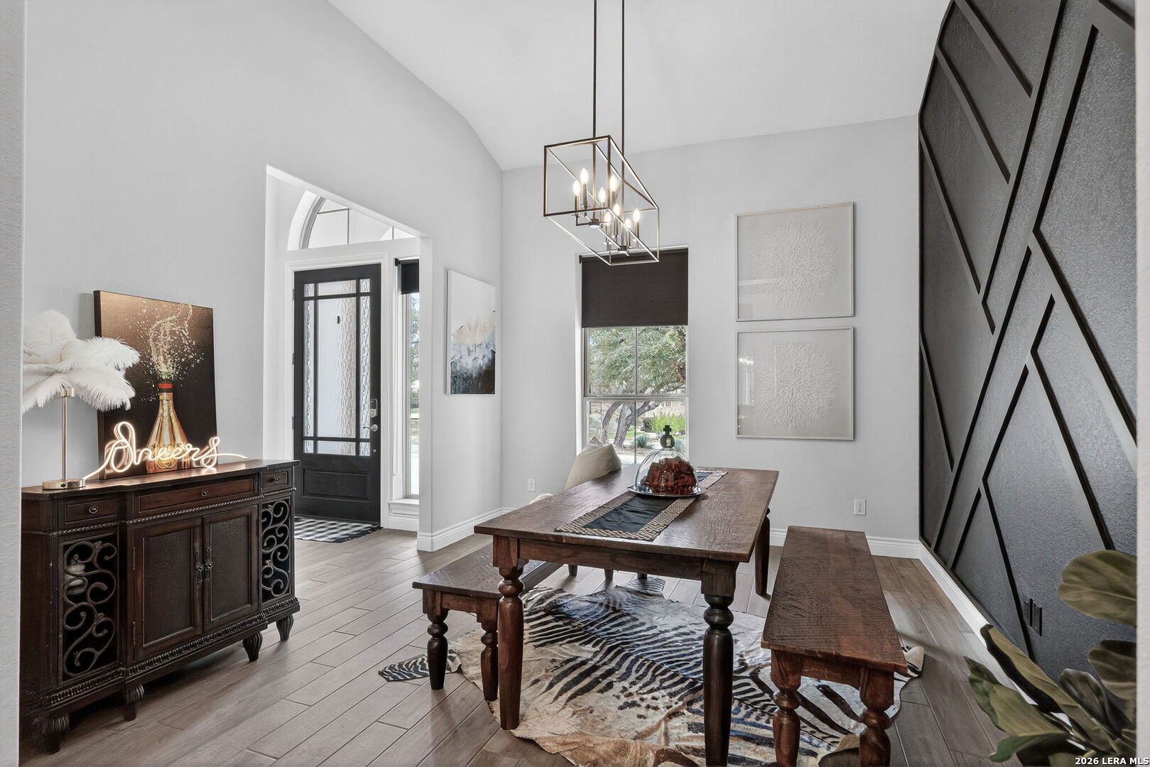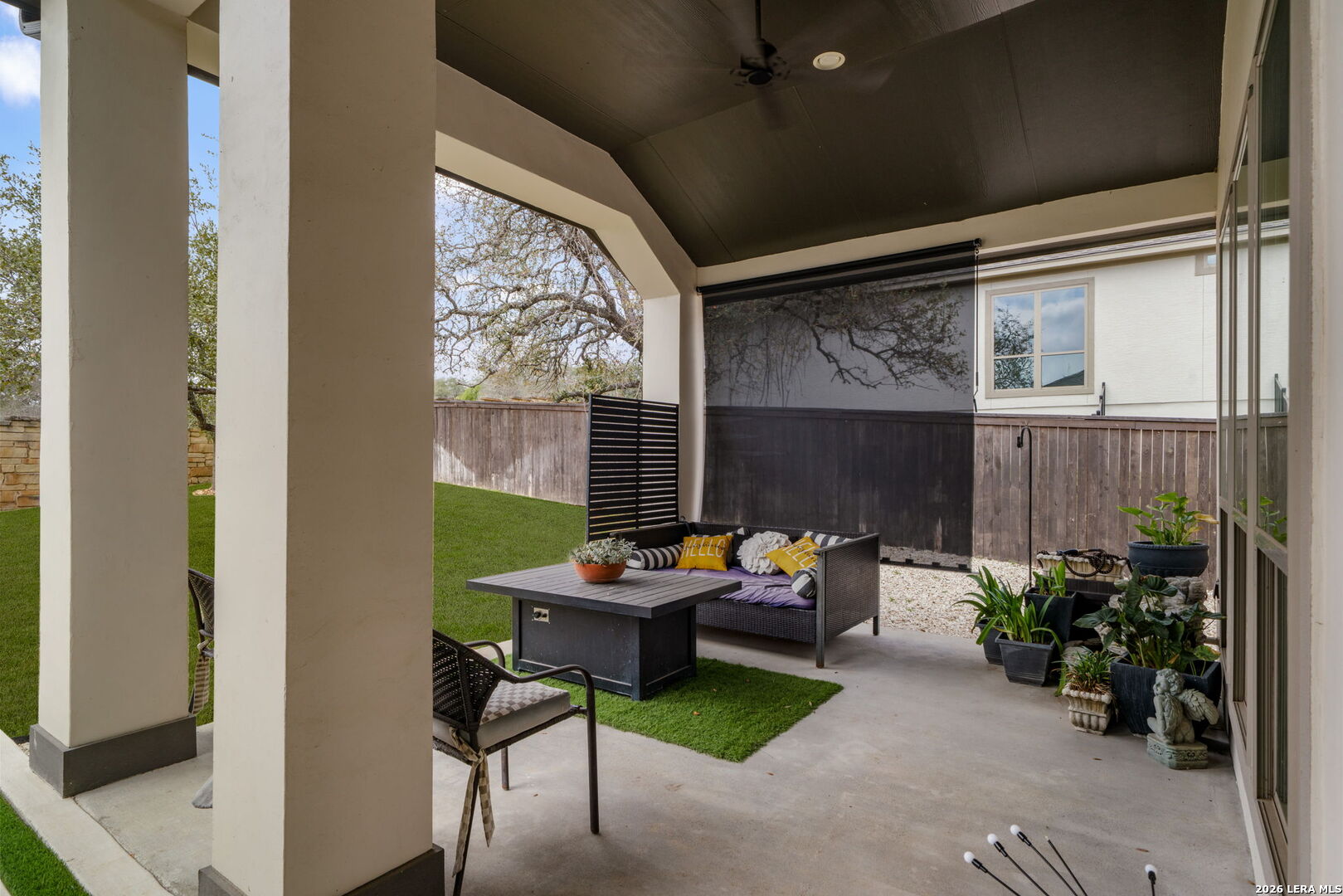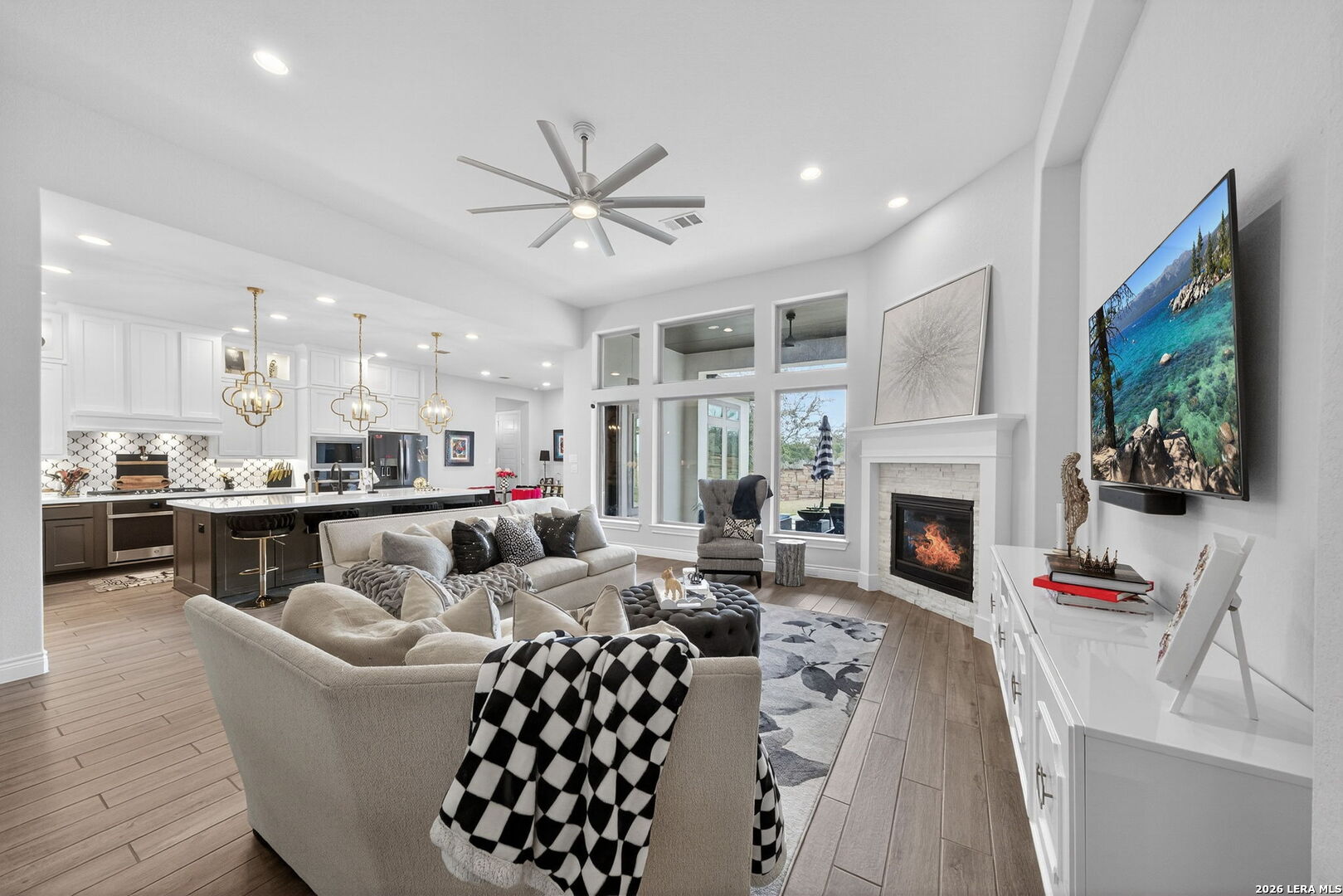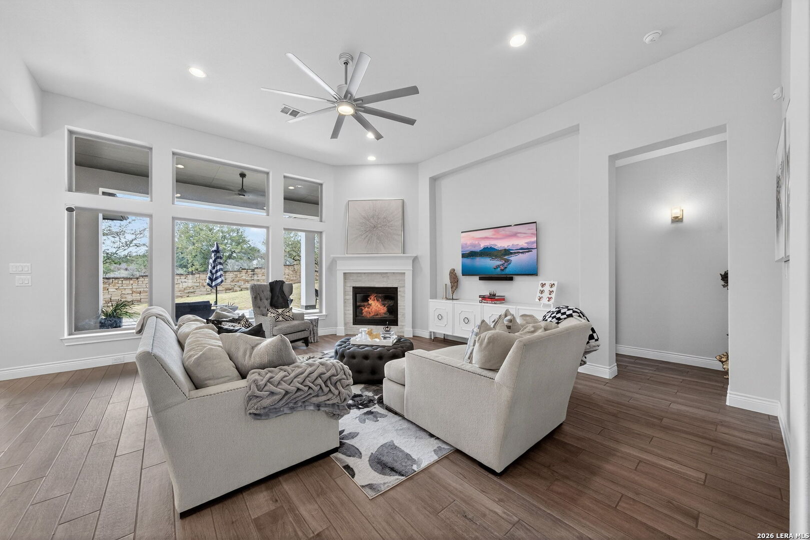 Hill Country Luxury Redefined in Johnson Ranch - 1-Story Perry home Estate Backing to Greenbelt! Welcome to luxury living in the highly sought-after Johnson Ranch community in Bulverde! This stunning 3,205 SF single-story home offers 4 spacious bedrooms, 3 full baths, a 3-car garage, and an extended driveway-perfectly blending elegance, comfort, and functionality. From the moment you step through the beautiful vestibule entry, you're greeted by soaring high ceilings, an open-concept layout, and designer finishes throughout. The heart of the home features a gourmet eat-in kitchen with upgraded fixtures, gold accent hardware, an extensive island, and a butler's pantry complete with built-in wine storage-ideal for entertaining. The kitchen flows seamlessly into the expansive living area, anchored by a cozy gas fireplace, soaring ceilings, towering windows, and an abundance of natural light. Host unforgettable gatherings in the formal dining room, or enjoy casual mornings in the bright breakfast area overlooking the backyard. The thoughtfully designed floor plan includes two dedicated study/office spaces-perfect for working from home, creative pursuits, or a private library-plus a spacious game room for relaxation and fun. The private primary suite offers a luxurious retreat, while three additional bedrooms provide ample space for family or guests. Step outside to your large backyard backing to a serene greenbelt, offering privacy and peaceful views with no rear neighbors. Located within a gated community featuring a resort-style pool and exceptional amenities, this home delivers upscale Hill Country living at its finest. Experience refined comfort, modern elegance, and the lifestyle you've been dreaming of-all in one extraordinary home.