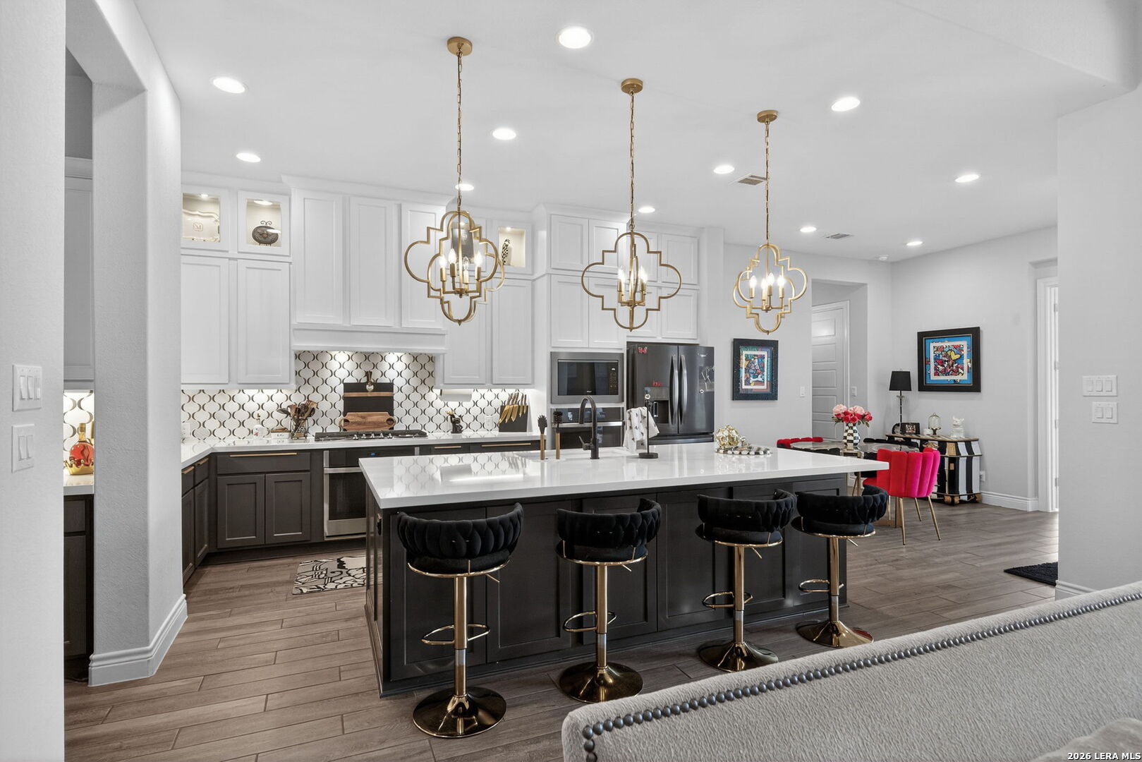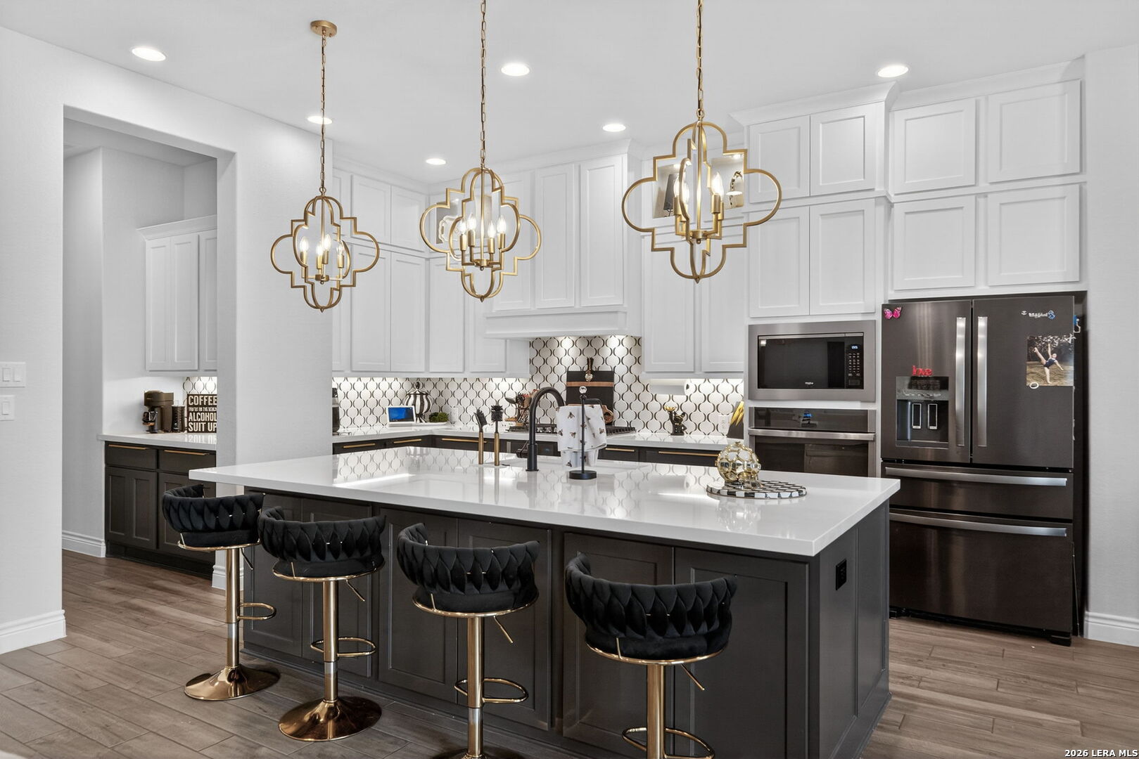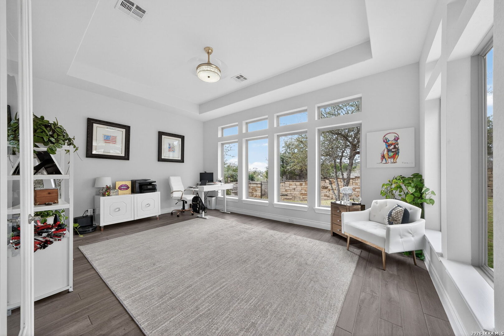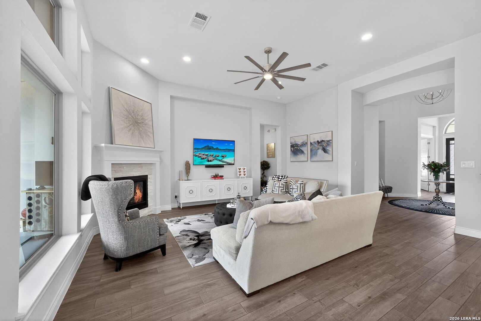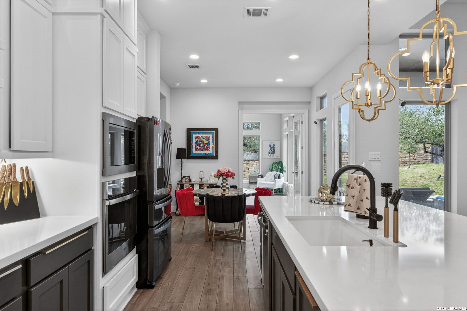 Hill Country Luxury Redefined in Johnson Ranch - 1-Story Perry home Estate Backing to Greenbelt! Welcome to luxury living in the highly sought-after Johnson Ranch community in Bulverde! This stunning 3,205 SF single-story home offers 4 spacious bedrooms, 3 full baths, a 3-car garage, and an extended driveway-perfectly blending elegance, comfort, and functionality. From the moment you step through the beautiful vestibule entry, you're greeted by soaring high ceilings, an open-concept layout, and designer finishes throughout. The heart of the home features a gourmet eat-in kitchen with upgraded fixtures, gold accent hardware, an extensive island, and a butler's pantry complete with built-in wine storage-ideal for entertaining. The kitchen flows seamlessly into the expansive living area, anchored by a cozy gas fireplace, soaring ceilings, towering windows, and an abundance of natural light. Host unforgettable gatherings in the formal dining room, or enjoy casual mornings in the bright breakfast area overlooking the backyard. The thoughtfully designed floor plan includes two dedicated study/office spaces-perfect for working from home, creative pursuits, or a private library-plus a spacious game room for relaxation and fun. The private primary suite offers a luxurious retreat, while three additional bedrooms provide ample space for family or guests. Step outside to your large backyard backing to a serene greenbelt, offering privacy and peaceful views with no rear neighbors. Located within a gated community featuring a resort-style pool and exceptional amenities, this home delivers upscale Hill Country living at its finest. Experience refined comfort, modern elegance, and the lifestyle you've been dreaming of-all in one extraordinary home.