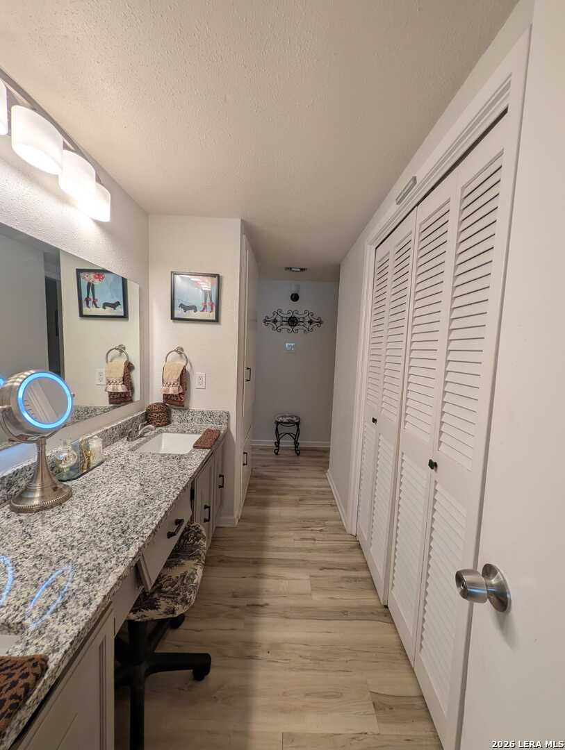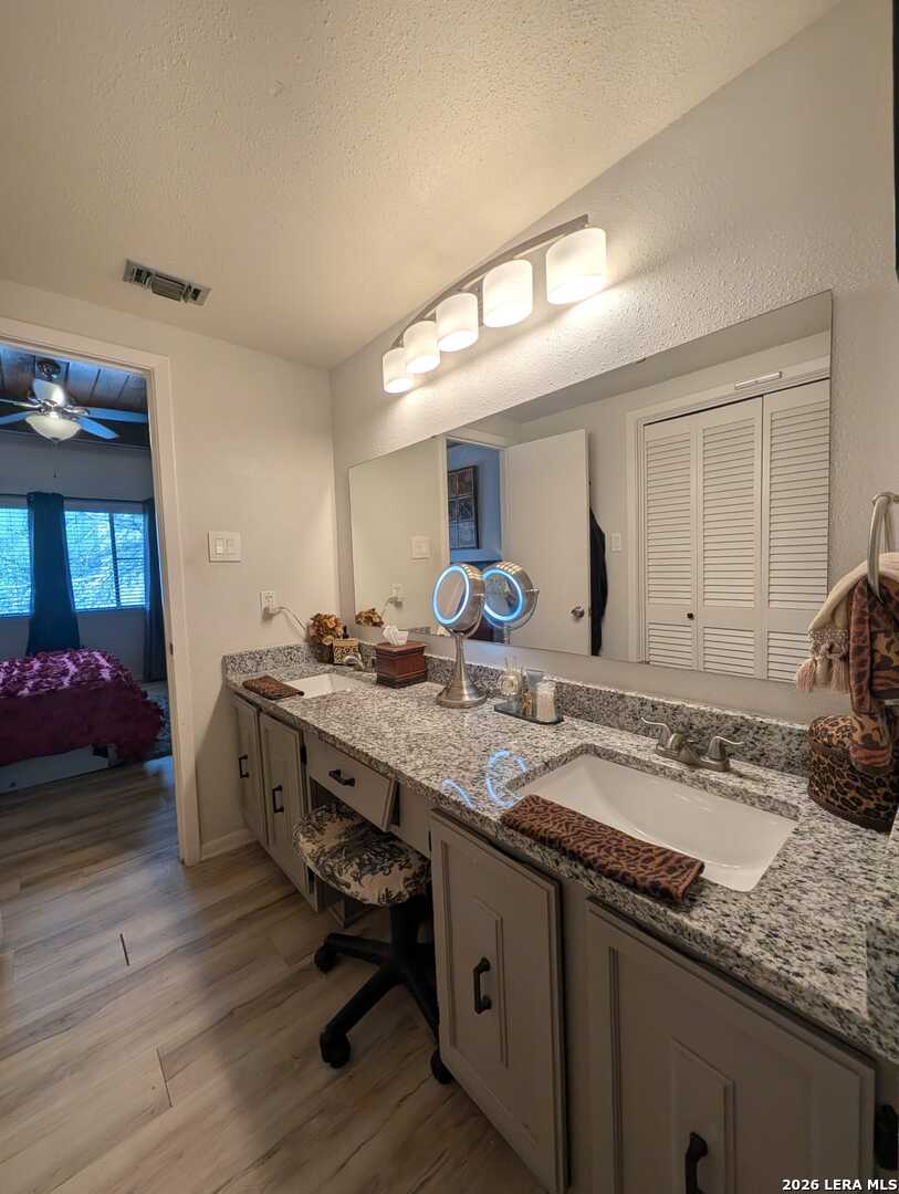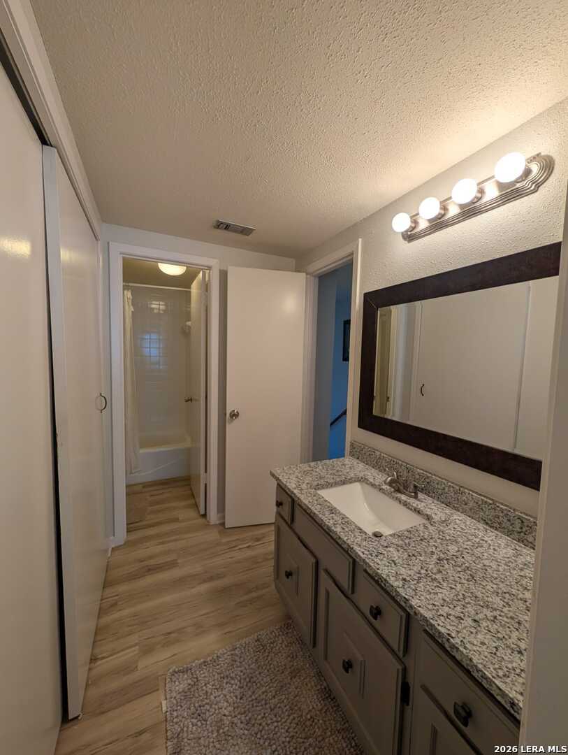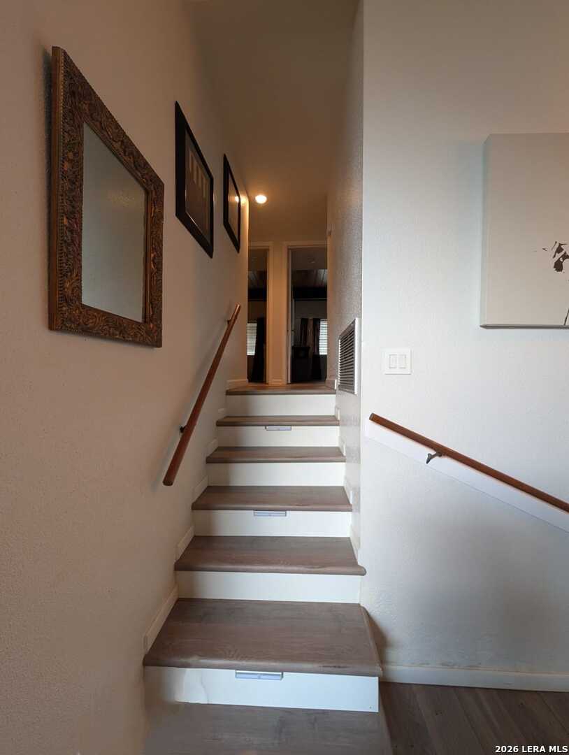 Welcome to this beautifully maintained 2-bedroom, 2.5-bath and 2 car garage condominium in the highly desirable Woodbridge Condominiums. This inviting home offers the perfect blend of comfort, character, and location. Enjoy your own charming front yard with a mature tree-an ideal space to relax, unwind, and enjoy the beautiful San Antonio skies or gather with family and friends. The first level features an updated kitchen with granite countertops and a dining area overlooking the peaceful yard. The layout flows comfortably into the living area, creating a warm and functional space for everyday living. The second level showcases stunning wood-beamed ceilings, an open living space with a cozy fireplace, private balcony, and a wet bar-perfect for entertaining guests or enjoying quiet evenings at home. On the third level, you will find two spacious bedrooms, both featuring beautiful wood-beamed ceilings and abundant natural light, creating a bright and inviting retreat. Residents of Woodbridge Condominiums enjoy excellent amenities including a swimming pool, tennis court, and clubhouse. The location is exceptional, offering convenient access to Loop 410 via Wurzbach and just minutes from Fort Sam Houston, Alamo Heights, Downtown San Antonio, shopping, dining, and parks. If you're looking for character, comfort, and convenience all in one place, this is the home for you. Schedule your private showing today and discover everything this wonderful property has to offer!