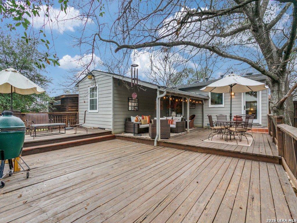 Welcome to 311 Brees, a charming cottage-style gem nestled in the heart of San Antonio and located within the highly sought-after Alamo Heights ISD. This inviting 3-bedroom, 1-bath residence perfectly blends timeless character with comfortable, modern living. Inside, you will find three well-sized bedrooms plus a dedicated office-ideal for a professional workspace, creative studio, or flexible bonus room. Natural light pours into every corner, enhancing the home's cozy cottage charm and warm atmosphere. The outdoor living spaces are a true highlight of this property. Enjoy slow mornings on the fabulous covered front porch or host weekend gatherings on the expansive back deck. The oversized deck overlooks a peaceful, private backyard shaded by majestic mature trees, creating a serene park-like setting. For added convenience, the property includes a sturdy storage shed perfect for tools and seasonal decor. With its character-filled design, generous outdoor entertaining areas, and prime location near local dining and shopping, 311 Brees presents a rare opportunity to own a beautiful home in one of the area's most desirable school districts.