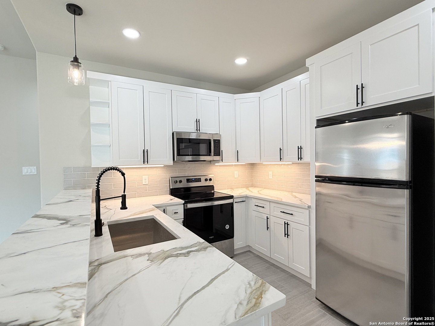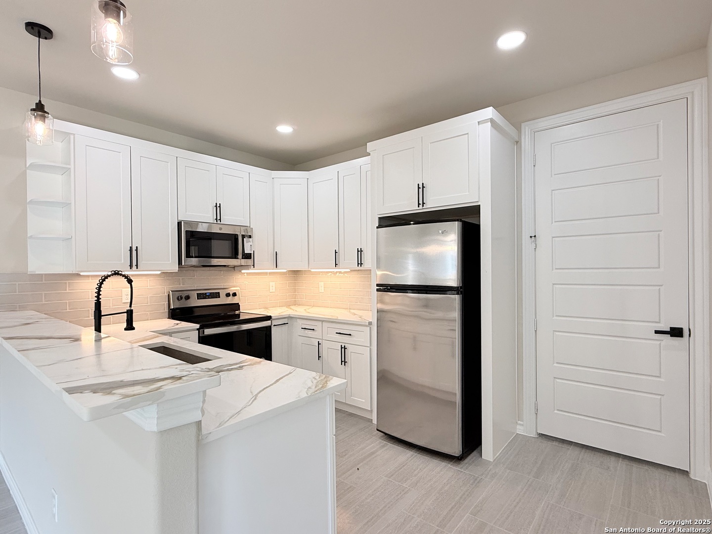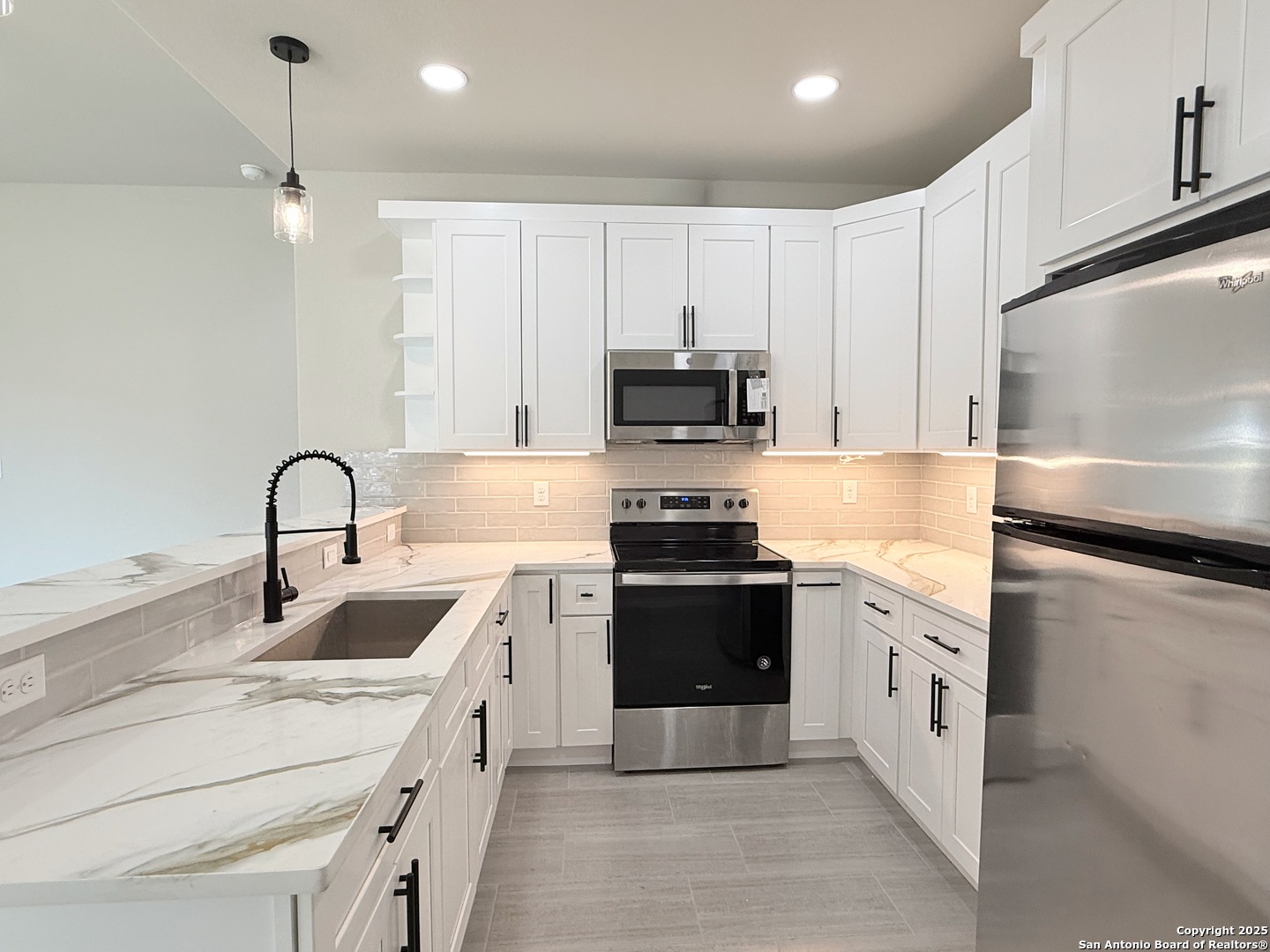 Step into this stunning BRAND NEW 3-bedroom, 2-bath home, offering a single-story, no-step layout designed for comfort and accessibility. Enjoy easy maintenance with all-tile flooring (no carpet!), complemented by grand 8-foot doors, custom ceiling treatments, and a durable stucco-and-stone exterior that provides long-term peace of mind. The spacious primary suite includes a sleek walk-in shower and a walk-in closet. This home is ideally located just minutes from Lackland AFB and under 15 minutes from Downtown San Antonio, making it perfect for commuters or those seeking quick access to the city's best. As an added value, the Refrigerator, Washer, and Dryer are INCLUDED, making this a truly move-in-ready opportunity. Full privacy fencing and a fresh, modern design round out the list of highlights. Schedule your showing today! Schedule your showing today and make this beautiful new home yours!