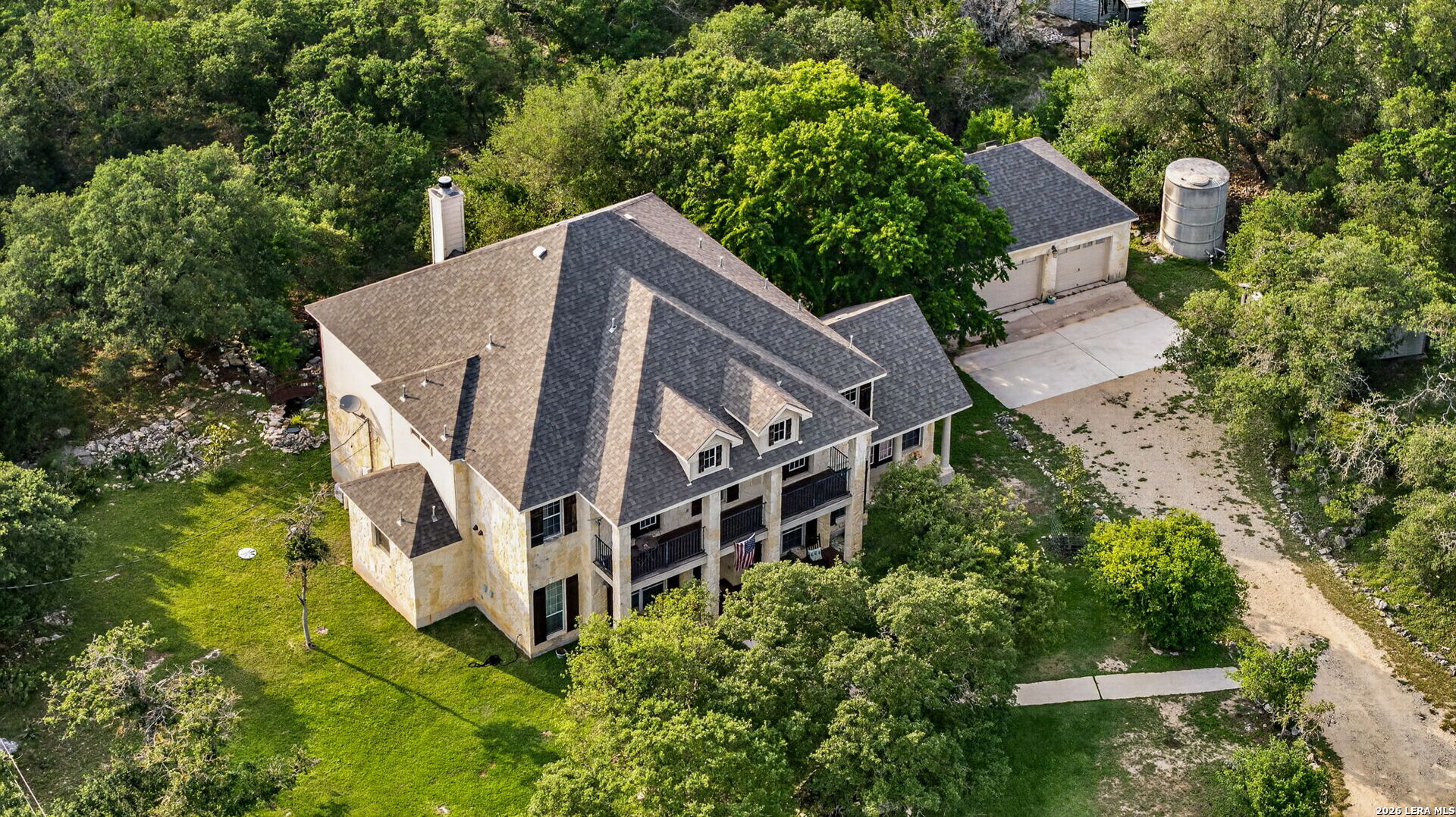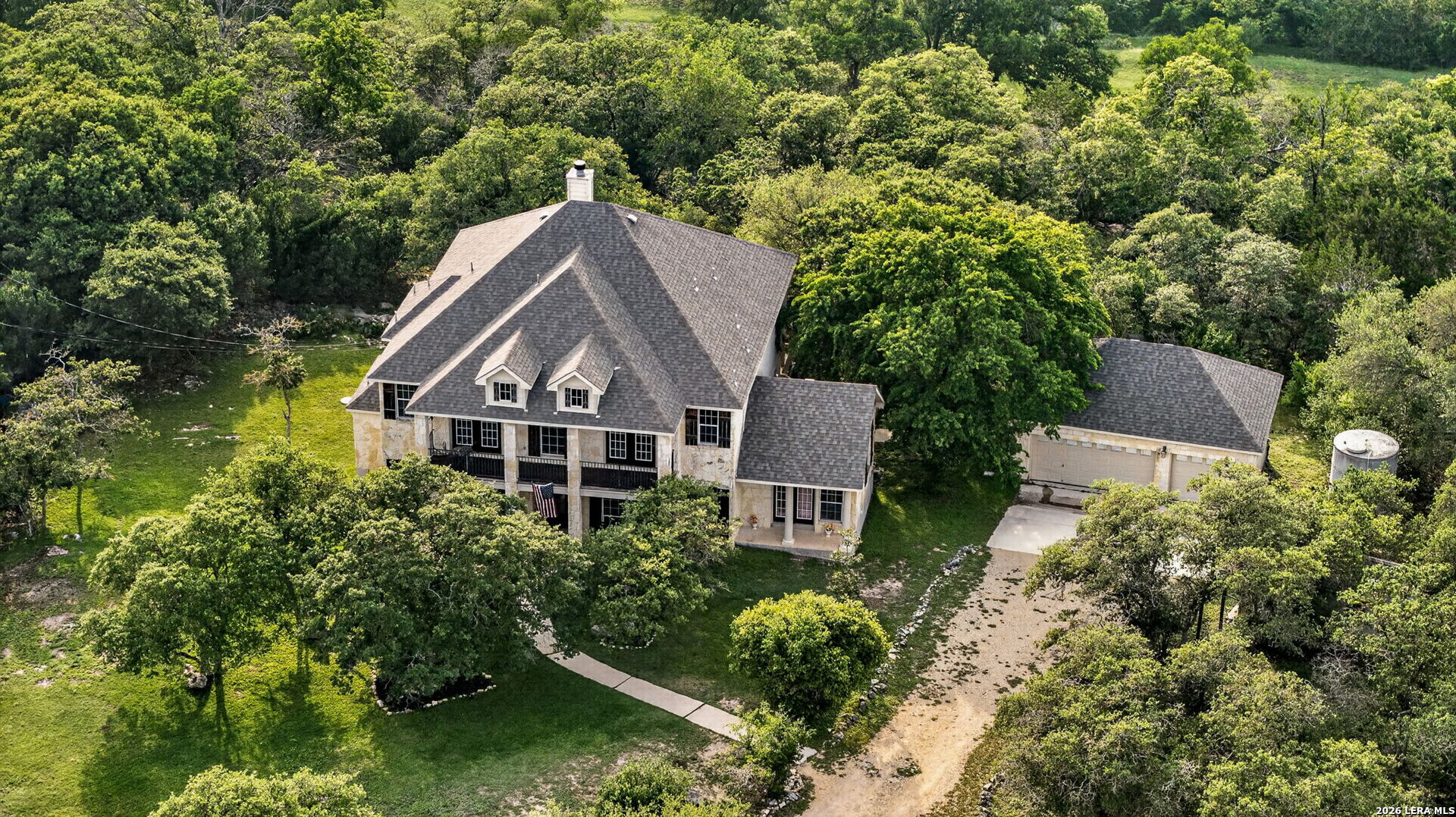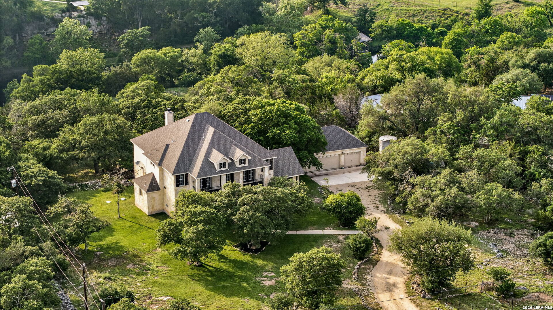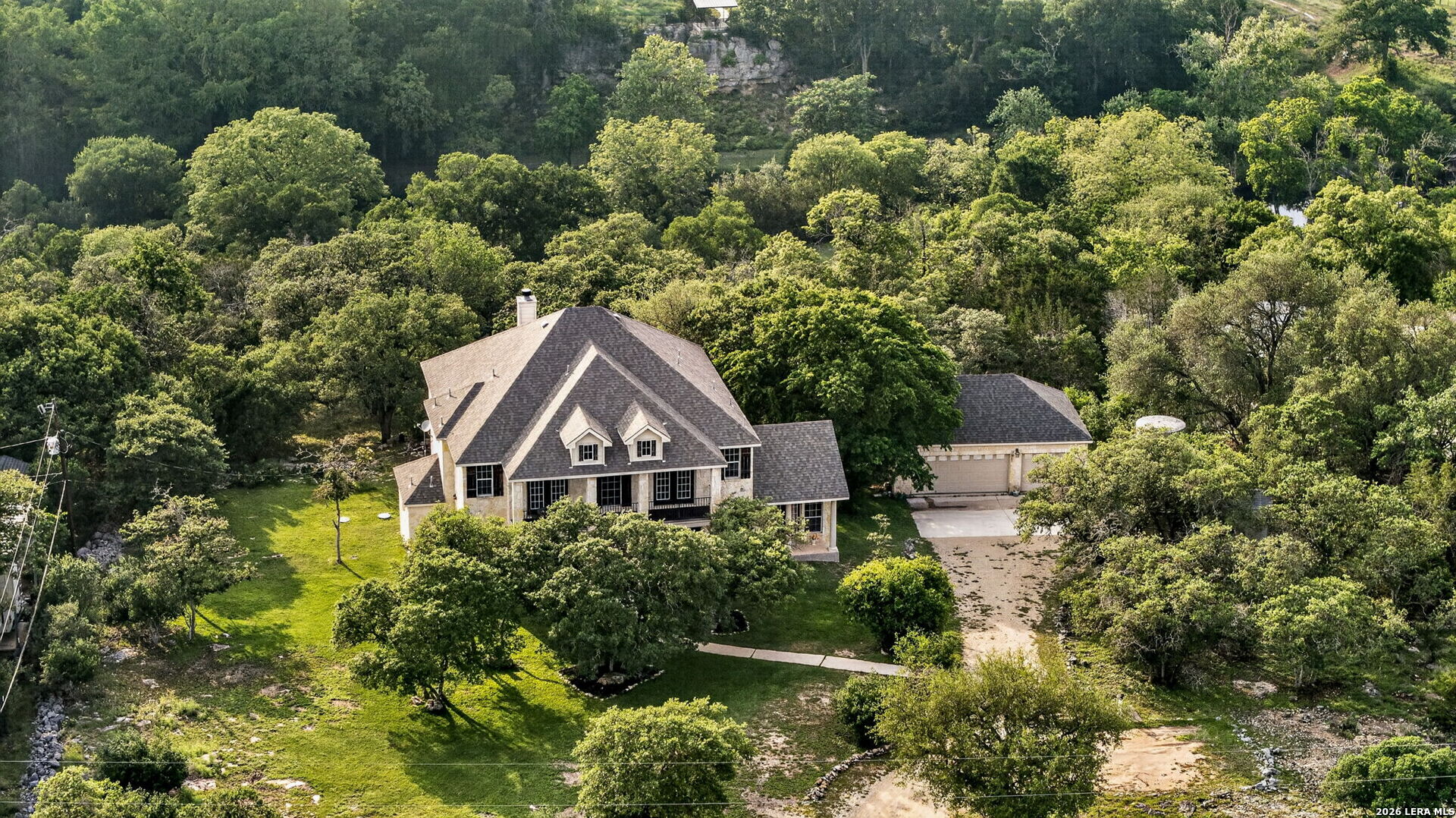 Your own piece of Texas Hill Country awaits. Set on 3.04 scenic acres along Spring Creek, this expansive 3,996 sq ft property offers the perfect blend of comfort, space, and outdoor enjoyment ideal for cooling off and relaxing during the hot summer months. The property is enhanced by mature trees throughout, providing natural beauty, shade, and added privacy. Inside, you'll find 4 spacious bedrooms and 3.5 baths, along with a thoughtfully designed layout that includes a formal dining room, dedicated living room with a cozy fireplace, and a generous family room. Entertainment is effortless with a game room and a fully equipped media room, while a formal study/office provides a quiet space for work or reading. The private primary suite offers a peaceful retreat, complete with direct access to the back patio perfect for enjoying quiet mornings or unwinding in the evening. The primary bath features a walk-in shower, a soaking tub for relaxing, and separate vanities. The home also features a 3-car garage, a private well, and a storage shed for added convenience. Step outside to enjoy the front balcony or relax on the back patio, both offering breathtaking Hill Country views. Residents also enjoy access to a community amenity featuring three parks along the Guadalupe River perfect for summertime tubing and making the most of the Texas heat. This property delivers privacy, functionality, and classic Texas charm all in one exceptional package. Schedule your showing today!