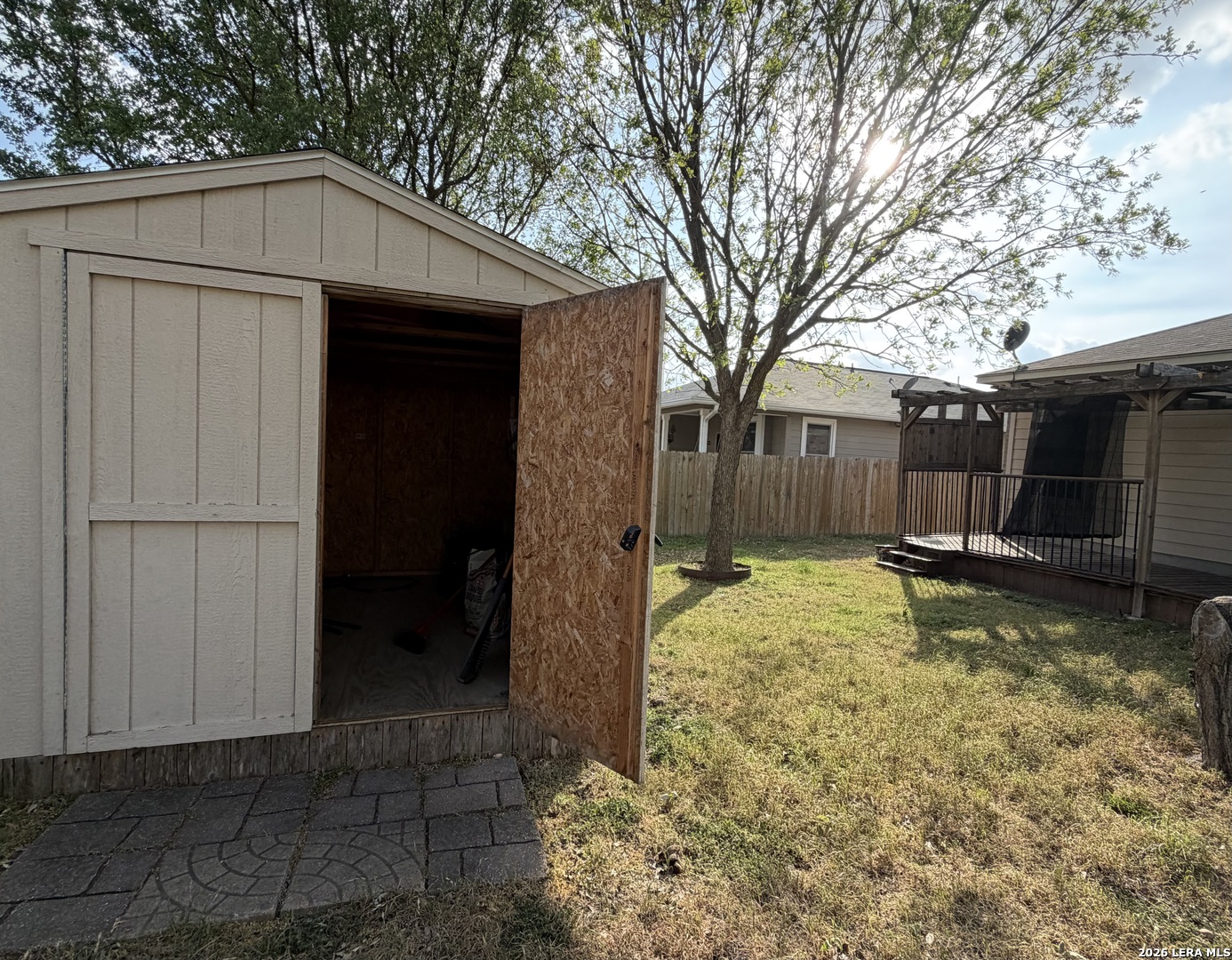 Welcome to this inviting 4-bedroom, 2-bathroom home perfectly positioned on a desirable corner lot along a quiet one-block cul-de-sac-offering the benefit of reduced through traffic and a more peaceful setting in New Braunfels, TX. Ideally located just 20 minutes to San Antonio and only 13 minutes to the San Marcos Premium Outlets, this home offers convenient access to shopping, dining, and major commuter routes while still enjoying a tucked-away neighborhood feel. Creekside shopping is right down the hill from the subdivision. Inside, you'll find an open-concept living, dining, and kitchen layout designed for both comfort & entertaining. The living room features a custom wood-built cabinet with a charming vintage heater, creating the cozy look and feel of a fireplace-perfect as a focal point for relaxing evenings. The laundry area is conveniently tucked into a hall closet near the primary bedroom, making daily routines efficient. With four bedrooms and two full bathrooms, there is flexibility for guests, hobbies, or home office needs. Step outside to enjoy the covered wooden deck, an ideal space for morning coffee or weekend gatherings. The backyard also includes a storage shed, offering extra space for tools, outdoor gear, or seasonal items. Priced below the current tax-assessed value, this home presents an excellent opportunity for buyers seeking strong value in a convenient location. Come see how comfort, convenience, and value come together in this well-located home.
