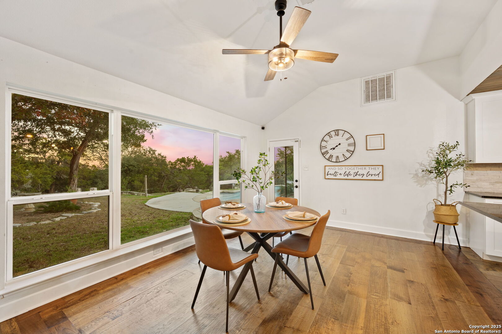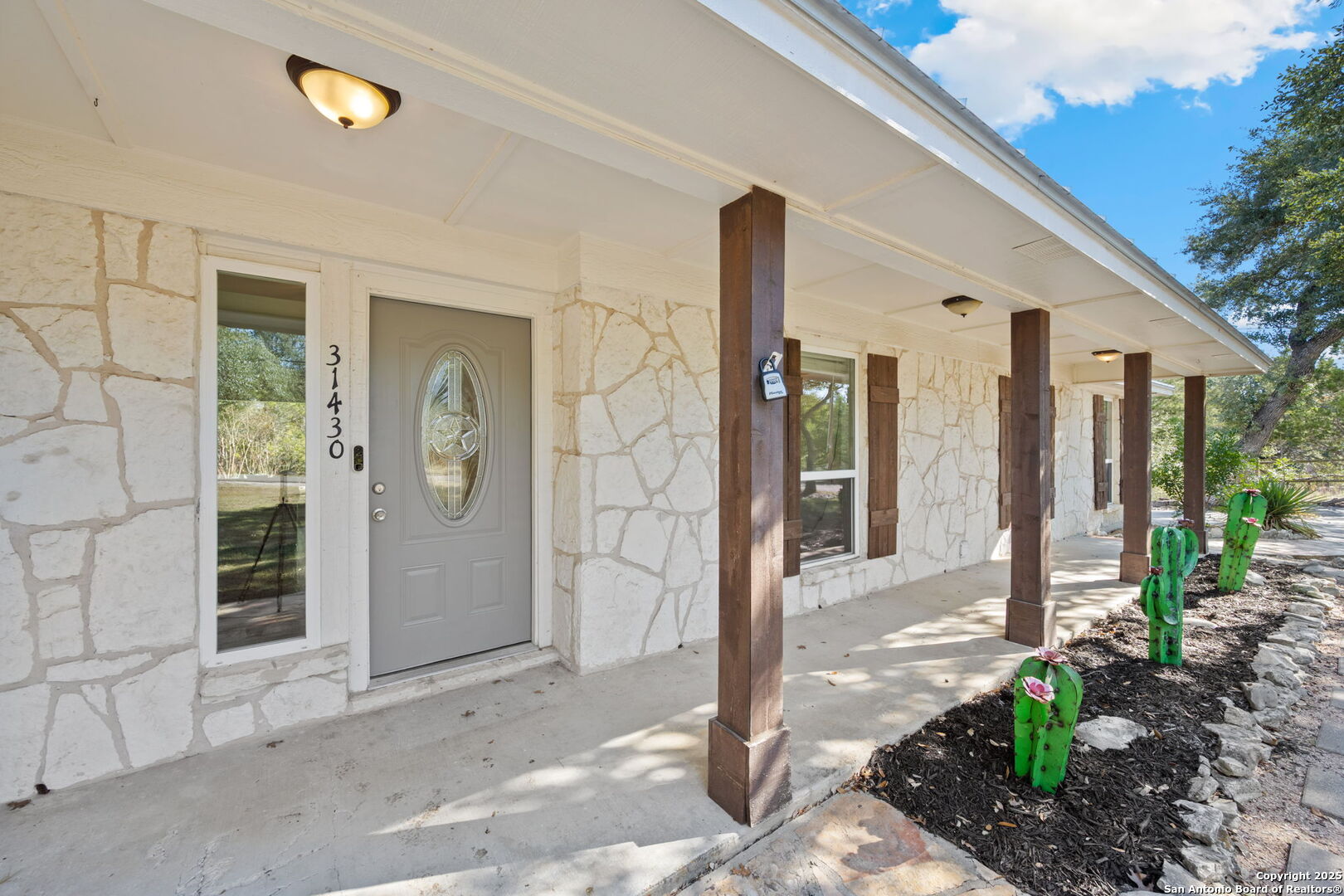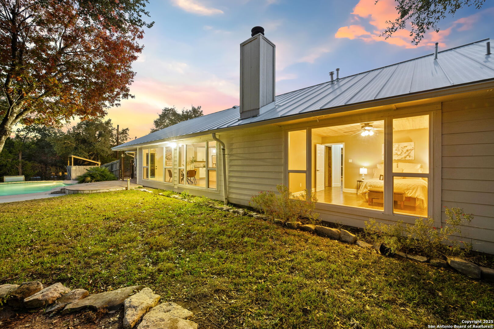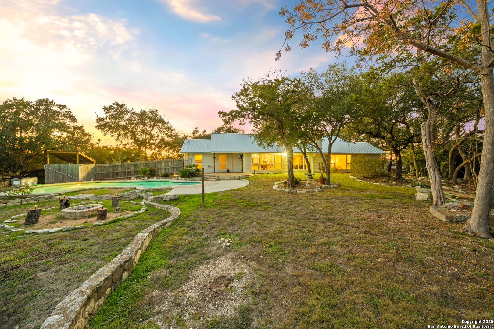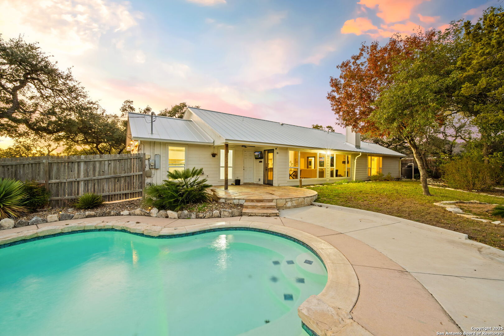 Medal Roof is ONE YEAR OLD! Tucked away on a private .68-acre lot in Bulverde Hills, this inviting home offers a perfect blend of Hill Country charm and modern comfort. Surrounded by mature trees, the property feels secluded and peaceful with one of the biggest residential pools I have seen yet, while still being conveniently located to downtown Bulverde. Inside, hardwood floors throughout add warmth and timeless appeal, complementing the home's bright and airy feel. Abundant windows provide great natural lighting and showcase beautiful views of the backyard, creating a seamless connection between indoor and outdoor living. The kitchen is a standout, featuring a farmhouse sink, a stylish stone backsplash, gas cooking, barn door, white cabinets with hardware, all thoughtful details that make it both functional and visually appealing-ideal for everyday living and entertaining. The living area centers around a warm stone fireplace, adding a cozy focal point to the home. A versatile bonus room off the Kitchen provides flexible space for a home office, media room, playroom, or guest retreat. The primary suite is a private retreat, featuring views of the pool and backyard, his-and-her closets, and a spacious bathroom with walk-in shower and a double vanity. The guest bathroom has been refreshed with an updated vanity and stylish shiplap accent wall, offering a clean, modern touch. With its generous lot, privacy, and quality upgrades, this Bulverde home offers an exceptional opportunity to enjoy refined Hill Country living.