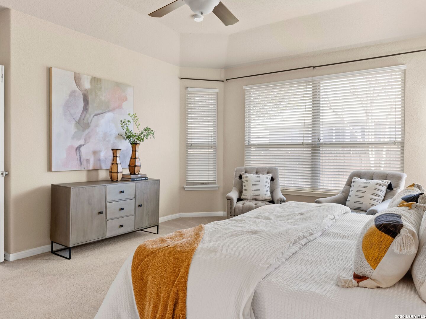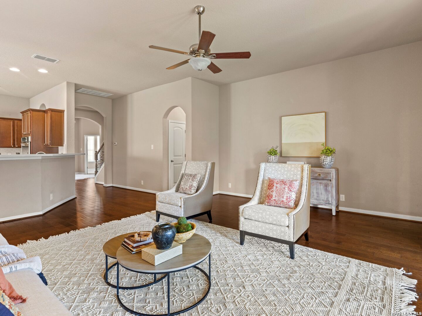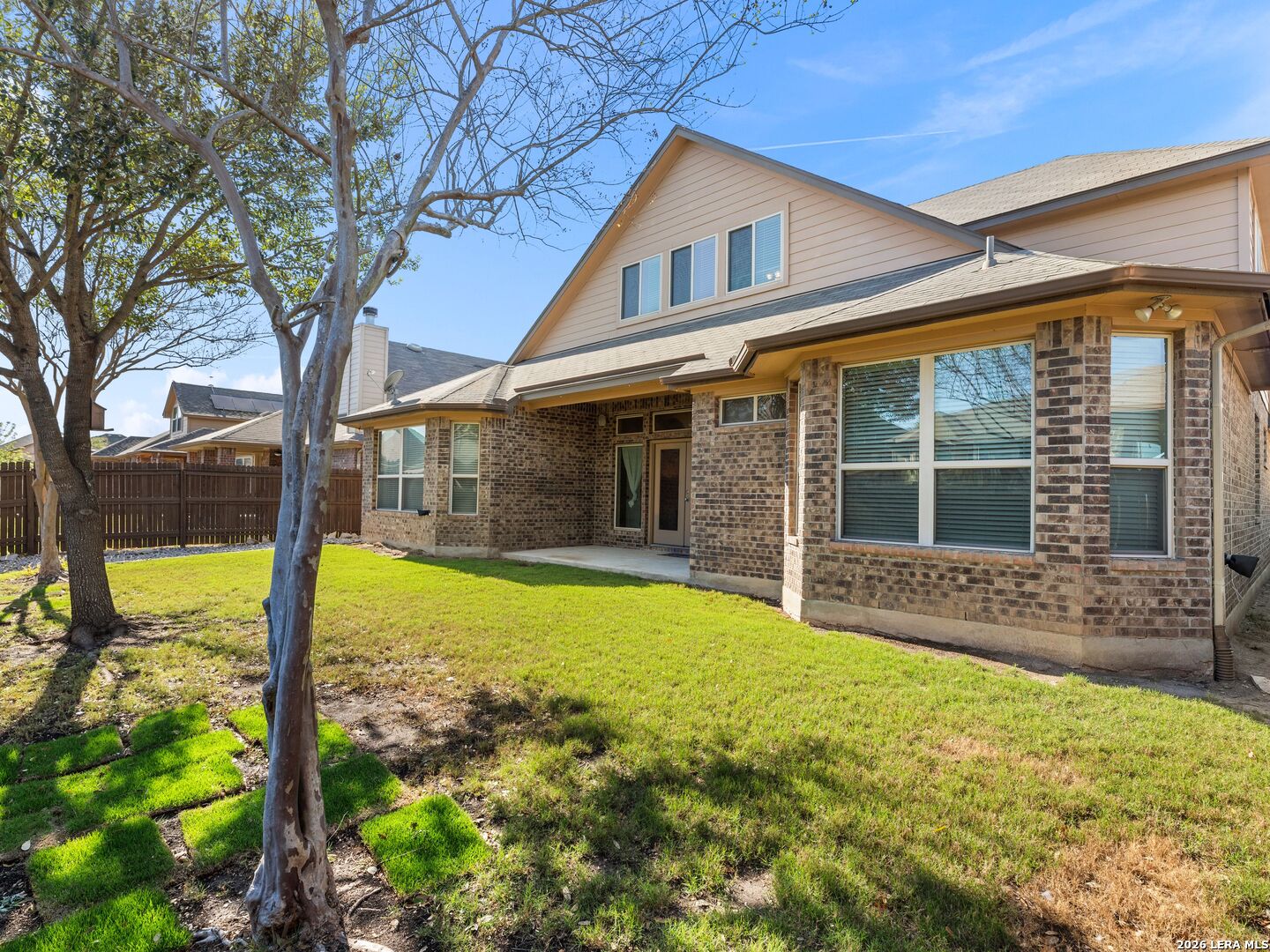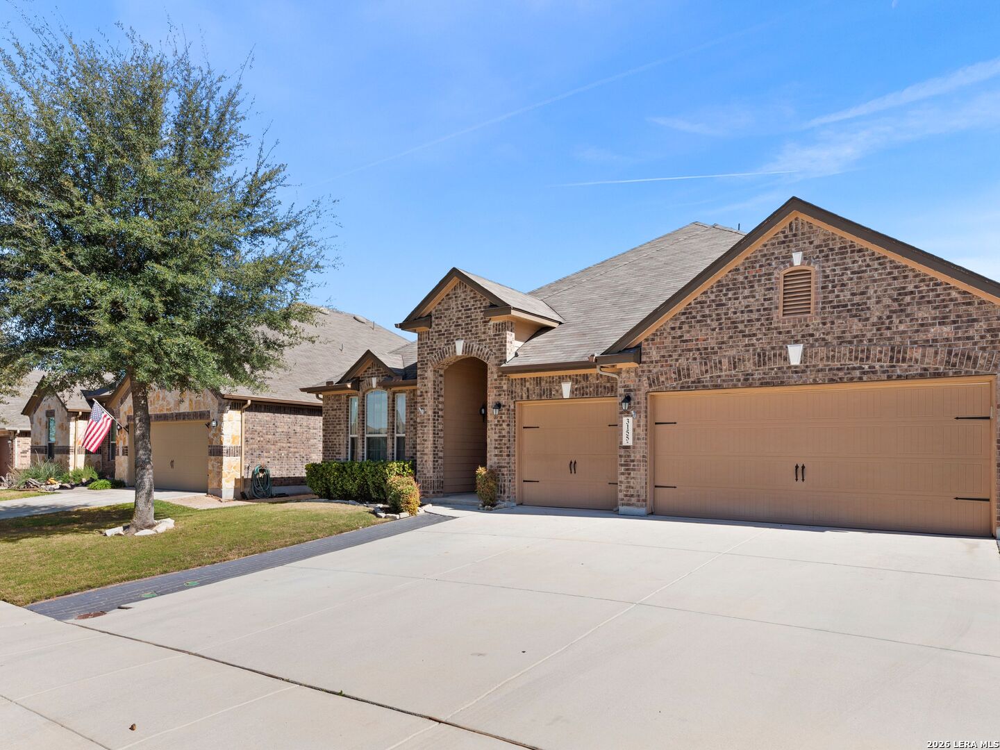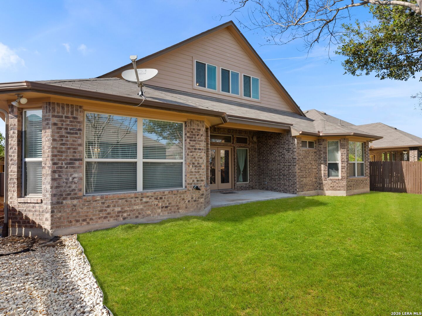 Tucked within a quiet cul-de-sac in the heart of burgeoning New Braunfels and the well appointed Highland Grove subdivsion, 3155 Sunset Cove presents a refined blend of elegance, comfort, and thoughtful design-just minutes from premier shopping, elevated dining, top-rated Comal ISD schools, and the charm of historic downtown. From the moment you arrive, mature trees, manicured landscaping, and a beautifully crafted paver walkway create a warm and inviting introduction. Inside, soaring tray ceilings and graceful architectural details set the tone, while arched windows along the living space frame serene backyard views and fill the home with natural light. Spanning 3,179 square feet, the home offers a seamless open-concept layout designed for both everyday living and sophisticated entertaining. The kitchen is well-appointed with stone countertops and stainless steel appliances, flowing effortlessly into the main living area and a spacious breakfast nook. A formal dining room and private office provide additional versatility and refinement. The thoughtfully designed floor plan offers multiple living spaces, including an expansive upstairs retreat complete with a private bedroom and full bath-ideal for guests or multi-generational living. Additional bedrooms on the main level are tucked away to ensure privacy and comfort. Outdoors, a covered patio overlooks a lush, meticulously maintained backyard, creating a peaceful setting for relaxation. A three-car garage and generous attic storage provide excellent convenience and functionality. The property sits just a minute's walk from the community playground and pool. Built in 2014 on a 7,405-square-foot lot, this home is as efficient as it is beautiful, featuring paid-off solar panels, permanent customizable exterior lighting, and consistently maintained HVAC, lawn care, and pest control systems. This residence offers a rare opportunity to enjoy a tranquil setting with close proximity to IH-35 for easy commutes and all that New Braunfels has to offer. Schedule your private tour today!