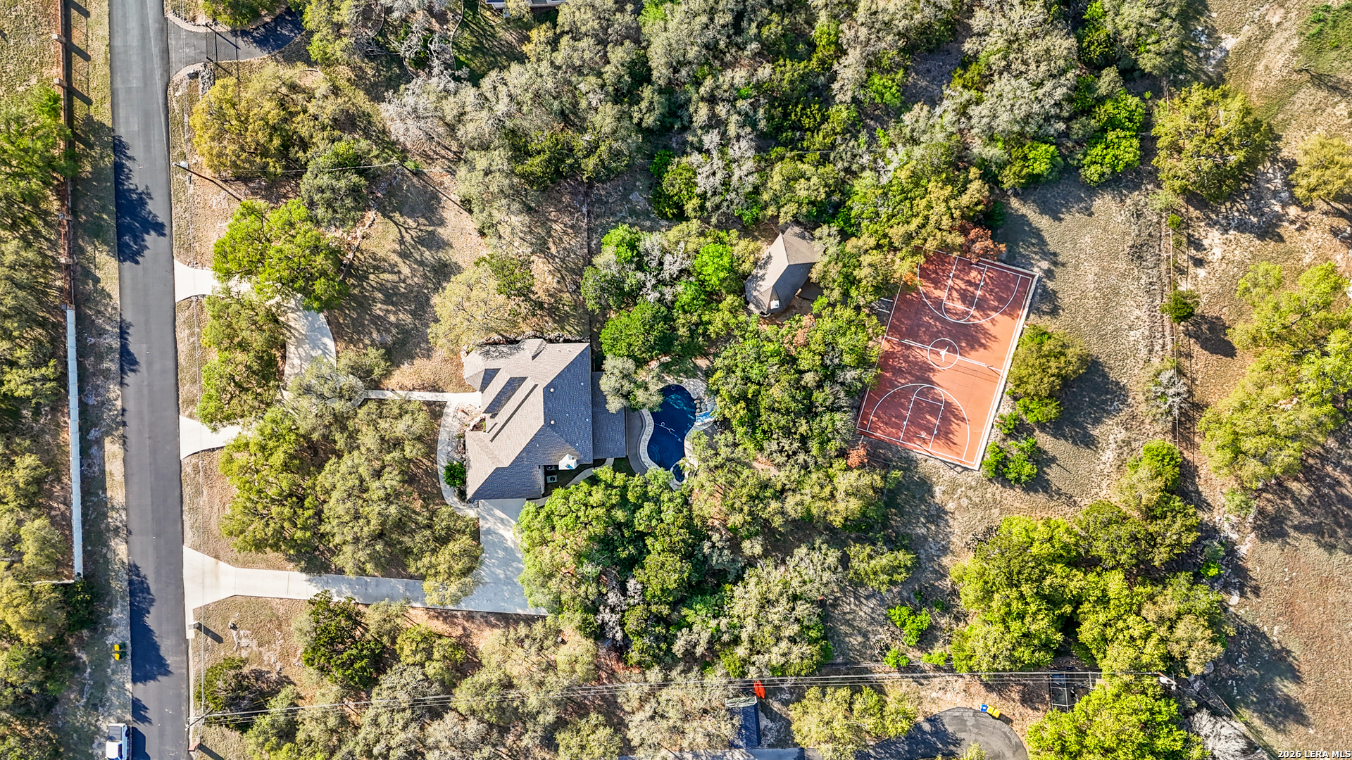 Experience the perfect blend of luxury, privacy, and resort-style living in this exceptional staycation retreat in Fair Oaks Ranch and acclaimed Boerne ISD. Nestled on 1.79 tree-filled acres, this park-like property offers the space, features, and lifestyle today's families are actively searching for. Step outside to your own private oasis featuring a lighted custom Keith Zars pool with waterfall and slide, an up lit full sports court setup for basketball and volleyball for nighttime play, and fully enclosed yard with a beautiful wrought iron fence in the front and a ranch style fence in sides and back. Entertain effortlessly in the separate outdoor cabana complete with outdoor dining, wood burning fireplace, gas grill, sink, and a full bathroom-ideal for gatherings, parties, or relaxing evenings at home. The home's inviting curb appeal includes a semicircle driveway leading to the front entrance, plus an expanded side driveway to the garage with extra space for a future workshop, guest house, or additional outbuilding. Inside, the open-concept floor plan is designed for both everyday living and entertaining, offering two spacious living areas, a formal dining room, and a bright eat-in kitchen. The family room showcases a stunning fireplace with built-in bookshelves and a versatile mounted TV system for optimal viewing. The gourmet kitchen is a chef's dream, featuring custom solid wood cabinetry, granite countertops, and premium Wolf appliances. Upstairs, a flexible bonus space provides endless possibilities-use it as a media room, home office, or additional bedroom to suit your needs. Hardwood flooring flows throughout the main level, while new carpet enhances the stairs and media room. Updated designer lighting adds a modern, elegant touch throughout the home. Additional highlights include a recently replaced roof with wind-resistant shingles, high-speed fiber internet (perfect for remote work), and convenient community services such as bulk item pickup. Enjoy optional membership at Fair Oaks Ranch Golf & Country Club that can be purchased, offering premier golf, dining, and social amenities. San Antonio and The Rim shopping center is a convenient 20 minute drive. Rarely does a property combine acreage, luxury upgrades, and resort-style amenities in such a sought-after location. Don't miss this incredible opportunity to own a private retreat that truly has it all.