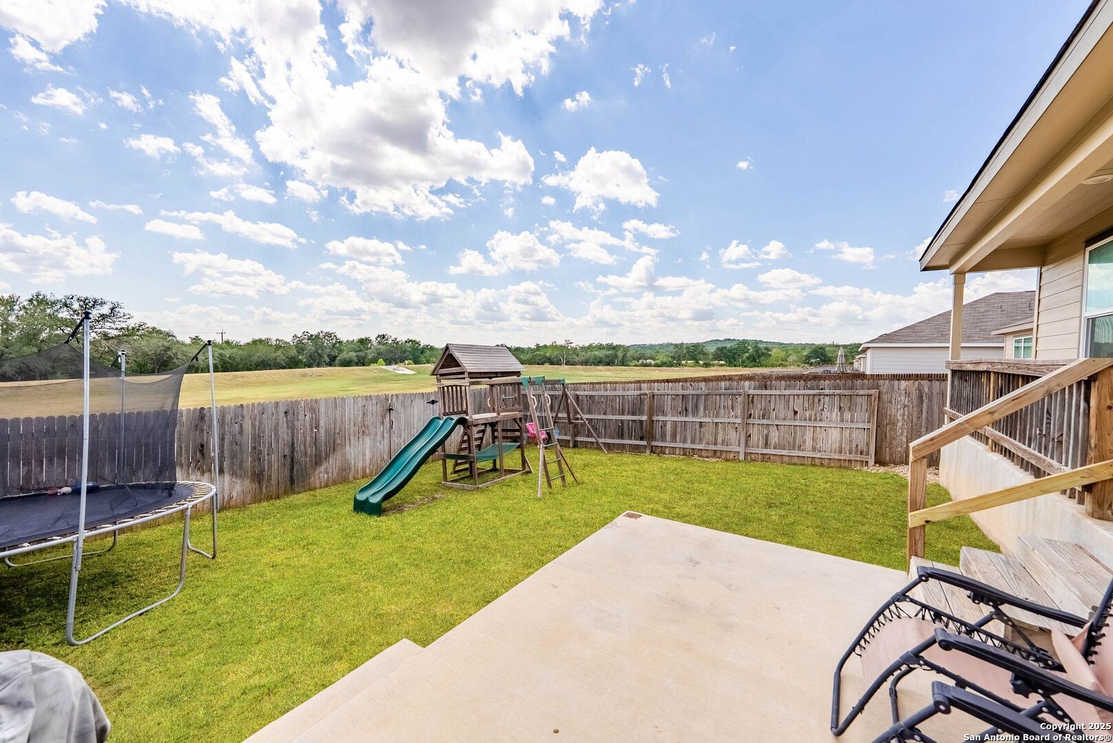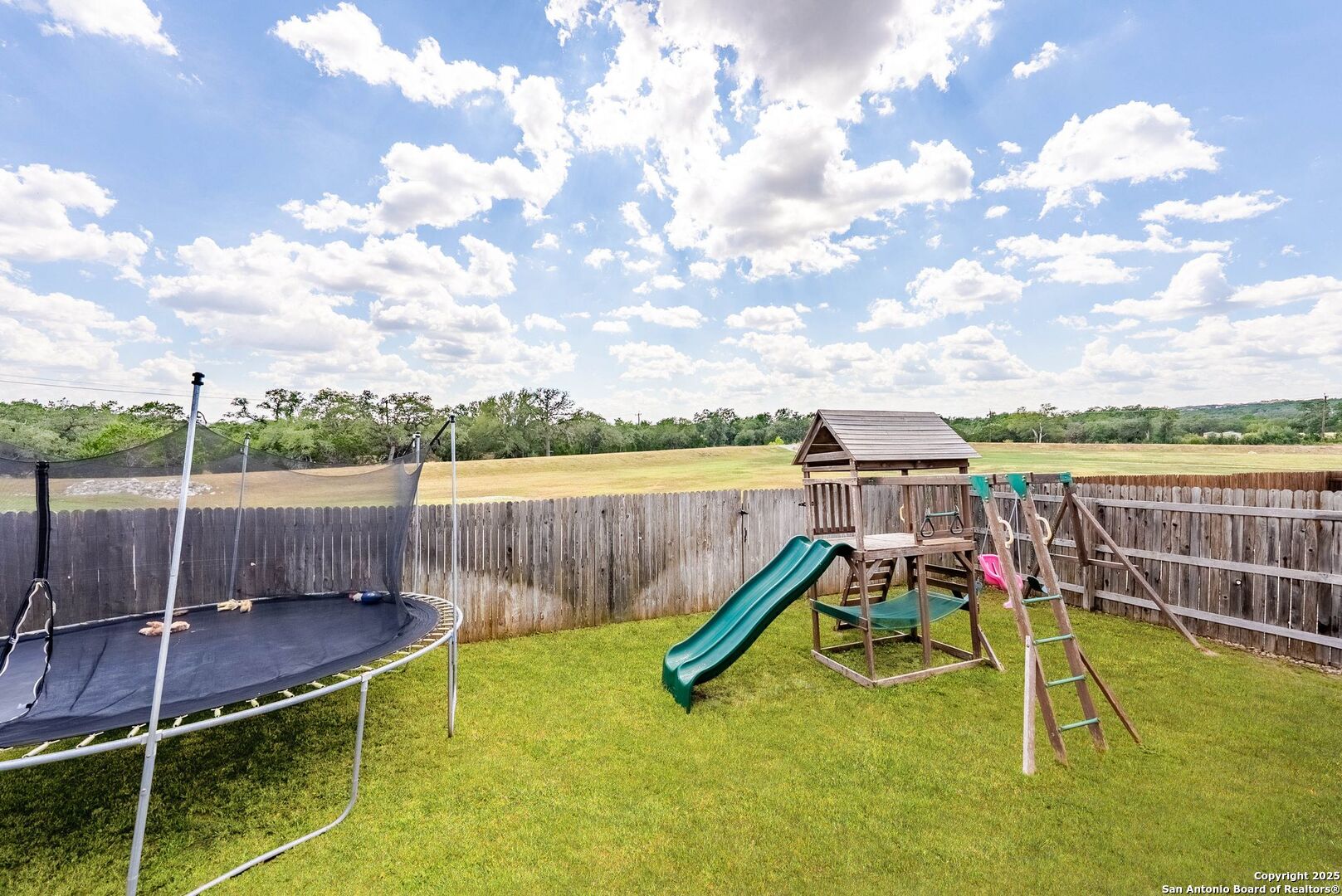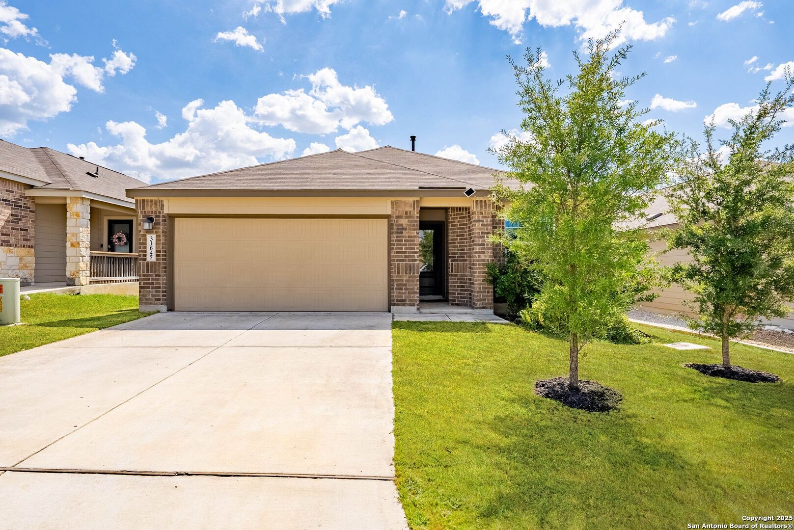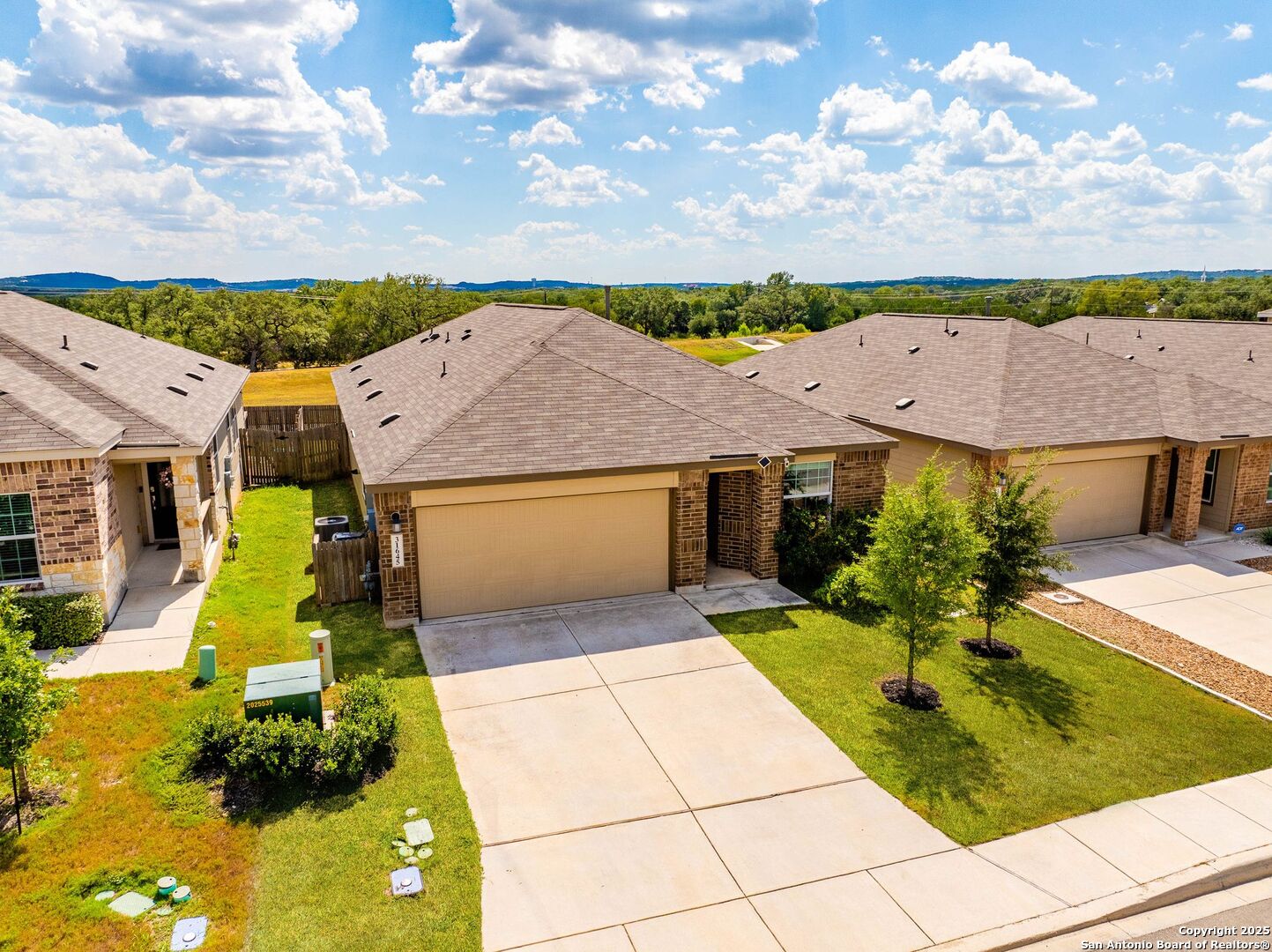 SPECIAL LENDER INCENTIVE AVAILABLE! The lender is offering up to 1% toward the buyer's closing costs, and the seller may also contribute with an acceptable offer. Welcome Home! This charming brick home with a two-car garage offers a thoughtfully designed open floorplan that flows seamlessly from room to room. With four bedrooms, there is space for everyone-whether you need a cozy guest room, a home office with fiber optic high-speed internet, or extra space for hobbies. The front bedroom features a beautiful built-in closet, making it both stylish and functional. At the heart of the home is the spacious kitchen, perfectly designed for entertaining and everyday living. It features granite countertops, a pantry, abundant cabinets, and a central island that makes both meal preparation and gathering a joy. The kitchen opens directly into the living and dining spaces, creating a warm and inviting atmosphere. Energy-efficient appliances are included, and the washer, dryer, and refrigerator are negotiable. From the living area, step outside to a covered patio with an upgraded 12x20 cement slab, ideal for backyard barbecues or peaceful evenings at home. The level lot backs to a greenbelt and includes a private gate for direct access, offering both beauty and privacy. A full sprinkler system makes yard maintenance easy and keeps your lawn looking its best year-round. The primary suite is located at the back of the home for added tranquility and features a spa-like bathroom with a double vanity, an oversized walk-in shower, and a generous walk-in closet. Additional touches such as blinds, a water softener, a programmable thermostat, a Ring camera, and a fully decked attic for additional storage make this home as functional as it is beautiful. Living here means more than just a home-it means enjoying the resort-style lifestyle of the highly desirable Hidden Trails community, served by top-rated Comal ISD schools. Residents can relax at the infinity pool, swim laps in the Junior Olympic-sized pool, or let little ones splash in the children's play area. The neighborhood also offers a modern clubhouse, a 24/7 fitness center, yoga classes, and miles of scenic walking and biking trails. Families will love the multiple playgrounds, including one with a zip line, while others can enjoy basketball courts, barbecue areas, community events with live music and food trucks, and even a catch-and-release fishing pond. Hidden Trails is also perfectly located just off Highway 281, placing you minutes from HEB, Walmart, Starbucks, restaurants, and medical facilities. The San Antonio Airport is only 30 minutes away, while the beautiful Canyon Lake is just a 20-minute drive. This home truly offers flow, comfort, and a lifestyle you will love. Don't wait-schedule your private showing today and see for yourself why this is the perfect place for your home.