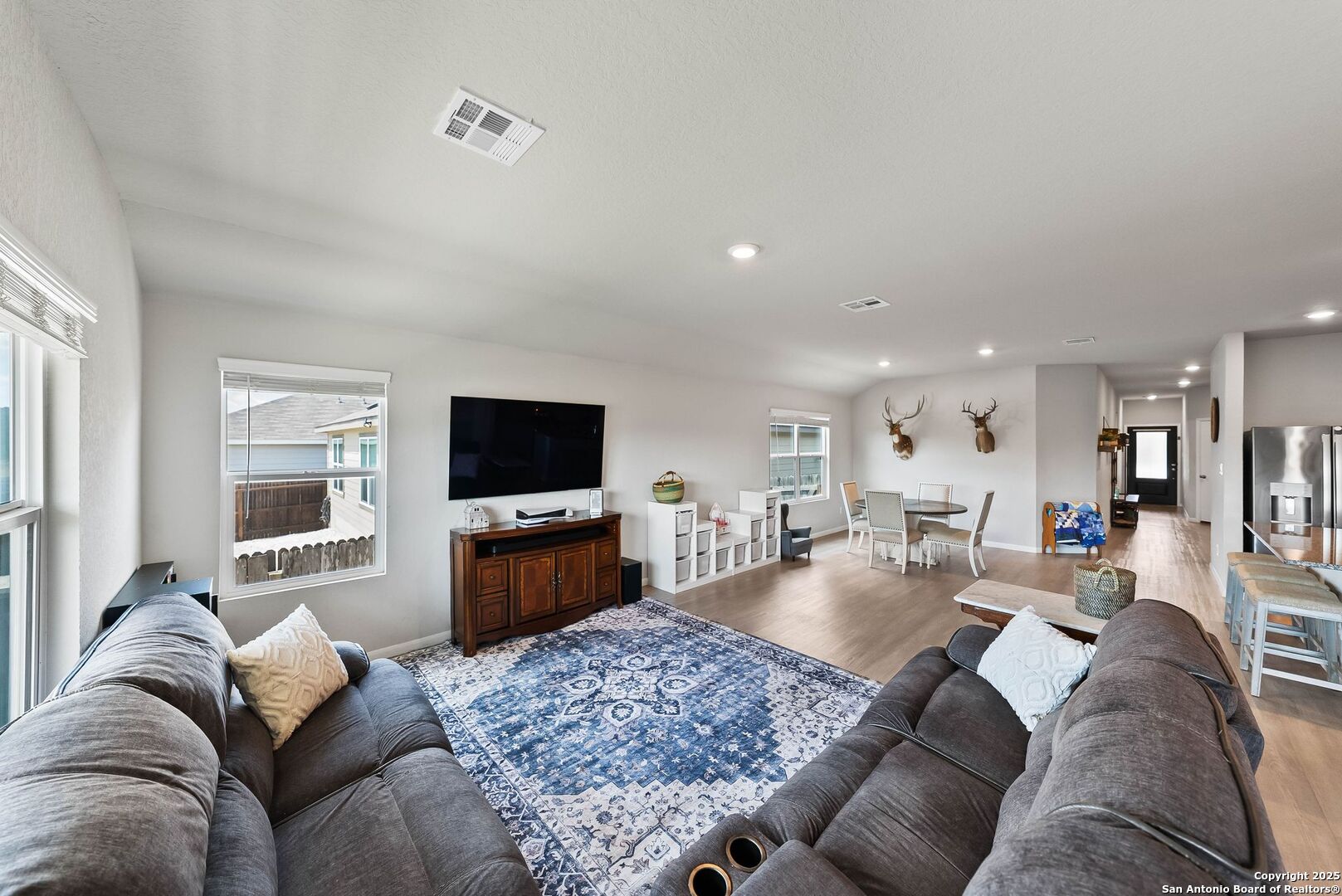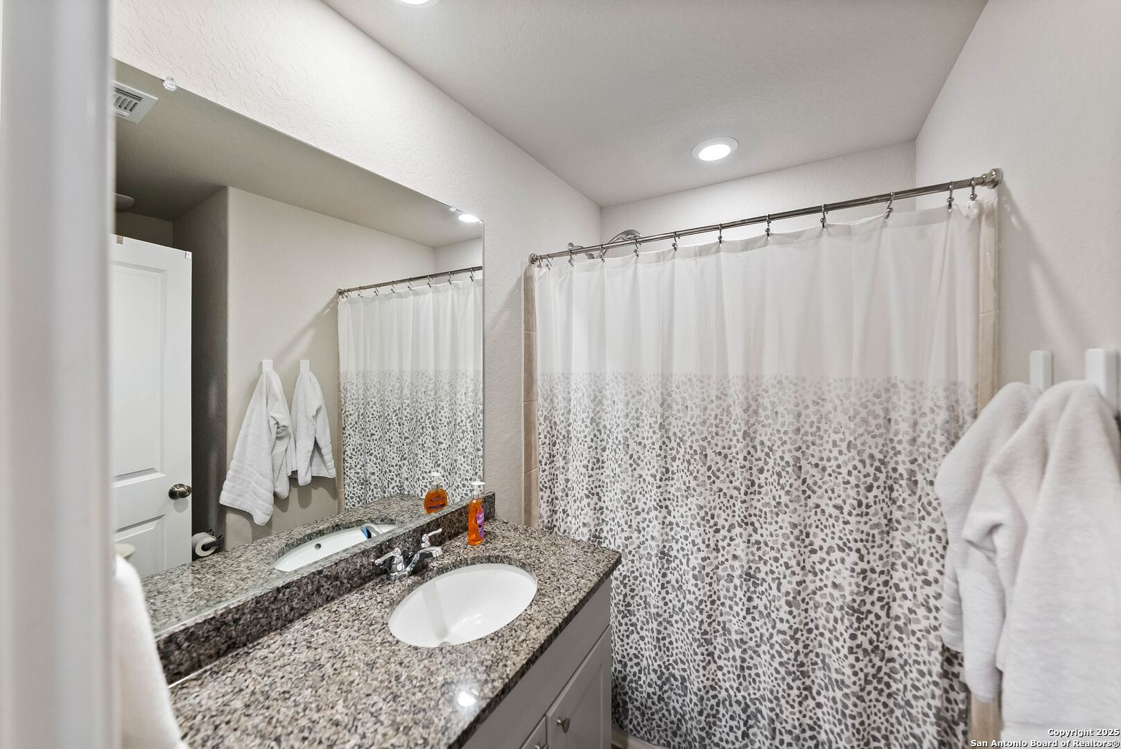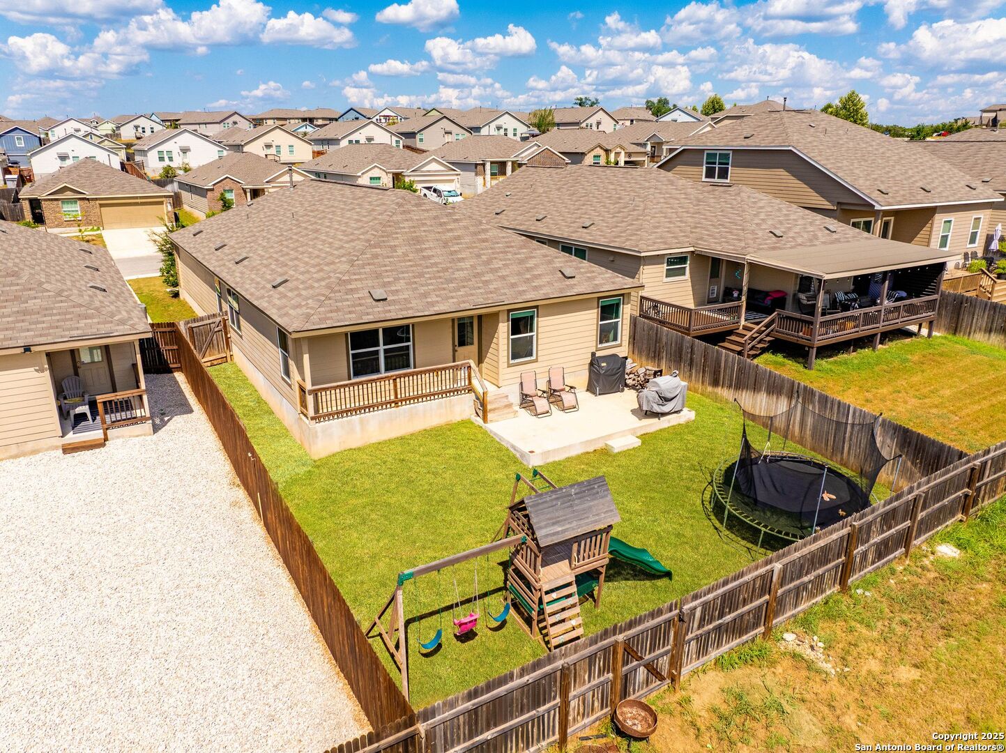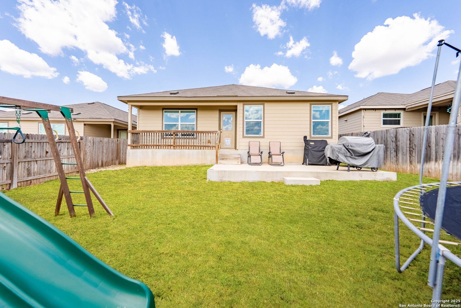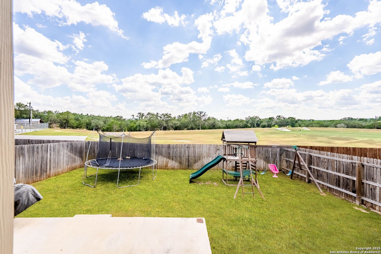 SPECIAL LENDER INCENTIVE AVAILABLE! The lender is offering up to 1% toward the buyer's closing costs, and the seller may also contribute with an acceptable offer. Welcome Home! This charming brick home with a two-car garage offers a thoughtfully designed open floorplan that flows seamlessly from room to room. With four bedrooms, there is space for everyone-whether you need a cozy guest room, a home office with fiber optic high-speed internet, or extra space for hobbies. The front bedroom features a beautiful built-in closet, making it both stylish and functional. At the heart of the home is the spacious kitchen, perfectly designed for entertaining and everyday living. It features granite countertops, a pantry, abundant cabinets, and a central island that makes both meal preparation and gathering a joy. The kitchen opens directly into the living and dining spaces, creating a warm and inviting atmosphere. Energy-efficient appliances are included, and the washer, dryer, and refrigerator are negotiable. From the living area, step outside to a covered patio with an upgraded 12x20 cement slab, ideal for backyard barbecues or peaceful evenings at home. The level lot backs to a greenbelt and includes a private gate for direct access, offering both beauty and privacy. A full sprinkler system makes yard maintenance easy and keeps your lawn looking its best year-round. The primary suite is located at the back of the home for added tranquility and features a spa-like bathroom with a double vanity, an oversized walk-in shower, and a generous walk-in closet. Additional touches such as blinds, a water softener, a programmable thermostat, a Ring camera, and a fully decked attic for additional storage make this home as functional as it is beautiful. Living here means more than just a home-it means enjoying the resort-style lifestyle of the highly desirable Hidden Trails community, served by top-rated Comal ISD schools. Residents can relax at the infinity pool, swim laps in the Junior Olympic-sized pool, or let little ones splash in the children's play area. The neighborhood also offers a modern clubhouse, a 24/7 fitness center, yoga classes, and miles of scenic walking and biking trails. Families will love the multiple playgrounds, including one with a zip line, while others can enjoy basketball courts, barbecue areas, community events with live music and food trucks, and even a catch-and-release fishing pond. Hidden Trails is also perfectly located just off Highway 281, placing you minutes from HEB, Walmart, Starbucks, restaurants, and medical facilities. The San Antonio Airport is only 30 minutes away, while the beautiful Canyon Lake is just a 20-minute drive. This home truly offers flow, comfort, and a lifestyle you will love. Don't wait-schedule your private showing today and see for yourself why this is the perfect place for your home.