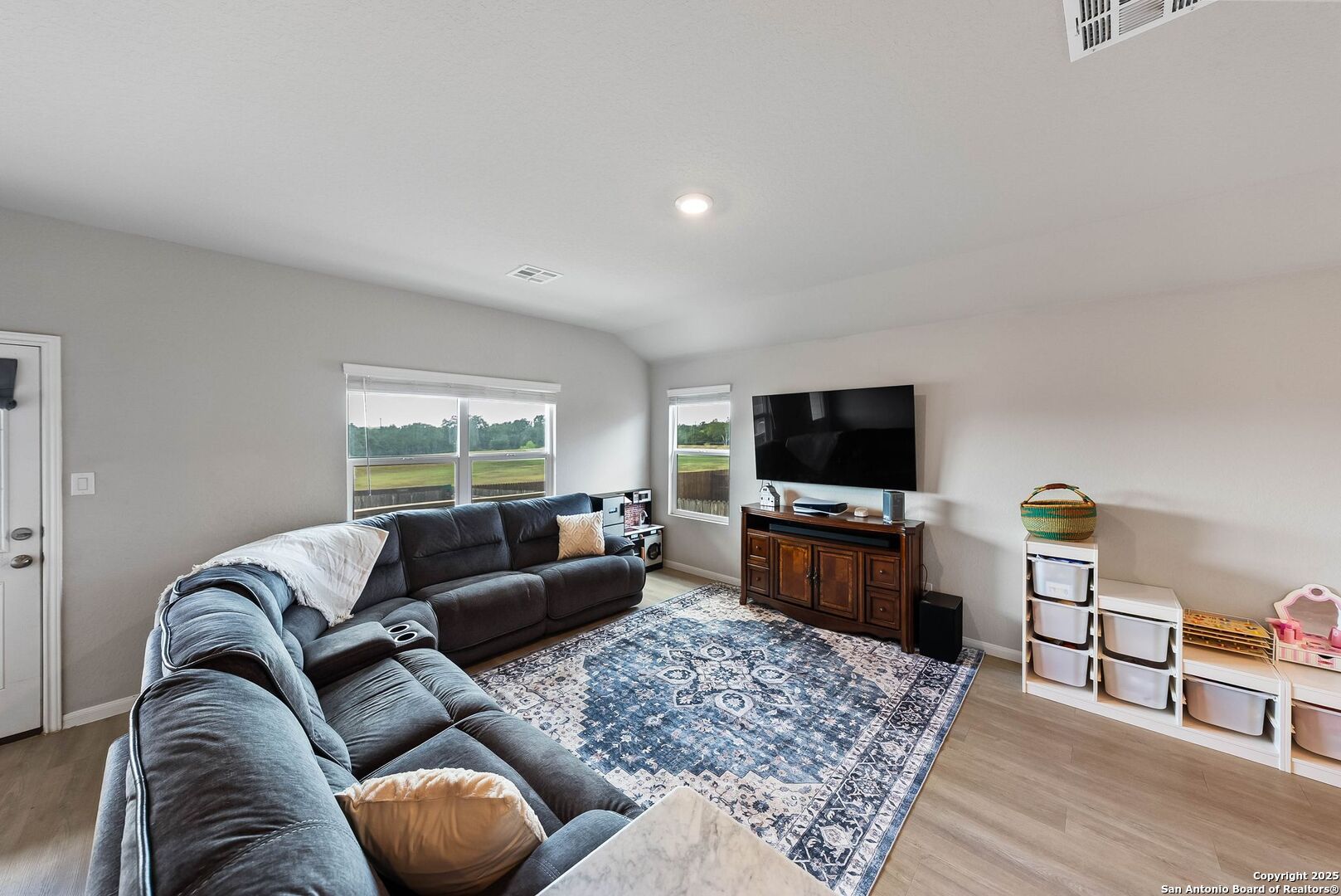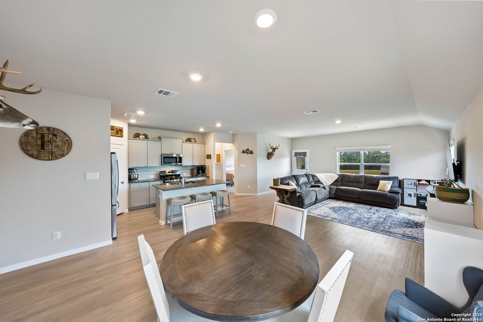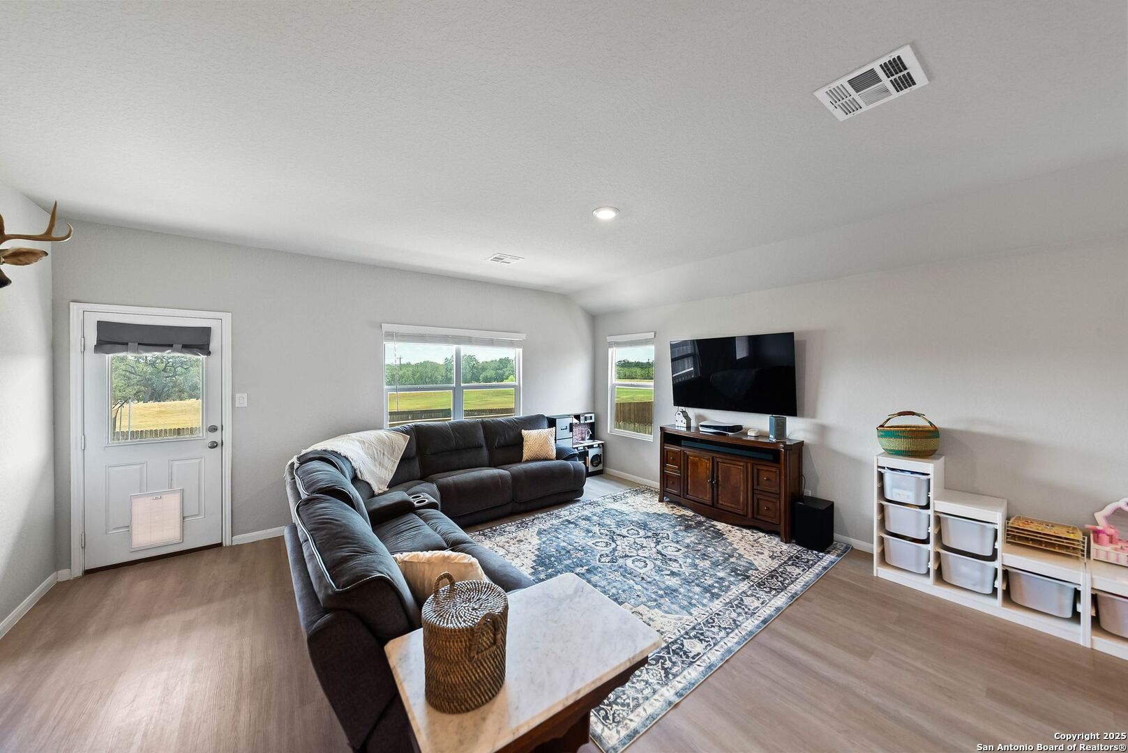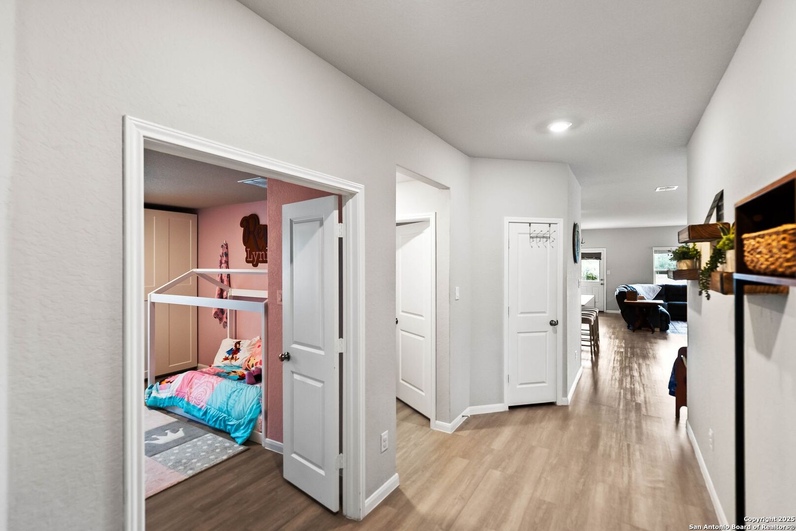 SPECIAL LENDER INCENTIVE AVAILABLE! The lender is offering up to 1% toward the buyer's closing costs, and the seller may also contribute with an acceptable offer. Welcome Home! This charming brick home with a two-car garage offers a thoughtfully designed open floorplan that flows seamlessly from room to room. With four bedrooms, there is space for everyone-whether you need a cozy guest room, a home office with fiber optic high-speed internet, or extra space for hobbies. The front bedroom features a beautiful built-in closet, making it both stylish and functional. At the heart of the home is the spacious kitchen, perfectly designed for entertaining and everyday living. It features granite countertops, a pantry, abundant cabinets, and a central island that makes both meal preparation and gathering a joy. The kitchen opens directly into the living and dining spaces, creating a warm and inviting atmosphere. Energy-efficient appliances are included, and the washer, dryer, and refrigerator are negotiable. From the living area, step outside to a covered patio with an upgraded 12x20 cement slab, ideal for backyard barbecues or peaceful evenings at home. The level lot backs to a greenbelt and includes a private gate for direct access, offering both beauty and privacy. A full sprinkler system makes yard maintenance easy and keeps your lawn looking its best year-round. The primary suite is located at the back of the home for added tranquility and features a spa-like bathroom with a double vanity, an oversized walk-in shower, and a generous walk-in closet. Additional touches such as blinds, a water softener, a programmable thermostat, a Ring camera, and a fully decked attic for additional storage make this home as functional as it is beautiful. Living here means more than just a home-it means enjoying the resort-style lifestyle of the highly desirable Hidden Trails community, served by top-rated Comal ISD schools. Residents can relax at the infinity pool, swim laps in the Junior Olympic-sized pool, or let little ones splash in the children's play area. The neighborhood also offers a modern clubhouse, a 24/7 fitness center, yoga classes, and miles of scenic walking and biking trails. Families will love the multiple playgrounds, including one with a zip line, while others can enjoy basketball courts, barbecue areas, community events with live music and food trucks, and even a catch-and-release fishing pond. Hidden Trails is also perfectly located just off Highway 281, placing you minutes from HEB, Walmart, Starbucks, restaurants, and medical facilities. The San Antonio Airport is only 30 minutes away, while the beautiful Canyon Lake is just a 20-minute drive. This home truly offers flow, comfort, and a lifestyle you will love. Don't wait-schedule your private showing today and see for yourself why this is the perfect place for your home.