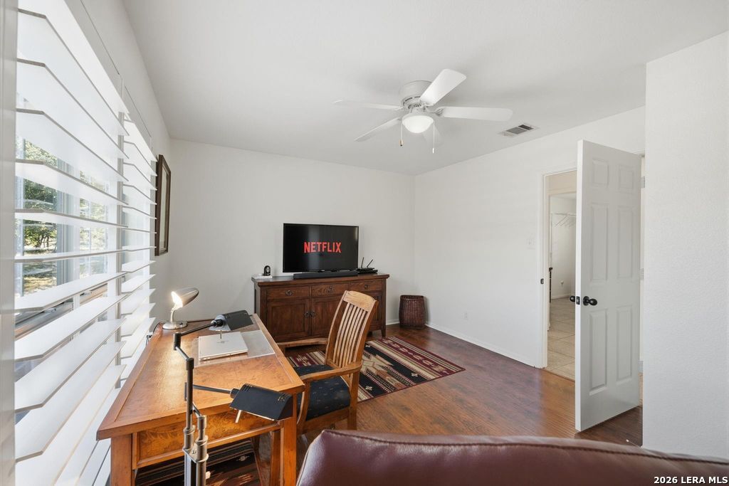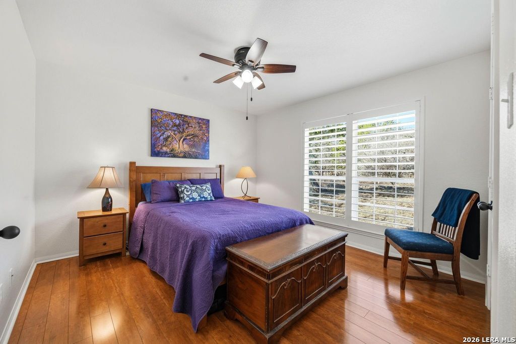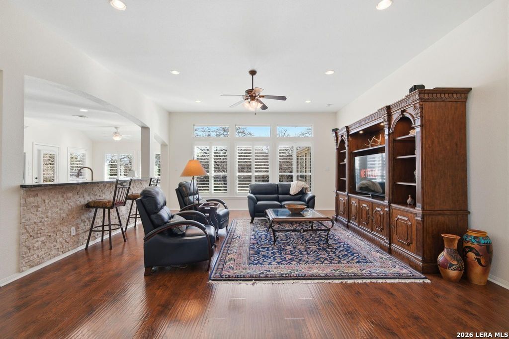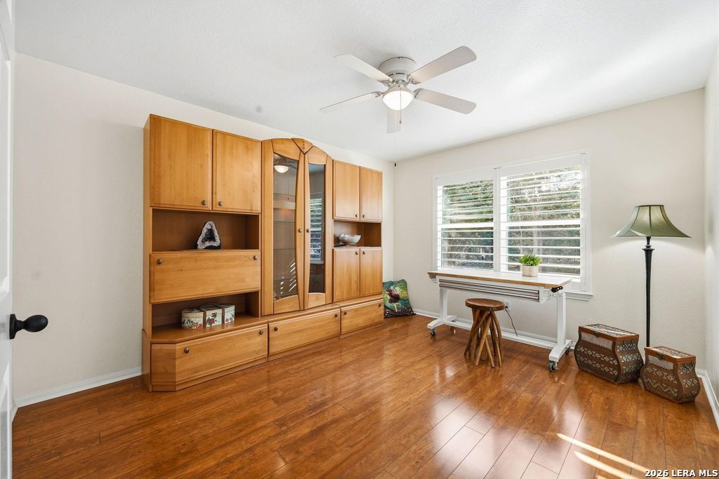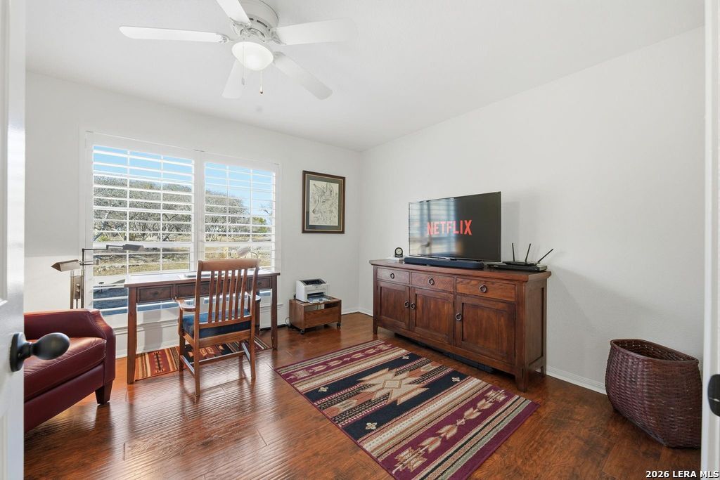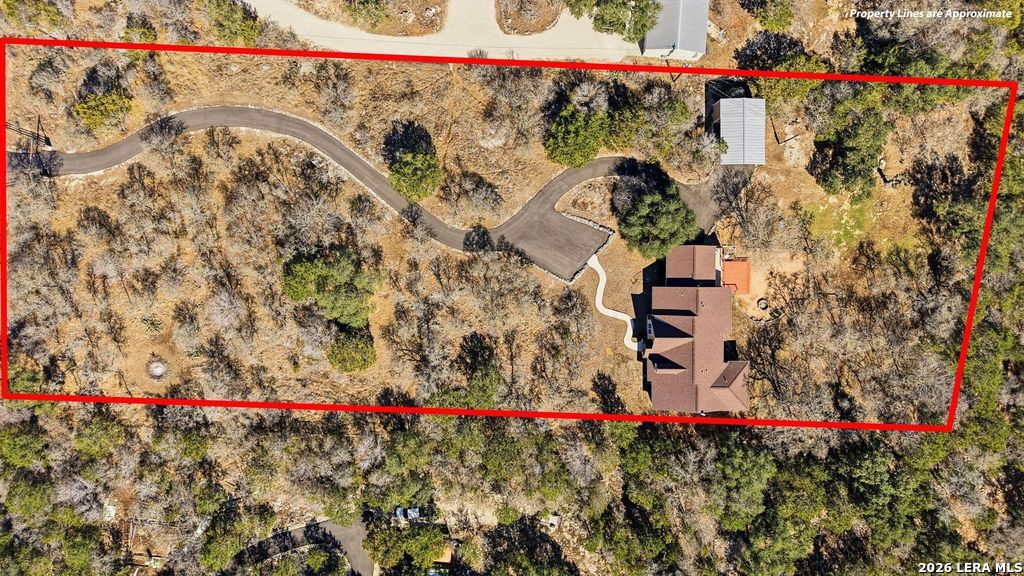 Experience peaceful Hill Country living in this beautifully maintained and thoughtfully remodeled 4-bedroom,2.5-bath, PLUS STUDY, one-story home on 3.4 scenic, tree-studded acres.Exceptional pride of ownership is evident throughout, with numerous quality upgrades, a light-filled open living area, and a chef-inspired kitchen featuring designer granite countertops, a large island, abundant cabinetry, and a spacious pantry-ideal for entertaining and everyday living. The flexible floorplan includes a private primary suite with double vanities, a beautifully updated walk-in shower, and a relaxing garden tub, creating a spa-like retreat.Laminate wood flooring and ceramic tile throughout-no carpet. A 2-car attached garage,10x24 shop, 24x32 carport,and ample guest parking offer excellent functionality. Enjoy peaceful mornings, beautiful sunsets, and frequent wildlife sightings, plus access to three private River Mountain Ranch parks with Guadalupe River access for relaxing,fishing, and outdoor enjoyment.