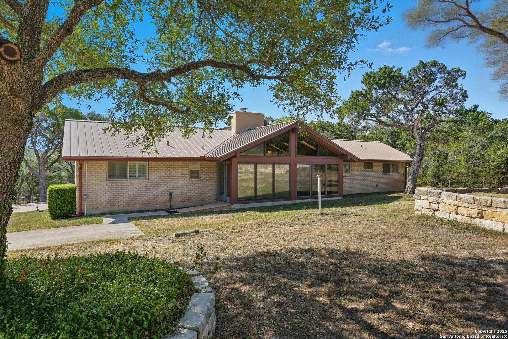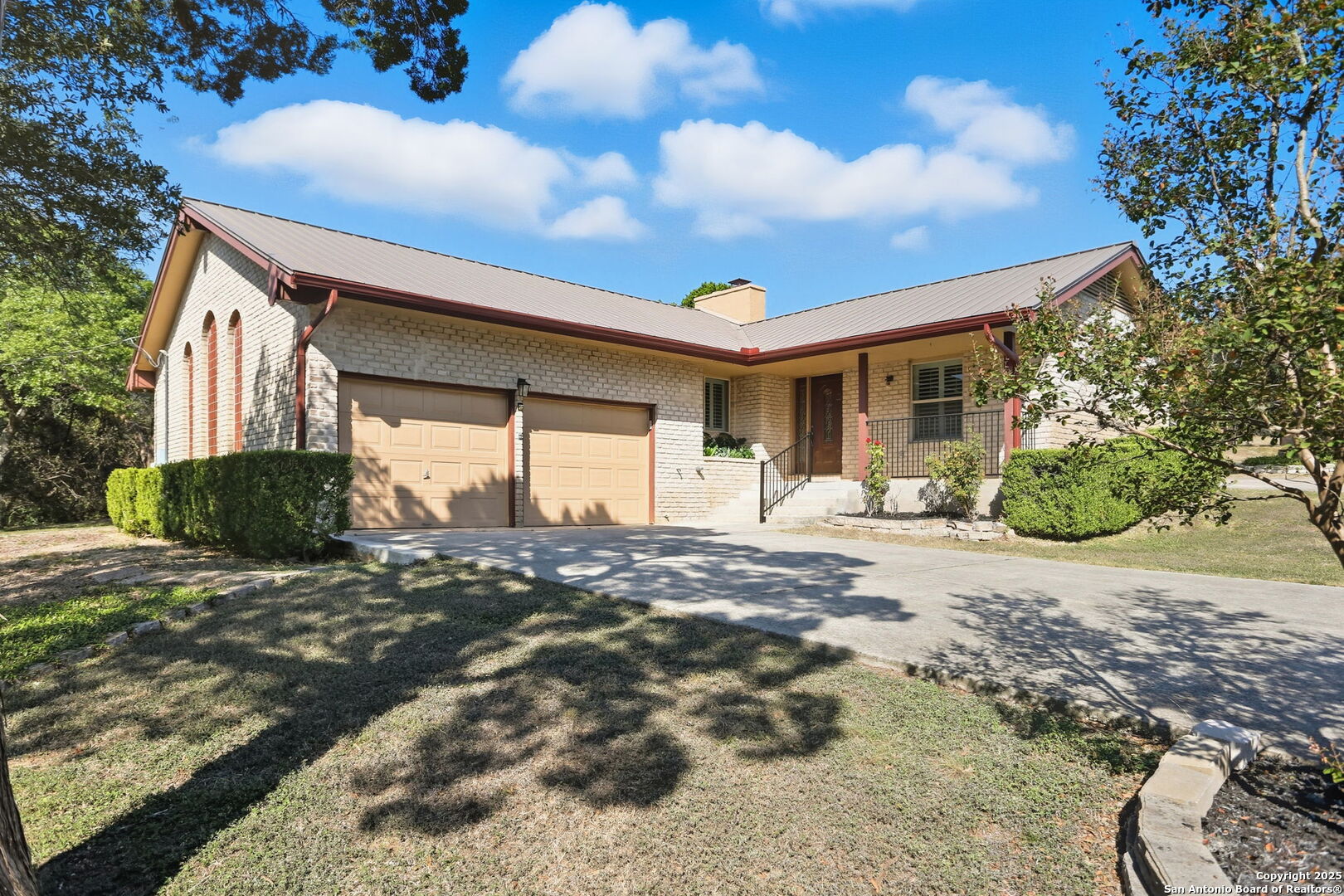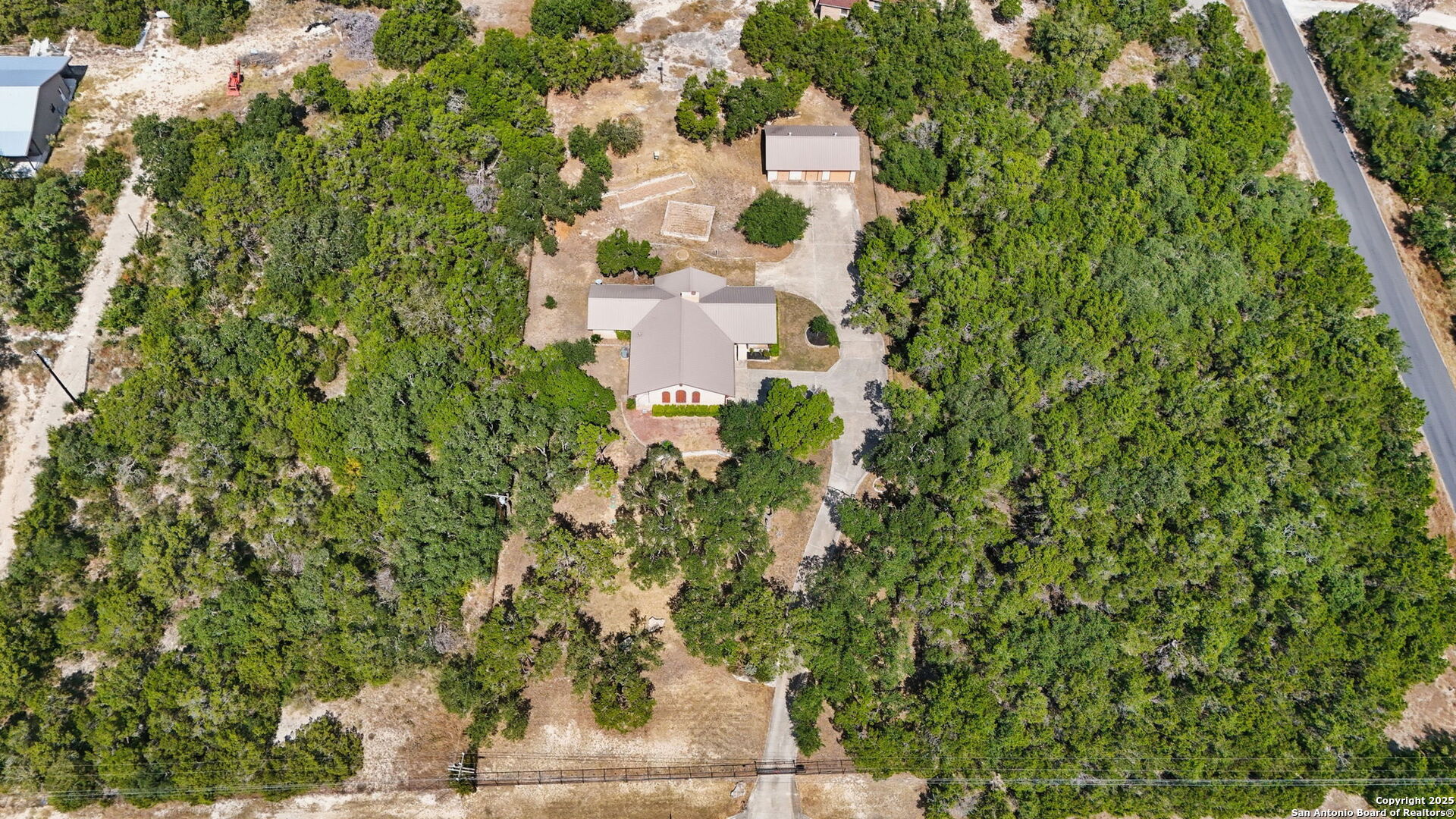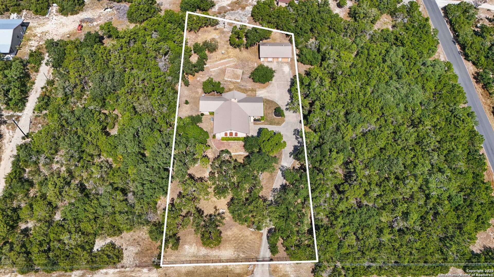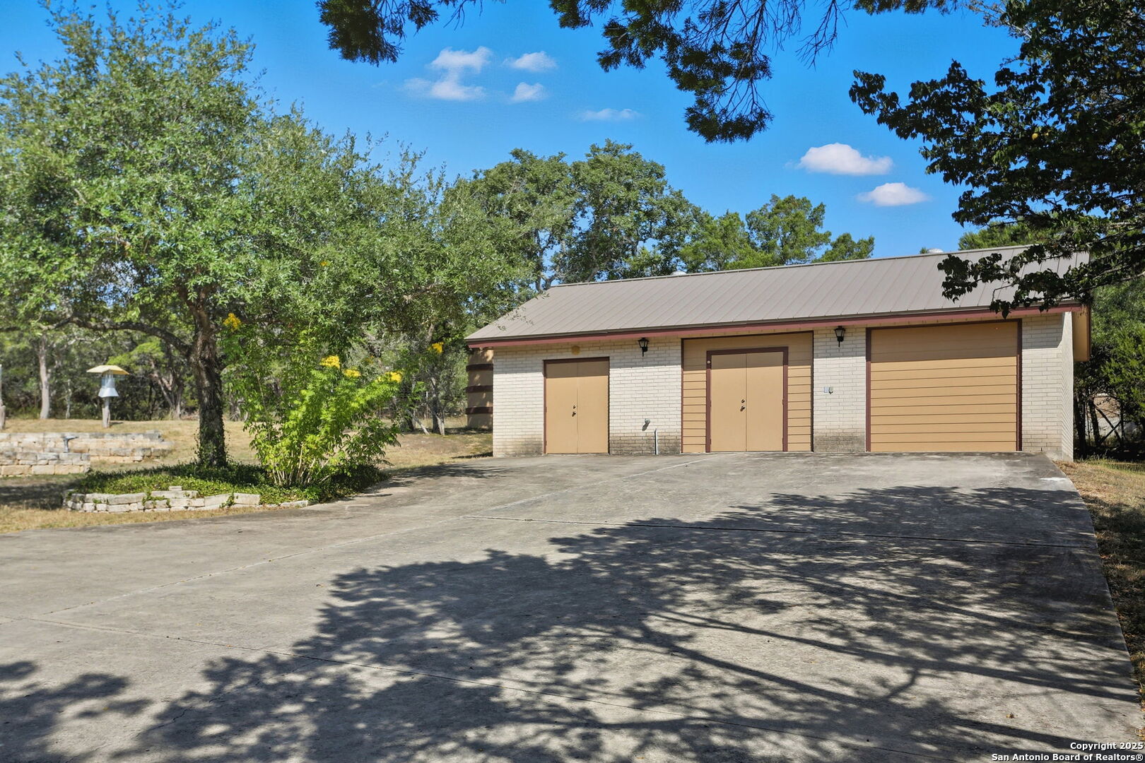 Secluded Hill-Country retreat offering peaceful living void of neighbors on either side, minutes from shopping, dining, and quick access to Hwy 281 or 46. This single-owner home offers a recently remodeled single-story, split floor plan layout. The enclosed back patio provides year-round comfort with full heating and cooling, surrounded by beautiful windows that fill the space with natural light and add 357 sq. ft. of inviting living area. Interior updates include ceramic tile in main areas, new carpet in bedrooms, and a remodeled kitchen featuring new LG appliances, soft-close cabinets, white cultured marble island, lovely backsplash, and Elfa pantry organizers. The living room features vaulted ceilings, large built-in cabinet, and a cozy wood-burning fireplace. The primary suite offers an updated bathroom, walk-in closet, walk-in shower & safety grab rails, while the secondary bedrooms and other full bath are located on the opposite side of the home for added privacy. A 975 sq. ft. detached garage & workshop provides space for vehicles, storage, or projects. Additional features include a security gate with keypad, a well (pump replaced approx. 5-10 years ago), water softener, and a metal roof (approx. 10 years old).