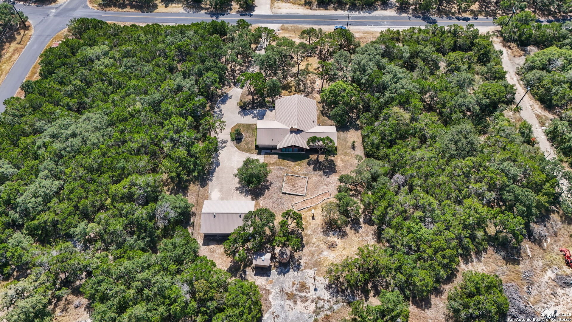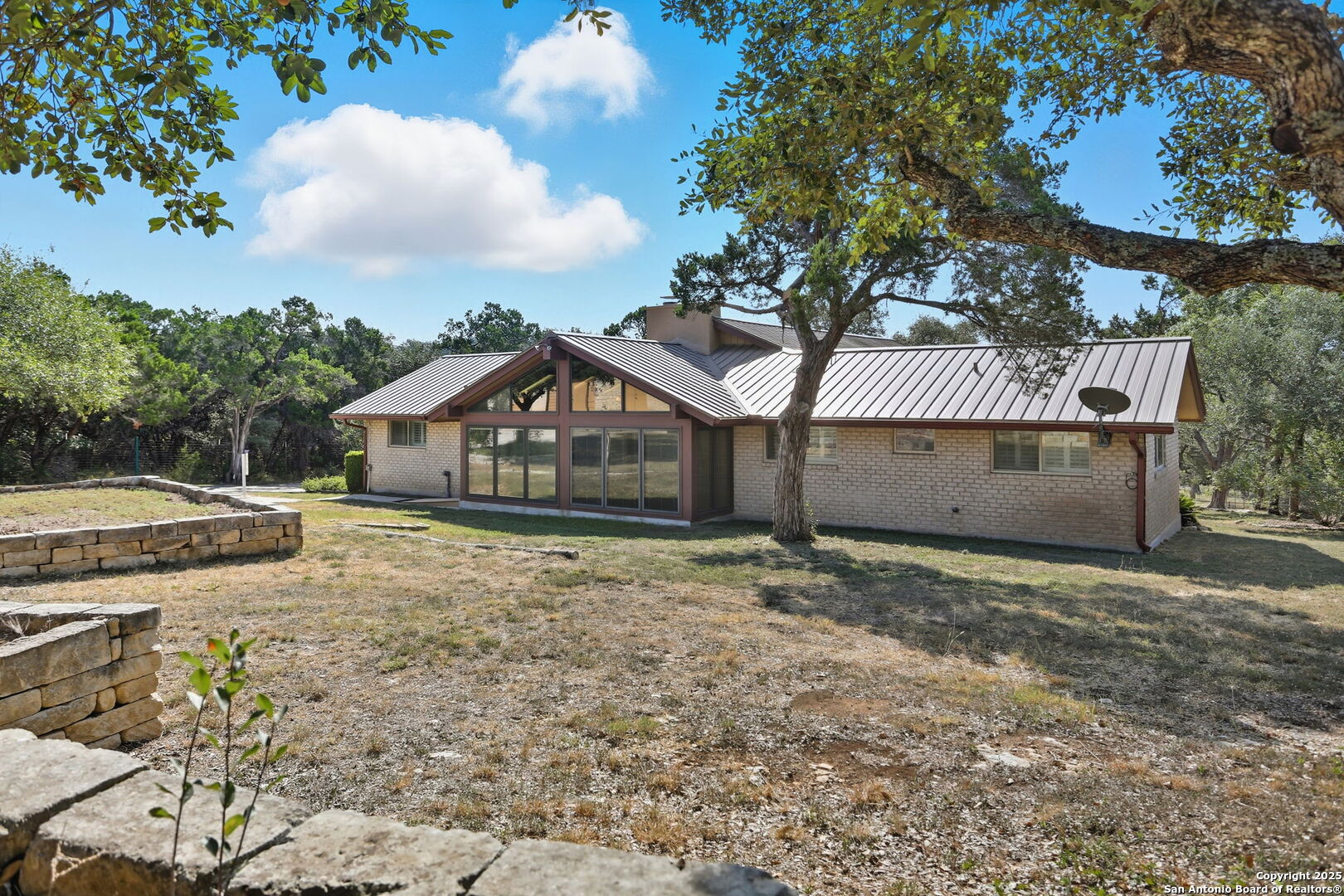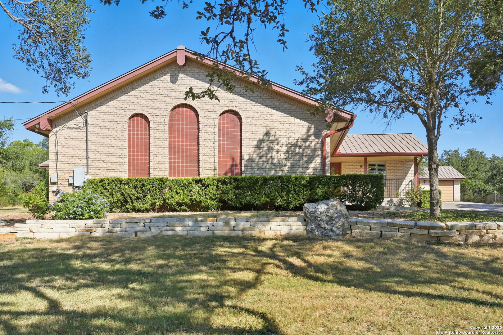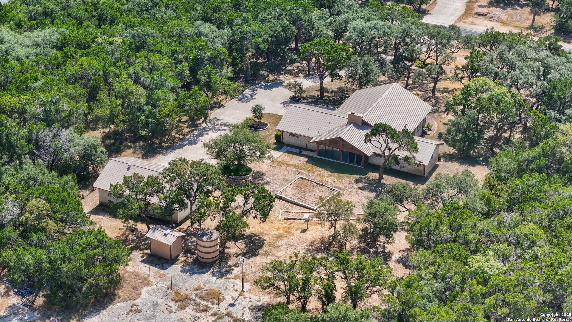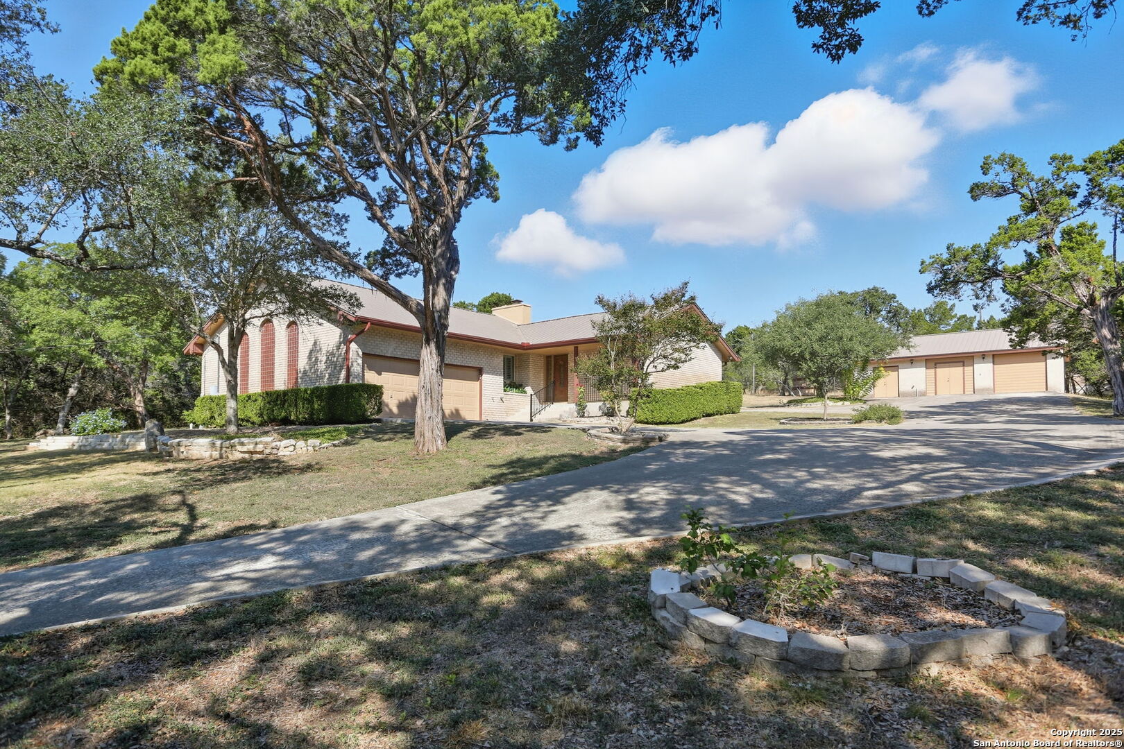 Secluded Hill-Country retreat offering peaceful living void of neighbors on either side, minutes from shopping, dining, and quick access to Hwy 281 or 46. This single-owner home offers a recently remodeled single-story, split floor plan layout. The enclosed back patio provides year-round comfort with full heating and cooling, surrounded by beautiful windows that fill the space with natural light and add 357 sq. ft. of inviting living area. Interior updates include ceramic tile in main areas, new carpet in bedrooms, and a remodeled kitchen featuring new LG appliances, soft-close cabinets, white cultured marble island, lovely backsplash, and Elfa pantry organizers. The living room features vaulted ceilings, large built-in cabinet, and a cozy wood-burning fireplace. The primary suite offers an updated bathroom, walk-in closet, walk-in shower & safety grab rails, while the secondary bedrooms and other full bath are located on the opposite side of the home for added privacy. A 975 sq. ft. detached garage & workshop provides space for vehicles, storage, or projects. Additional features include a security gate with keypad, a well (pump replaced approx. 5-10 years ago), water softener, and a metal roof (approx. 10 years old).