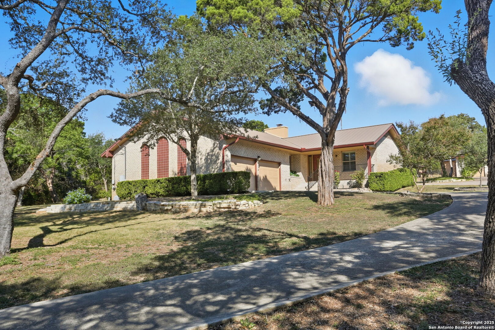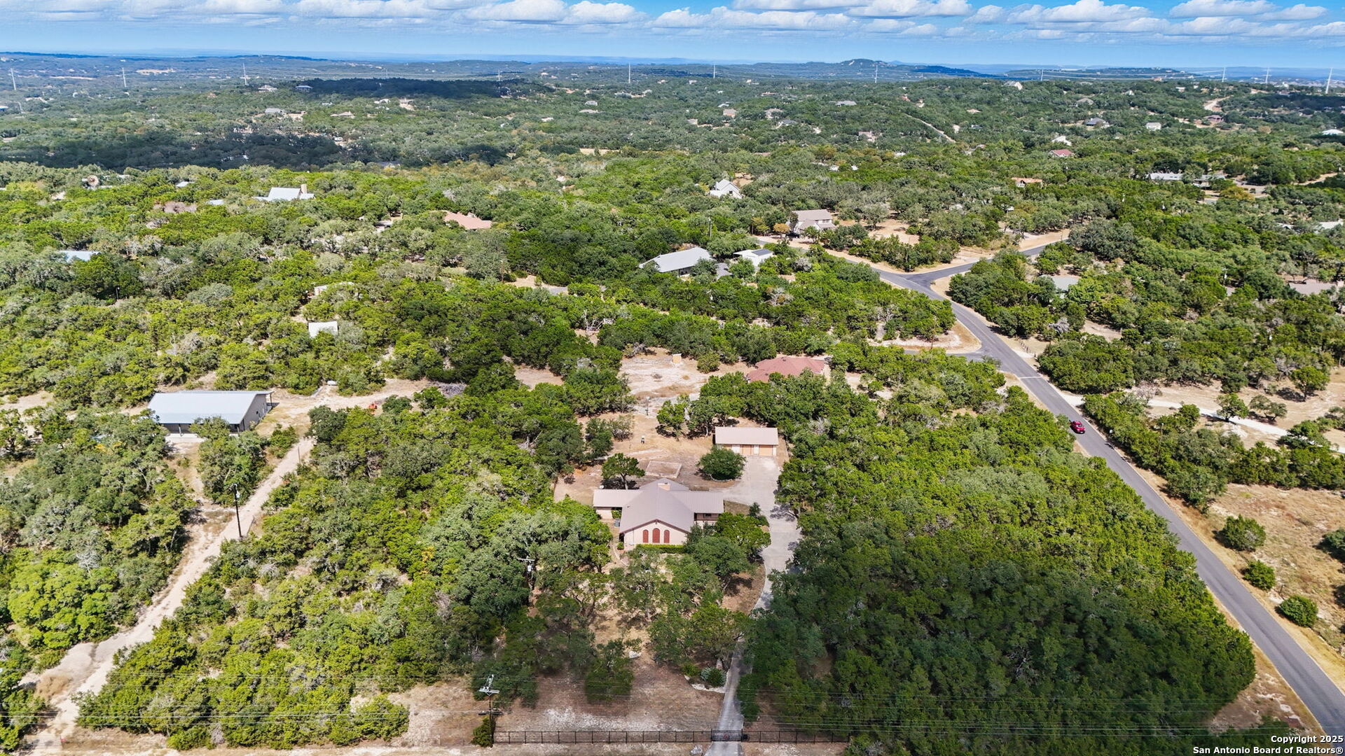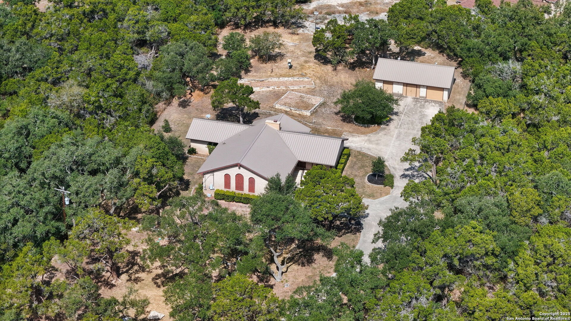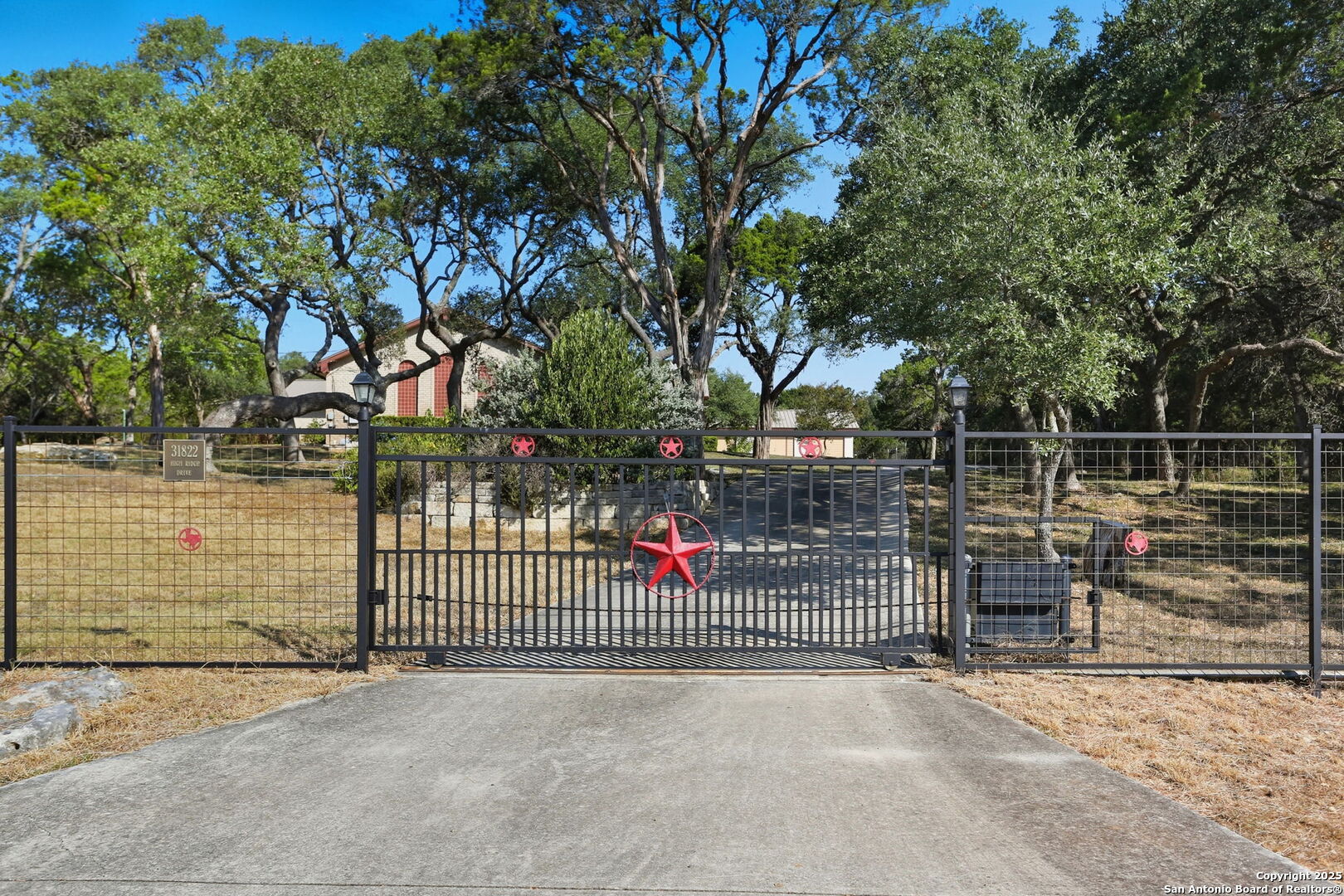 Secluded Hill-Country retreat offering peaceful living void of neighbors on either side, minutes from shopping, dining, and quick access to Hwy 281 or 46. This single-owner home offers a recently remodeled single-story, split floor plan layout. The enclosed back patio provides year-round comfort with full heating and cooling, surrounded by beautiful windows that fill the space with natural light and add 357 sq. ft. of inviting living area. Interior updates include ceramic tile in main areas, new carpet in bedrooms, and a remodeled kitchen featuring new LG appliances, soft-close cabinets, white cultured marble island, lovely backsplash, and Elfa pantry organizers. The living room features vaulted ceilings, large built-in cabinet, and a cozy wood-burning fireplace. The primary suite offers an updated bathroom, walk-in closet, walk-in shower & safety grab rails, while the secondary bedrooms and other full bath are located on the opposite side of the home for added privacy. A 975 sq. ft. detached garage & workshop provides space for vehicles, storage, or projects. Additional features include a security gate with keypad, a well (pump replaced approx. 5-10 years ago), water softener, and a metal roof (approx. 10 years old).