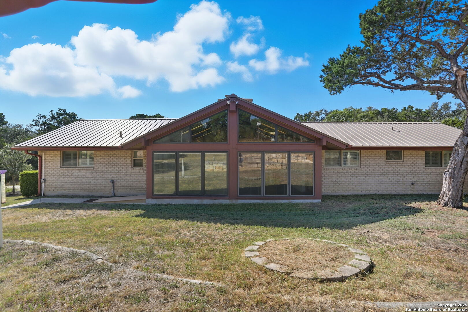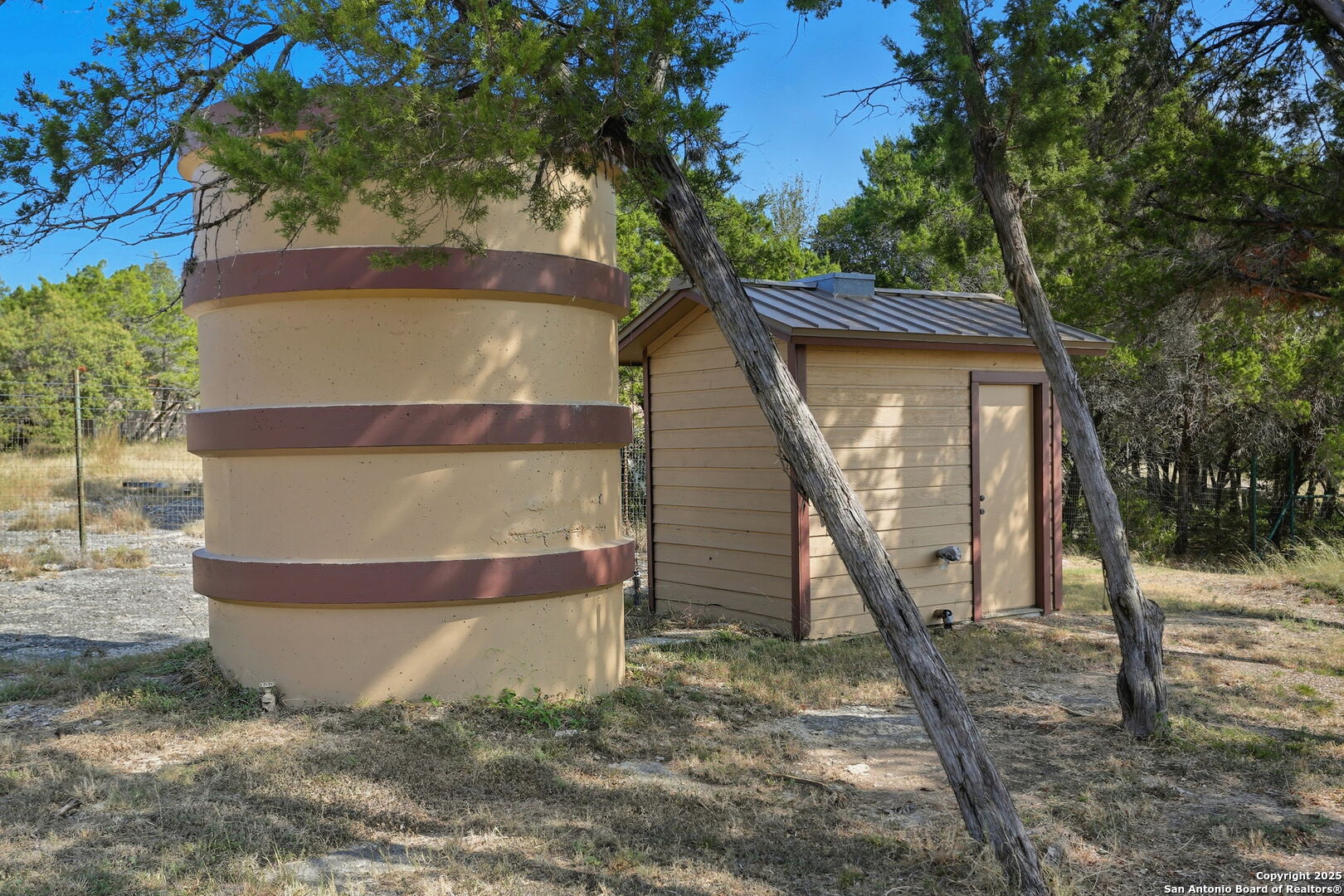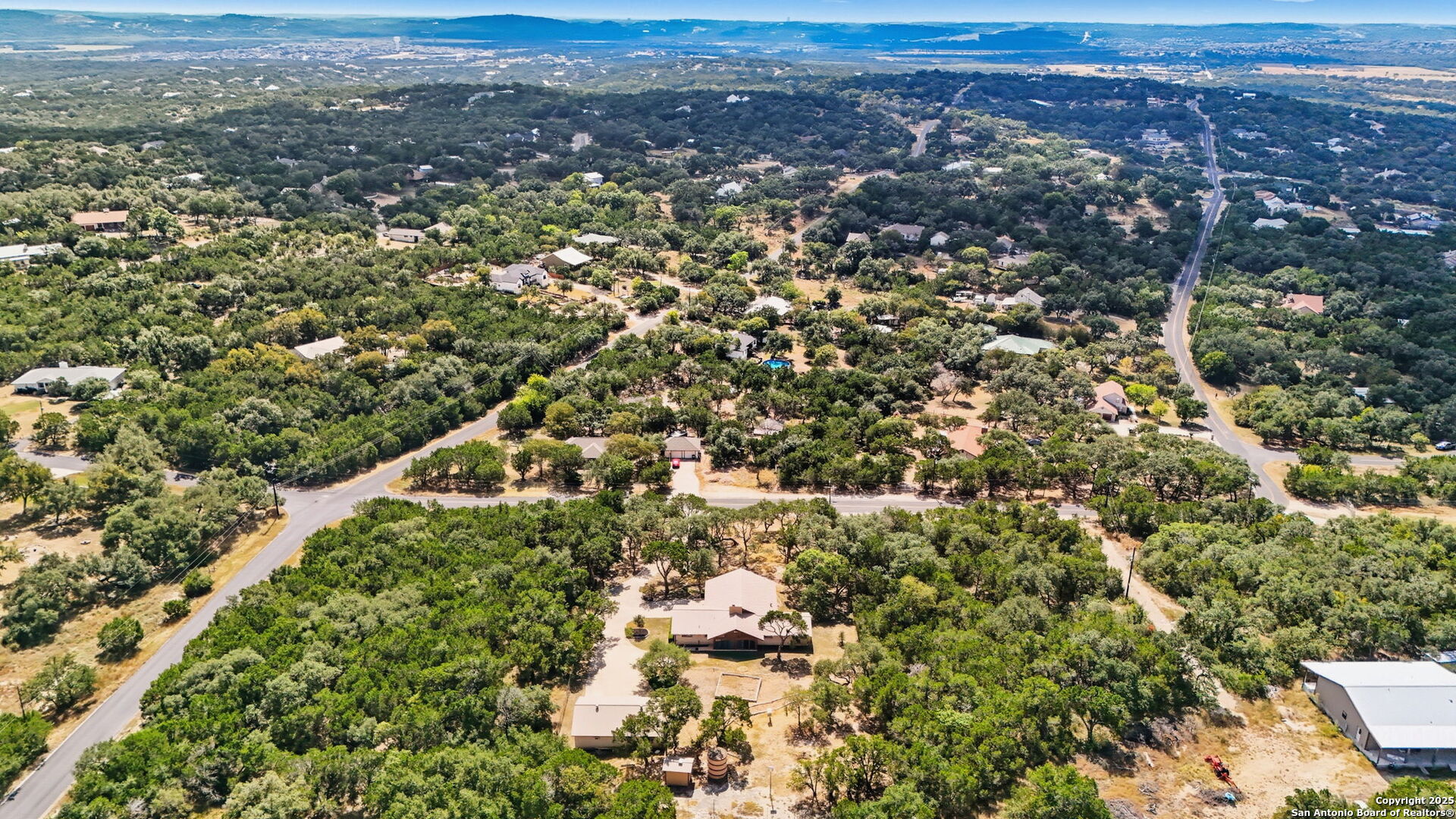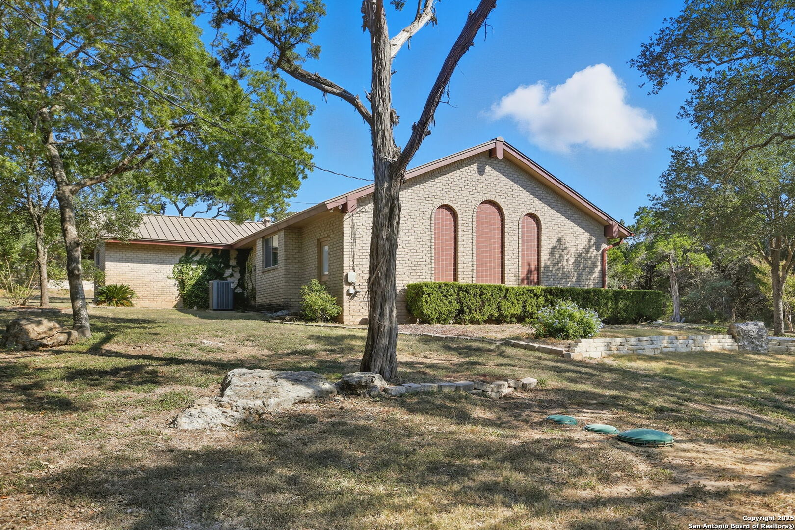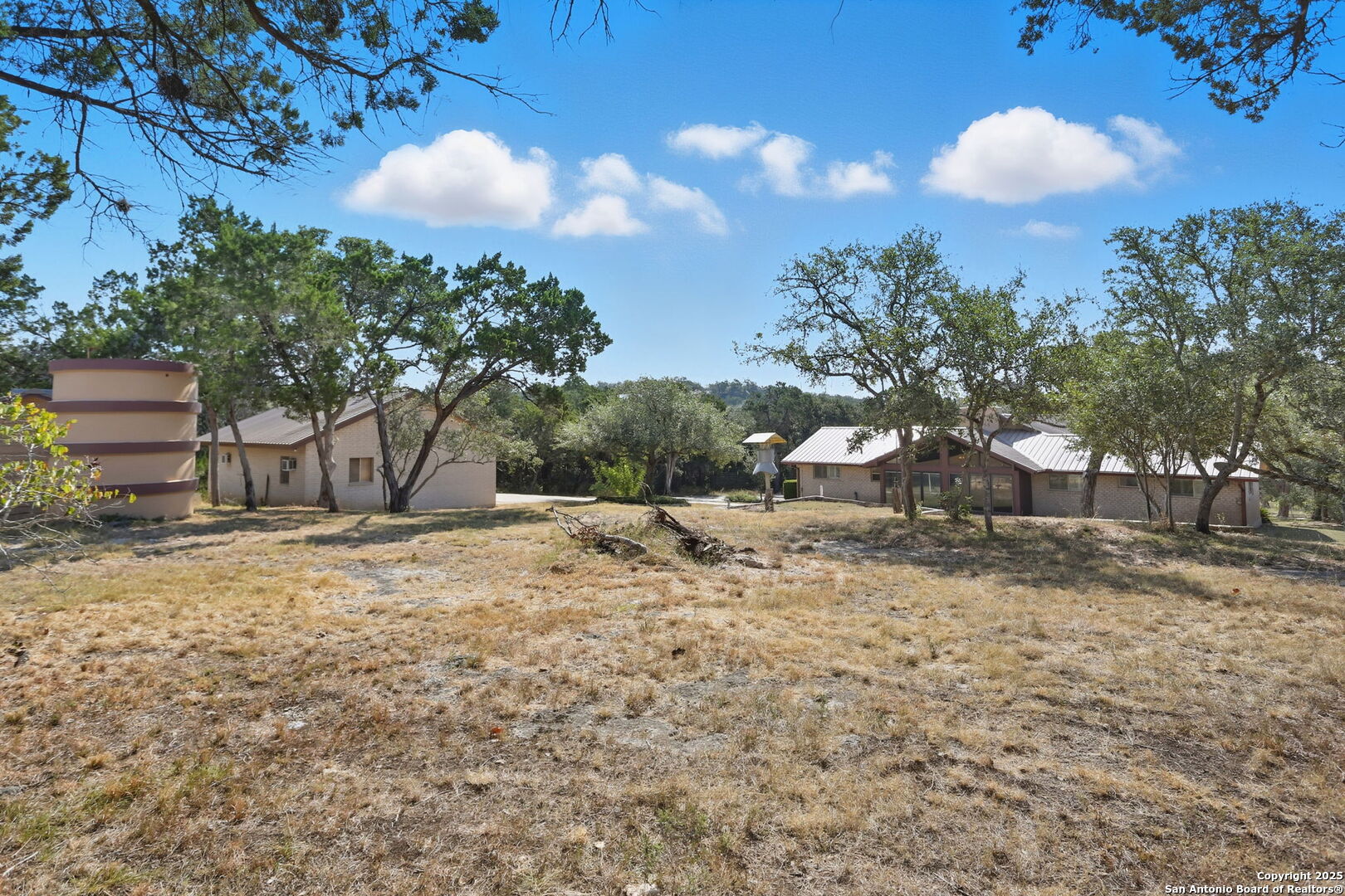 Secluded Hill-Country retreat offering peaceful living void of neighbors on either side, minutes from shopping, dining, and quick access to Hwy 281 or 46. This single-owner home offers a recently remodeled single-story, split floor plan layout. The enclosed back patio provides year-round comfort with full heating and cooling, surrounded by beautiful windows that fill the space with natural light and add 357 sq. ft. of inviting living area. Interior updates include ceramic tile in main areas, new carpet in bedrooms, and a remodeled kitchen featuring new LG appliances, soft-close cabinets, white cultured marble island, lovely backsplash, and Elfa pantry organizers. The living room features vaulted ceilings, large built-in cabinet, and a cozy wood-burning fireplace. The primary suite offers an updated bathroom, walk-in closet, walk-in shower & safety grab rails, while the secondary bedrooms and other full bath are located on the opposite side of the home for added privacy. A 975 sq. ft. detached garage & workshop provides space for vehicles, storage, or projects. Additional features include a security gate with keypad, a well (pump replaced approx. 5-10 years ago), water softener, and a metal roof (approx. 10 years old).
