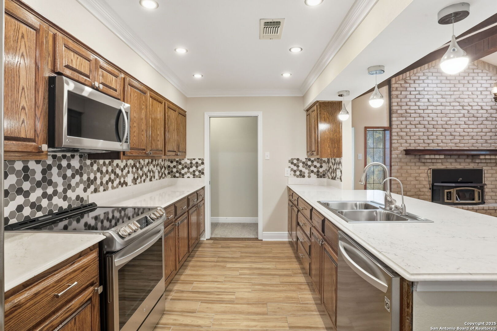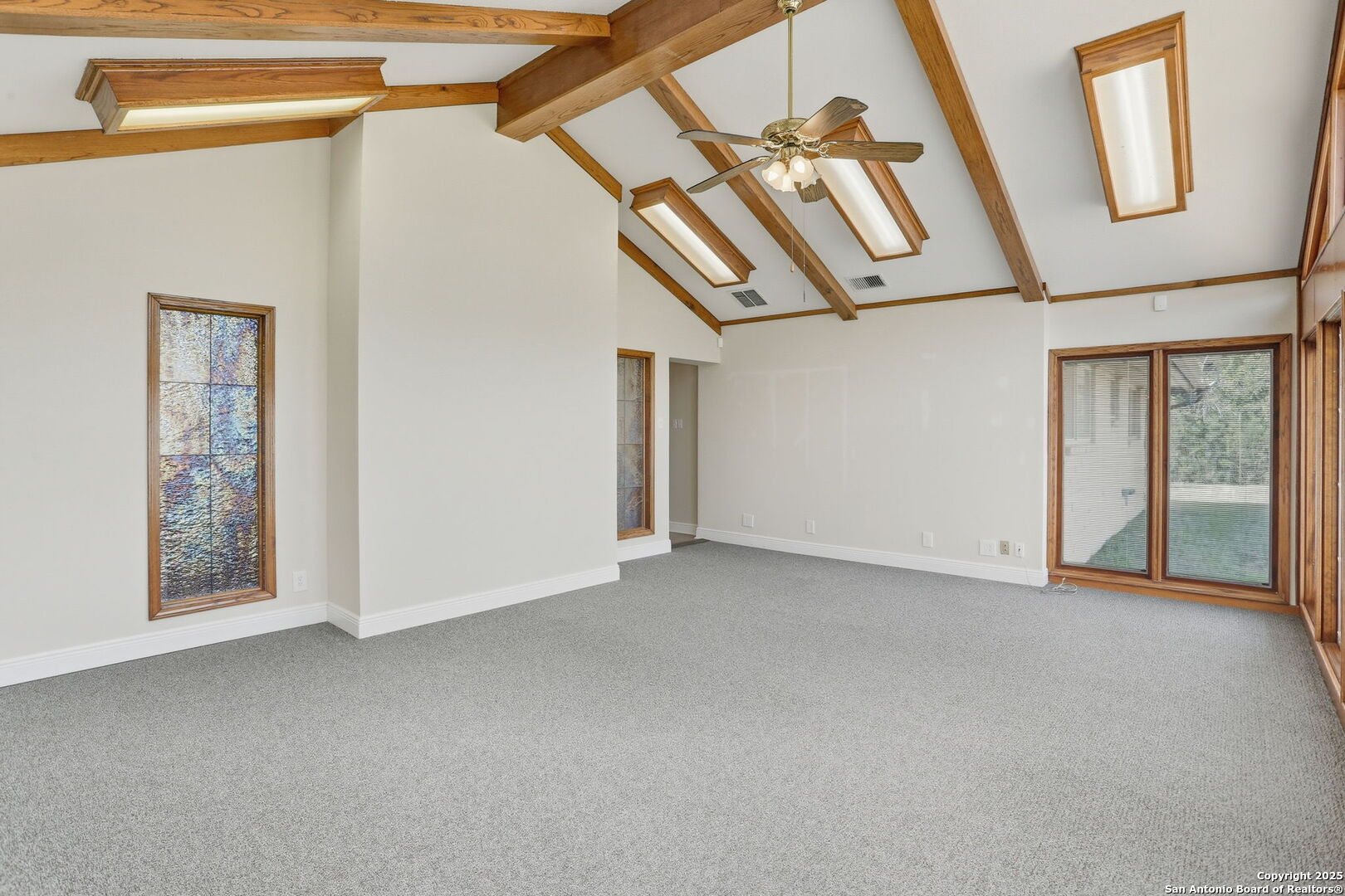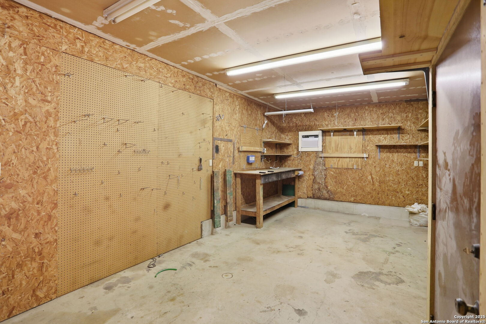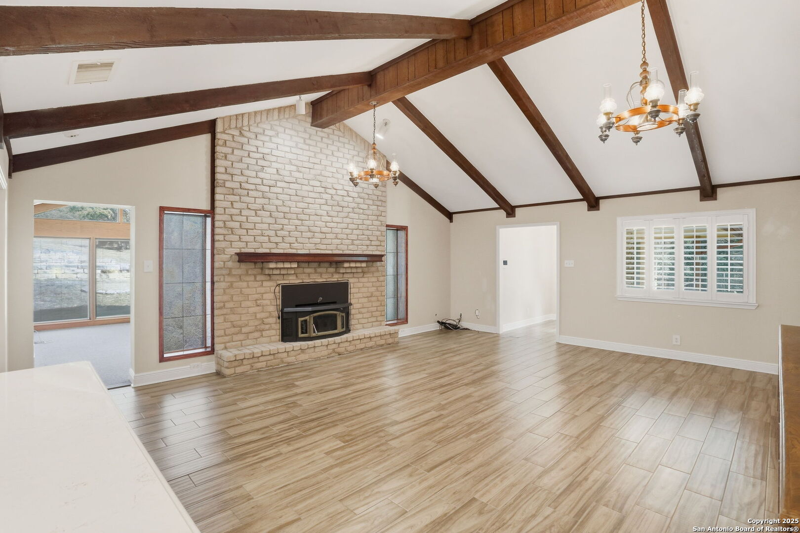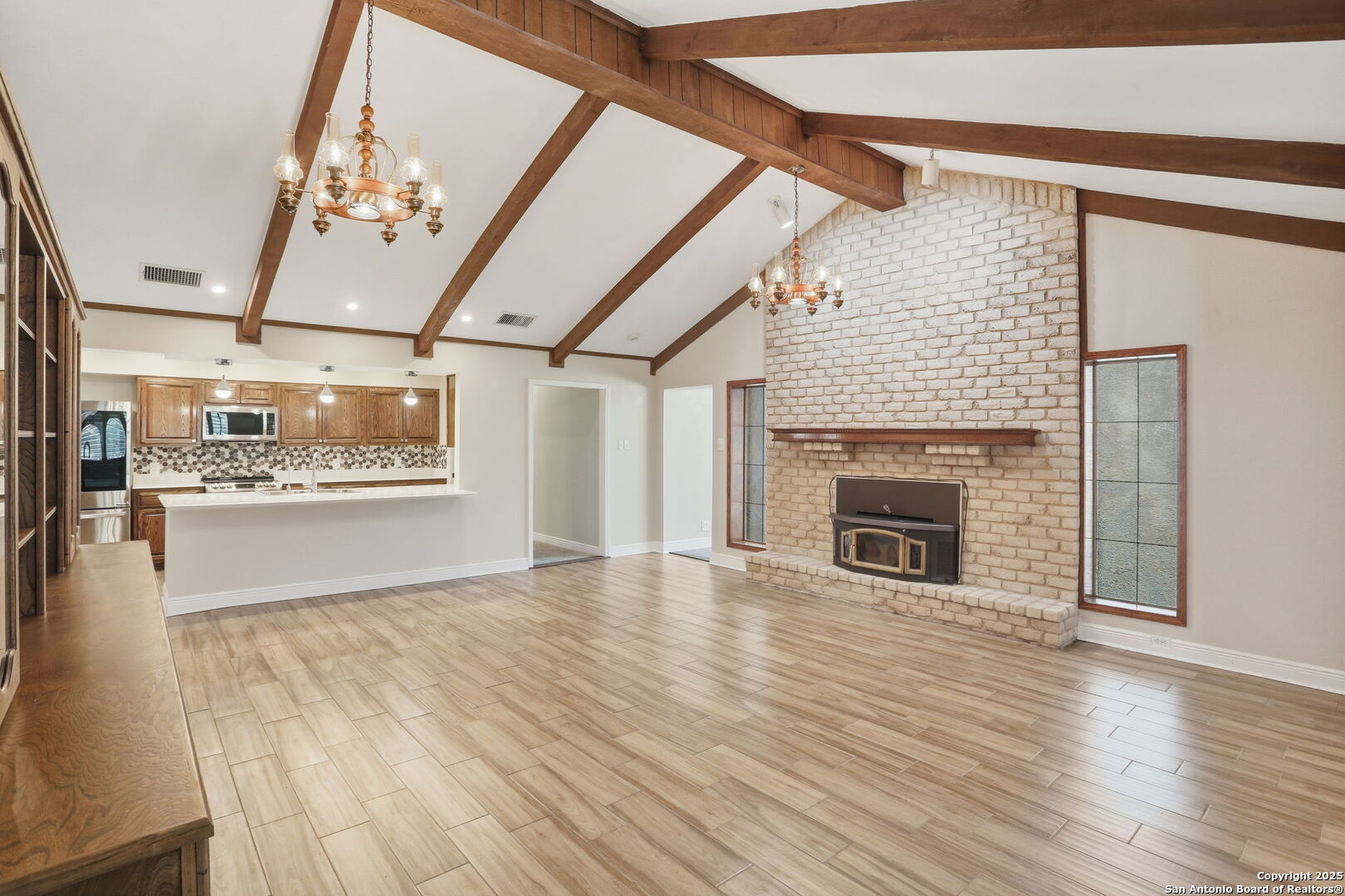 Secluded Hill-Country retreat offering peaceful living void of neighbors on either side, minutes from shopping, dining, and quick access to Hwy 281 or 46. This single-owner home offers a recently remodeled single-story, split floor plan layout. The enclosed back patio provides year-round comfort with full heating and cooling, surrounded by beautiful windows that fill the space with natural light and add 357 sq. ft. of inviting living area. Interior updates include ceramic tile in main areas, new carpet in bedrooms, and a remodeled kitchen featuring new LG appliances, soft-close cabinets, white cultured marble island, lovely backsplash, and Elfa pantry organizers. The living room features vaulted ceilings, large built-in cabinet, and a cozy wood-burning fireplace. The primary suite offers an updated bathroom, walk-in closet, walk-in shower & safety grab rails, while the secondary bedrooms and other full bath are located on the opposite side of the home for added privacy. A 975 sq. ft. detached garage & workshop provides space for vehicles, storage, or projects. Additional features include a security gate with keypad, a well (pump replaced approx. 5-10 years ago), water softener, and a metal roof (approx. 10 years old).