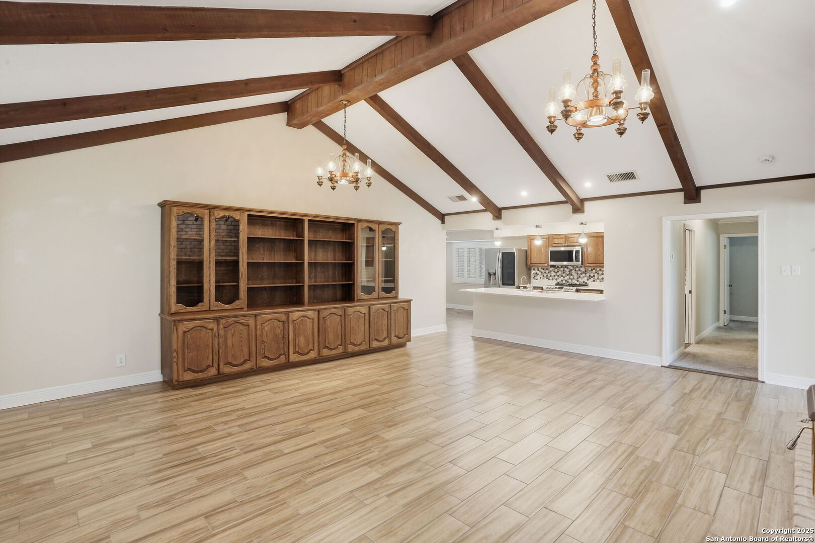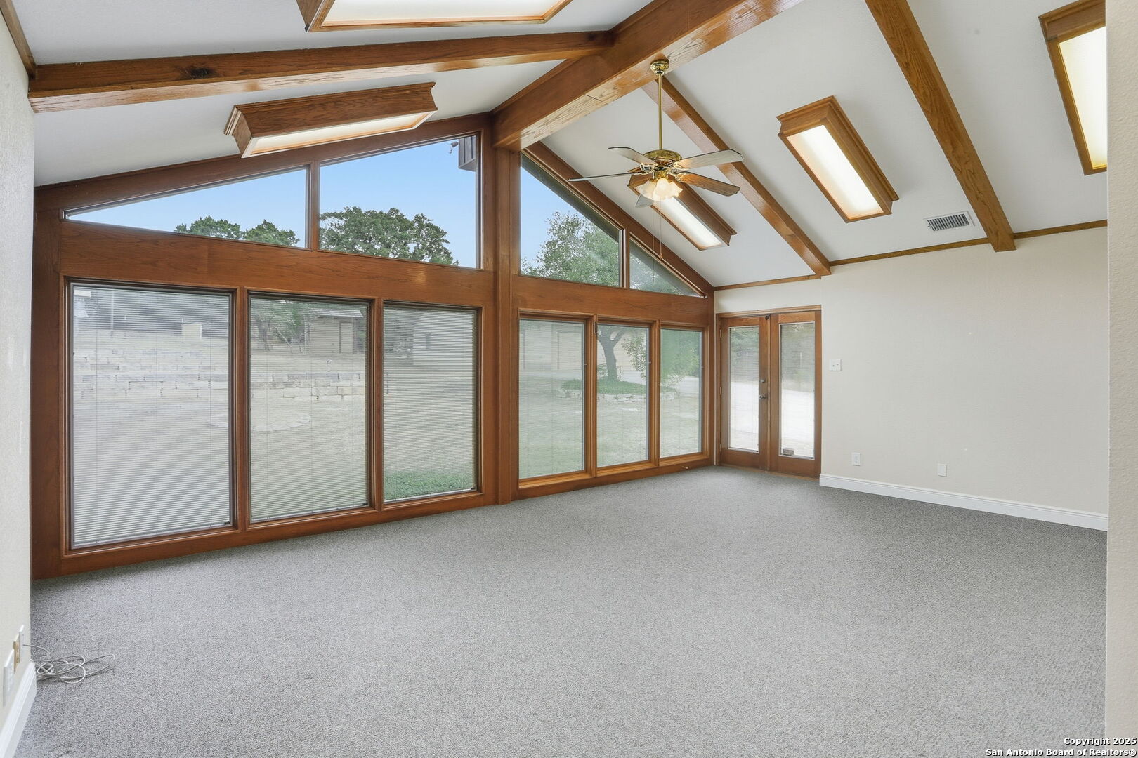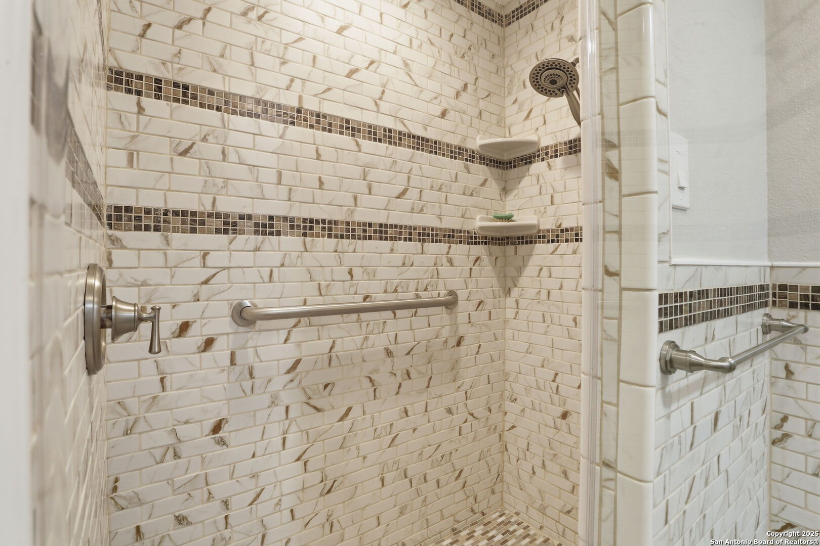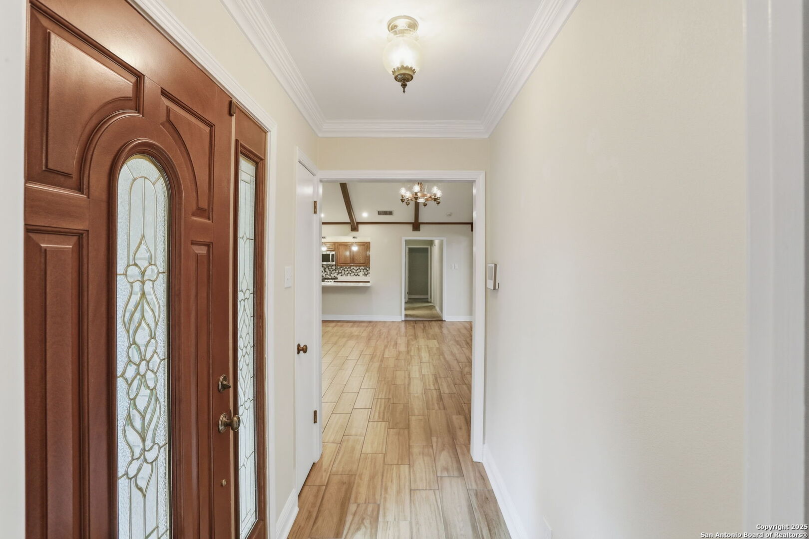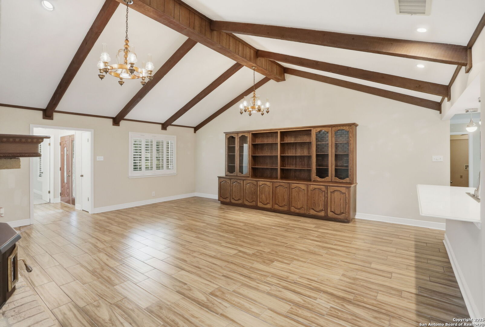 Secluded Hill-Country retreat offering peaceful living void of neighbors on either side, minutes from shopping, dining, and quick access to Hwy 281 or 46. This single-owner home offers a recently remodeled single-story, split floor plan layout. The enclosed back patio provides year-round comfort with full heating and cooling, surrounded by beautiful windows that fill the space with natural light and add 357 sq. ft. of inviting living area. Interior updates include ceramic tile in main areas, new carpet in bedrooms, and a remodeled kitchen featuring new LG appliances, soft-close cabinets, white cultured marble island, lovely backsplash, and Elfa pantry organizers. The living room features vaulted ceilings, large built-in cabinet, and a cozy wood-burning fireplace. The primary suite offers an updated bathroom, walk-in closet, walk-in shower & safety grab rails, while the secondary bedrooms and other full bath are located on the opposite side of the home for added privacy. A 975 sq. ft. detached garage & workshop provides space for vehicles, storage, or projects. Additional features include a security gate with keypad, a well (pump replaced approx. 5-10 years ago), water softener, and a metal roof (approx. 10 years old).