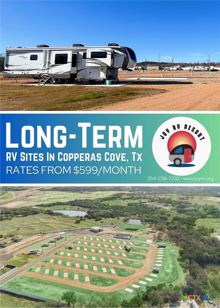ALL BILLS PAID!!! Joy Drive In Movie Theatre and RV Resort?? Copperas Cove! RV’s for rent by night, week or month! Gated and Fully Privacy Fenced 17 acres with gated and secured access, Free Fresh Chicken Eggs Daily, Dog Park, 1100 linear feet of Creek, Pull Through Sites, 30/50 amp, sewer, electric and WiFi at EVERY site, Playground and Swings, Clubhouse, On-Site coin-op Laundry, Mature Trees and Country Walking Trails. In ground Pool coming soon 40ft x 70ft Original drive in movie screen since 1953 with Movie nights coming soon Sites available and short and long term RV rentals available. Call today. Stay, Play, Live - JOY