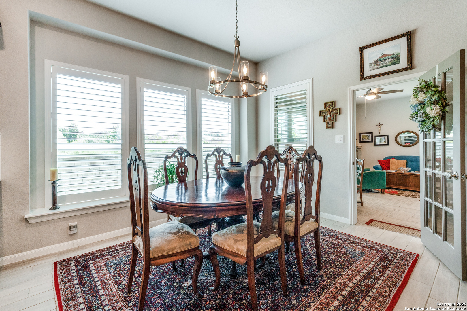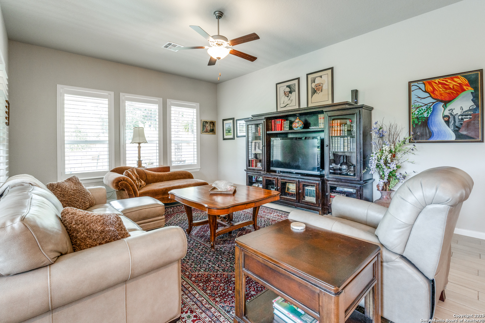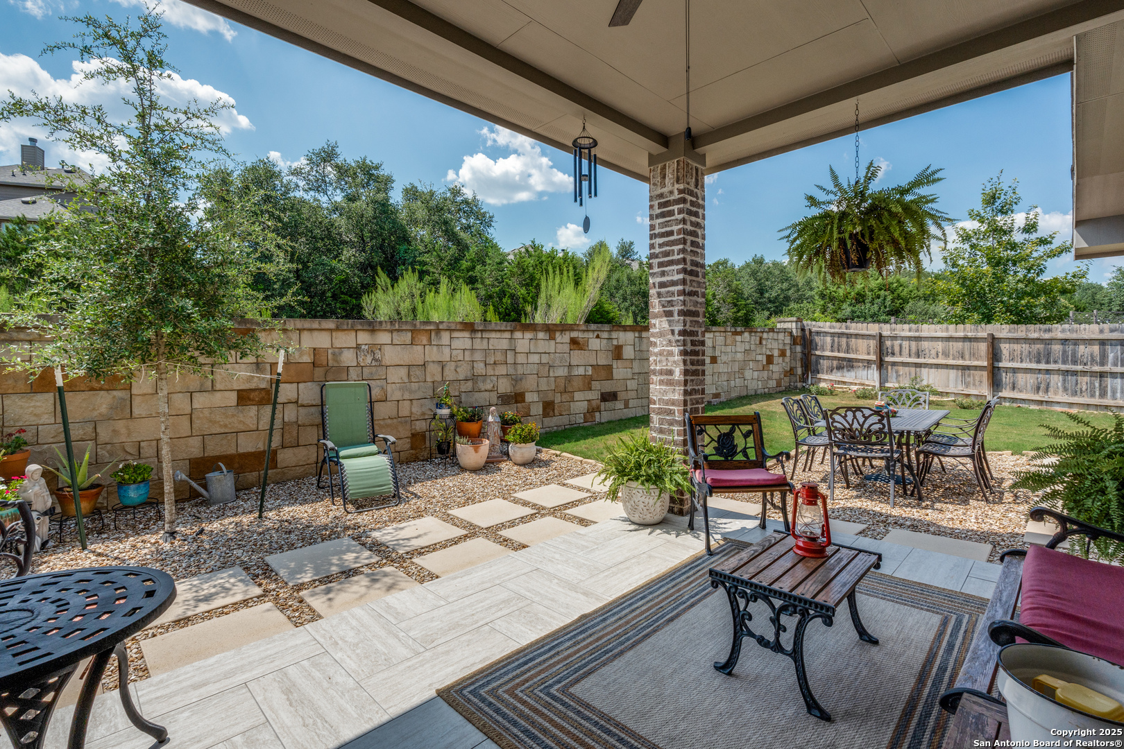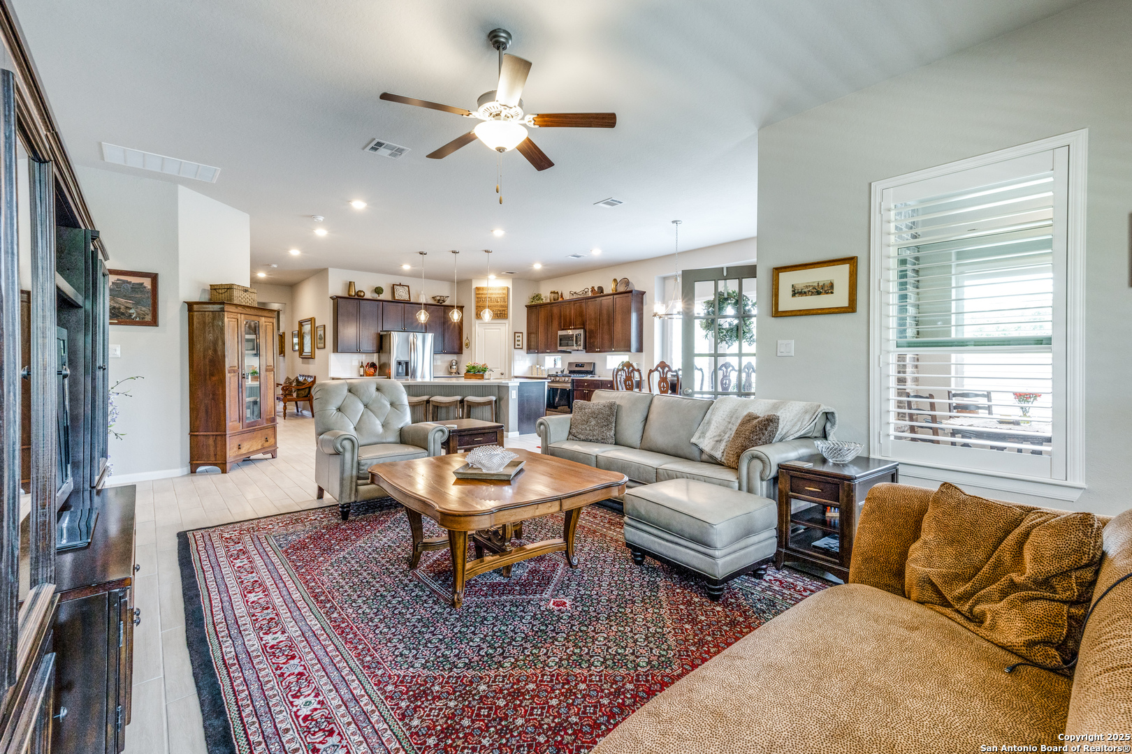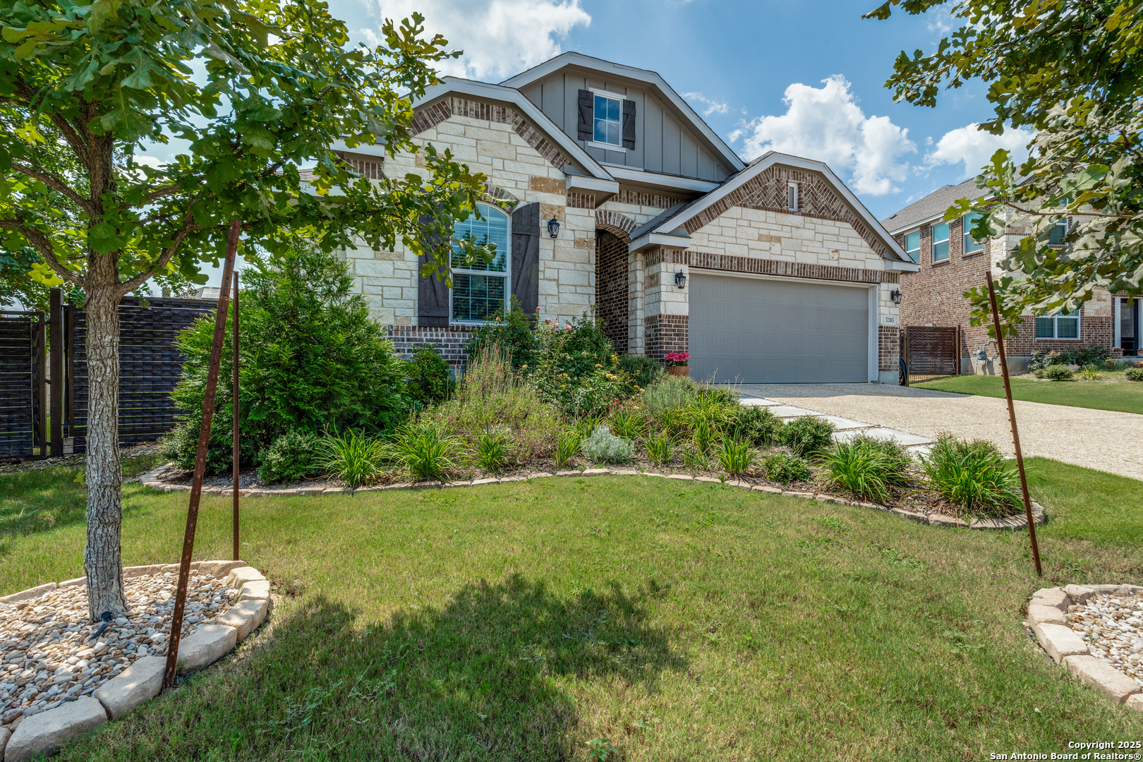 Nestled in the breathtaking Texas Hill Country, stunning 4-bedroom, 3-bathroom cottage style home in The Oaks gated community of Johnson Ranch North...a short drive from San Antonio, Boerne, and New Braunfels. Walk in to a welcoming foyer that leads to a gourmet kitchen with quartz countertops and an oversized island, seamlessly flowing into the spacious family room with plantation shutters. The grand owner's suite, situated in a private corner, boasts an elegant ensuite and a massive walk-in closet. New H20 softener (Sep 2025), new carpet in primary (Sep 2025). Sprinkler system, Ring doorbell camera, backyard flood lights, tankless water heater, reverse osmosis water purification system. Versatile second living area, a charming covered patio, and an expansive yard with a beautiful stone fence on two sides. Elegant living in a serene and picturesque setting-Come and get it!