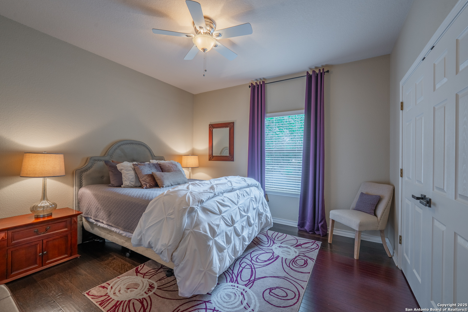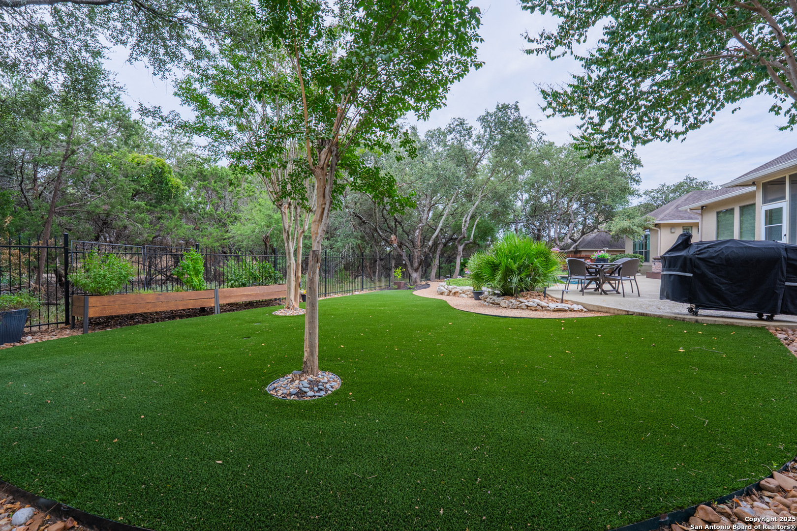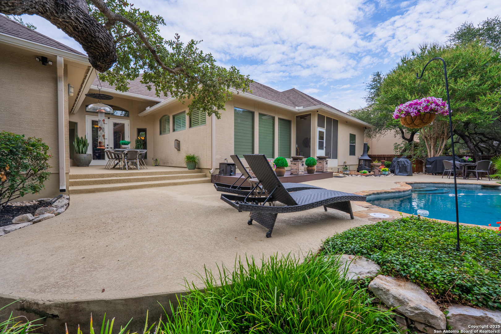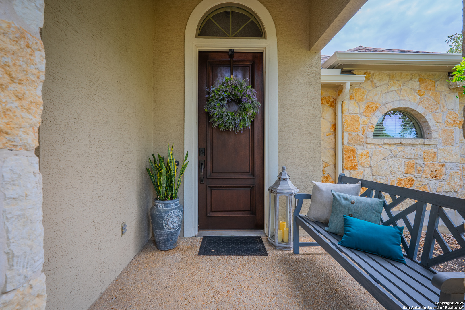 This pristine home on a near 1/3 acre greenbelt lot in highly coveted, guarded Emerald Forest combines a thoughtful plan, tasteful updates, and a resort-style backyard retreat. Arrive, and fall in love with the curb appeal afforded by the stone and stucco elevation, mature oak trees, and the manicured lawn. Step inside to a grand foyer with captivating views to the rear courtyard, grounds and green space beyond the property. Designer ceilings appeal to the eye, while natural light floods the residence from expansive windows. The chef's island kitchen, with well-appointed butler's pantry, boasts 36 inch 5 burner gas cooking with classic arched brick surround, granite counters, quartz backsplash, custom white open-face cabinetry, modern fixtures, reverse osmosis drinking water, a composite sink, and an expansive walk-in pantry. It also hosts a breakfast bar, built-in desk space or coffee bar, and an ample morning area. Doubling as a service buffet, the butler's pantry offers granite counters, more open-face white cabinets and hardwoods floors that flow into the formal dining room. It's roomy, anchored by a modern light fixture, designer ceiling treatment and natural light. The inviting living room features built-in cabinetry, plantation shutters, and backyard pool views, hardwoods, a large ceiling fan and warm finishes. A second living space is afforded by the sunroom wrapped in windows with shades, providing tranquil views of the backyard, green space, and wildlife. There is a well appointed guest bath to enhance entertaining as well. The private owners escape offers spacious accommodations, tray ceiling, recessed lighting, and a spa-like ensuite with jetted tub, walk-in shower, dual vanities with makeup vanity, and a generous walk-in closet. Guest quarters are equally impressive, with two spacious bedrooms offering ample closet space, connected by a Jack-and-Jill bath with large walk-in shower and a separate tub/shower combo. Throughout the home, there's no carpet-only wide-plank hardwood floors, and large ceramic tile. The laundry room has cabinet storage, a deep sink, and full-sized connections. It connects to the oversized side-entry 2 car garage with luxury overhead door. The garage boasts epoxy coated floors, built-in cabinets, a water softener, and it houses the sprinkler system controls. The backyard is your private paradise, with in-ground, heated swimming pool surrounded by tropical plants, raised gardens and low-maintenance artificial turf. The privacy is enhanced by the luxury of having no immediate rear neighbor. With its prime location in a prestigious community, access to highly rated schools, a timeless floor plan, luxury upgrades, and resort-style outdoor living, this is the one.