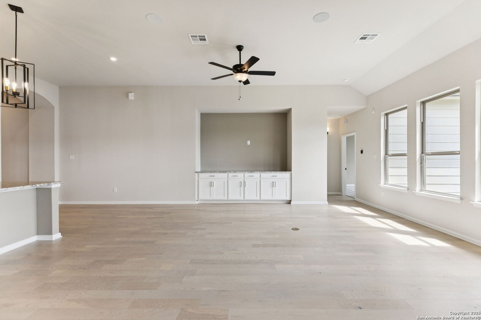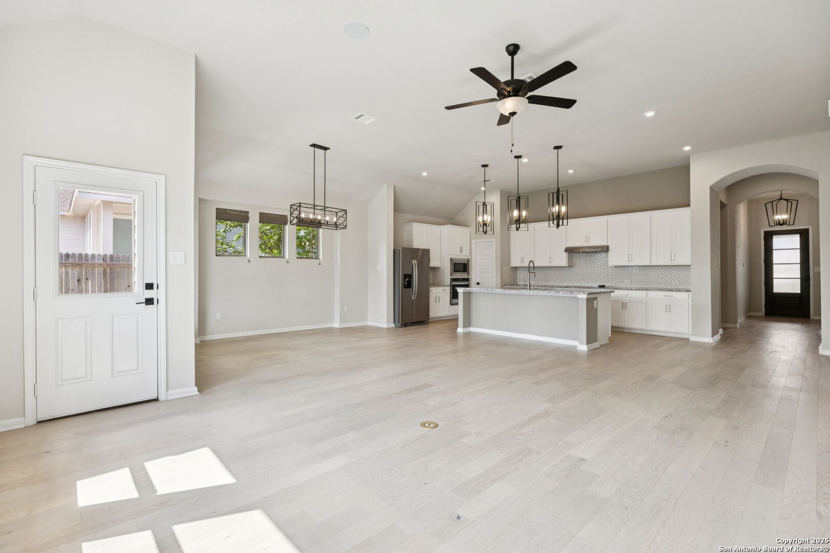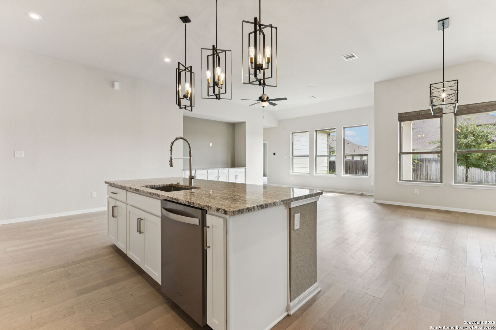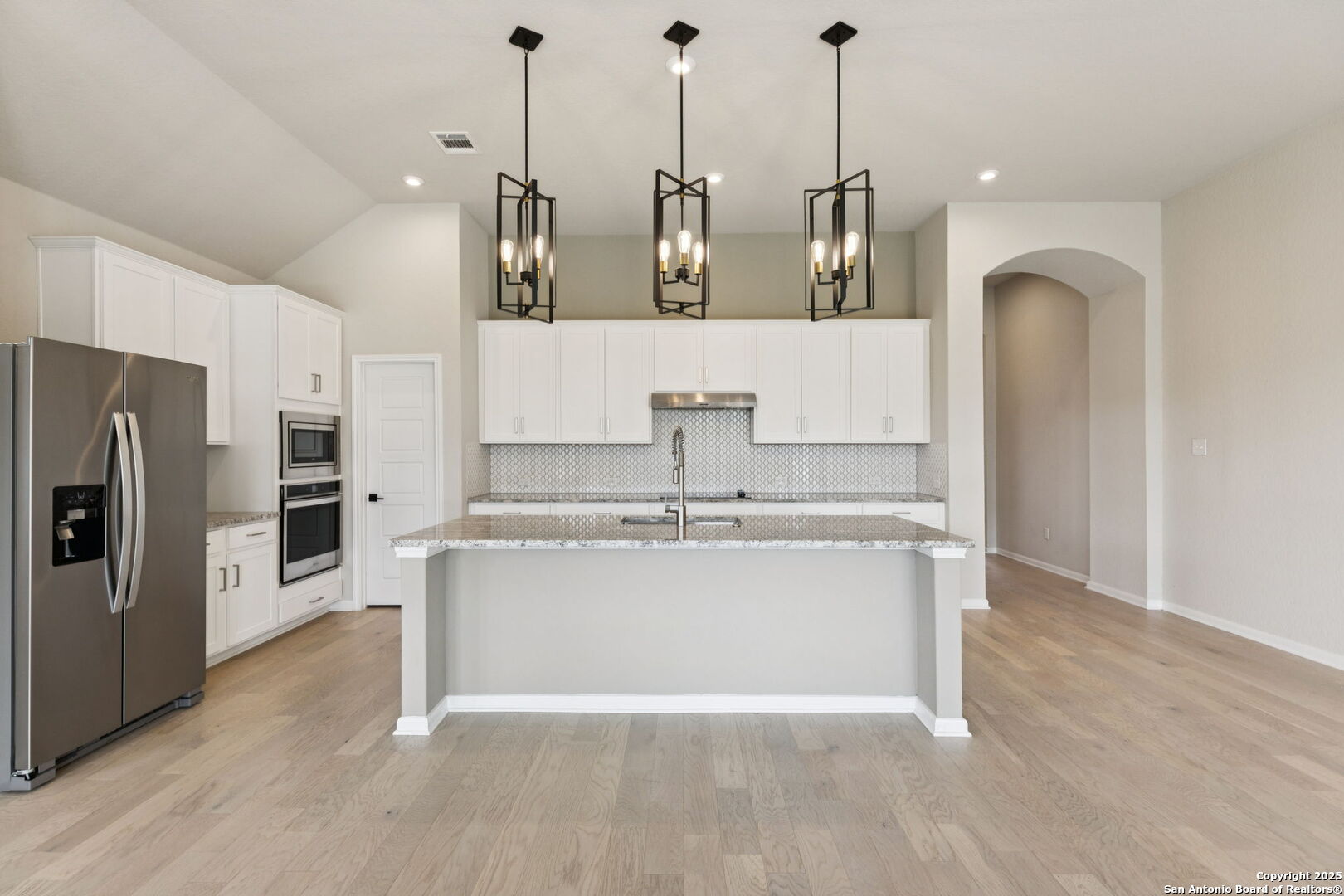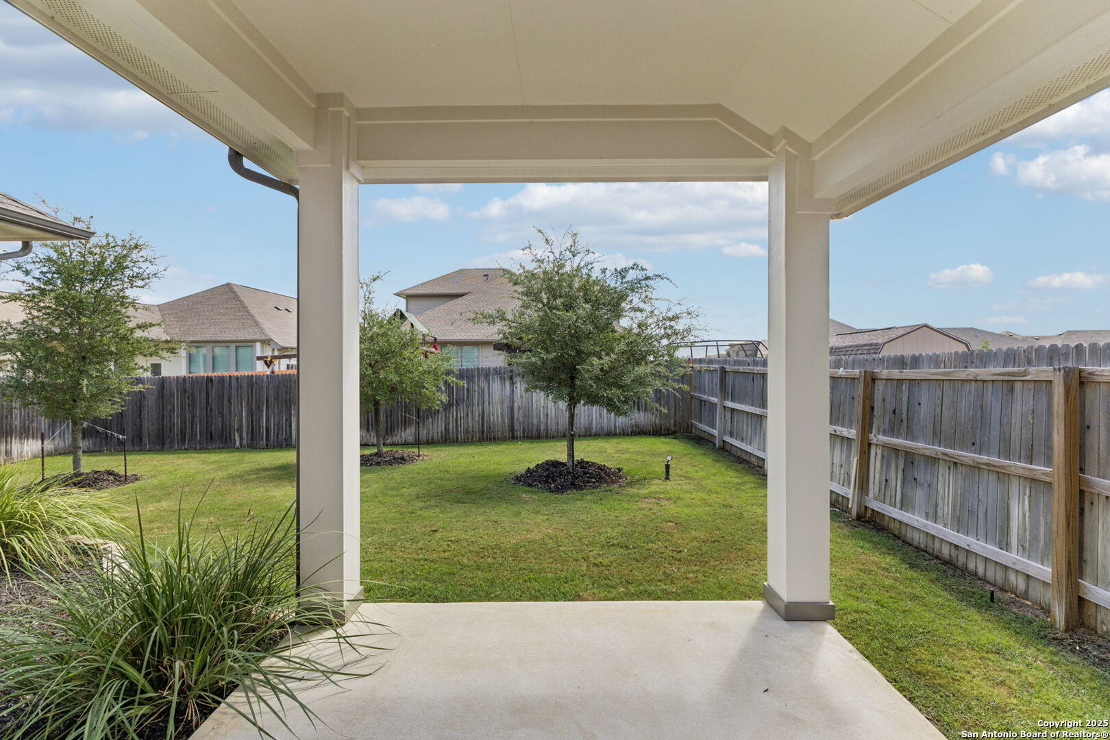 The Grandview is one of the most sought-after single-story designs, carefully created to balance comfort and functionality. Built in 2020, this home has never been lived in and previously served as a model home, offering like-new quality with thoughtful upgrades throughout. A dedicated kids' retreat is conveniently situated between bedrooms two and three, while the private primary suite provides a quiet retreat of its own, making this floor plan ideal for multi-generational living. The expansive living area flows seamlessly into the gourmet kitchen, where a spacious walk-in pantry, granite countertops, 42-inch cabinets, built-in appliances, and an oversized island create the perfect space for both everyday living and entertaining. The open-concept design ensures the chef is always part of the conversation and festivities. Outside, a Texas-sized covered patio provides the ideal setting for grilling, gathering, and enjoying time with family and friends.