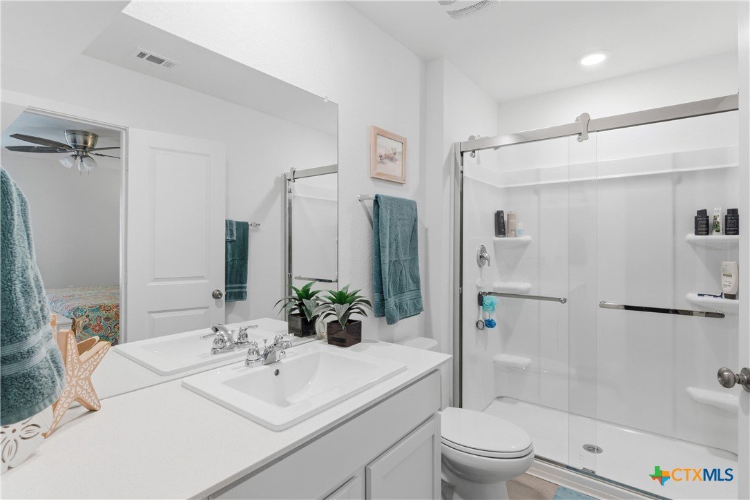VIRTUAL TOUR AND FLOORPLAN! Super Cute! Emaculately maintained, only a year old, with many owner upgrades make this a special property! There is an 18x12 covered patio for those quiet evenings in your backyard haven. The garage is finished out and painted with a seller-owned water softener, which will convey. Additional shelving in the laundry was installed, with cozy picture rails in the hallway. The refrigerator will remain with the property. An upgraded shower door system has been installed in the master bath and matching ceiling fans with lights have been installed in every room. The property also has an installed Base Power Supply, battery backup, in case of power failure. Come see this lovely home, ready for you to make it your own!