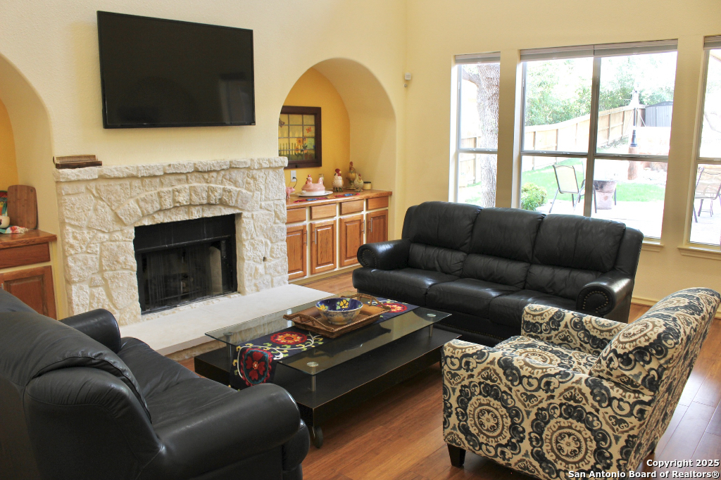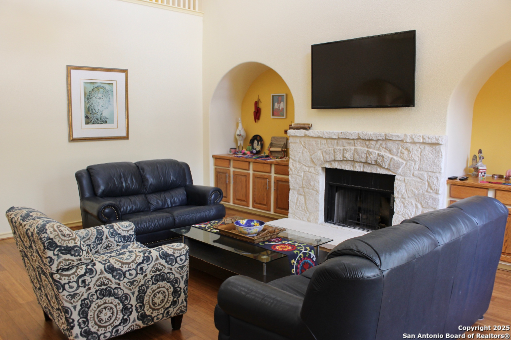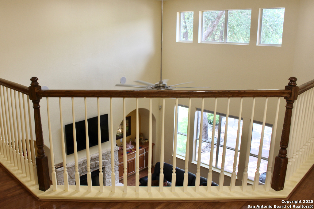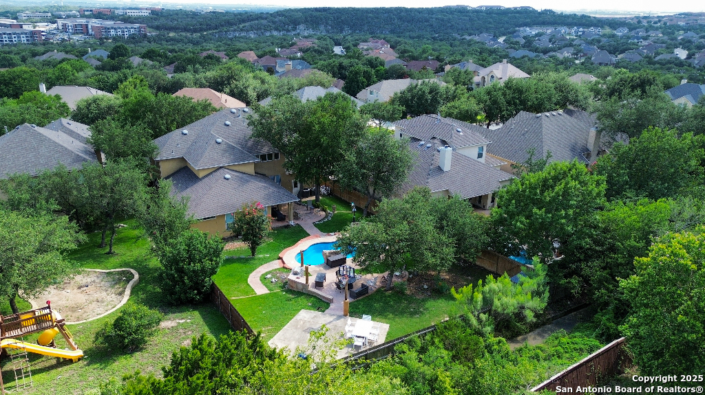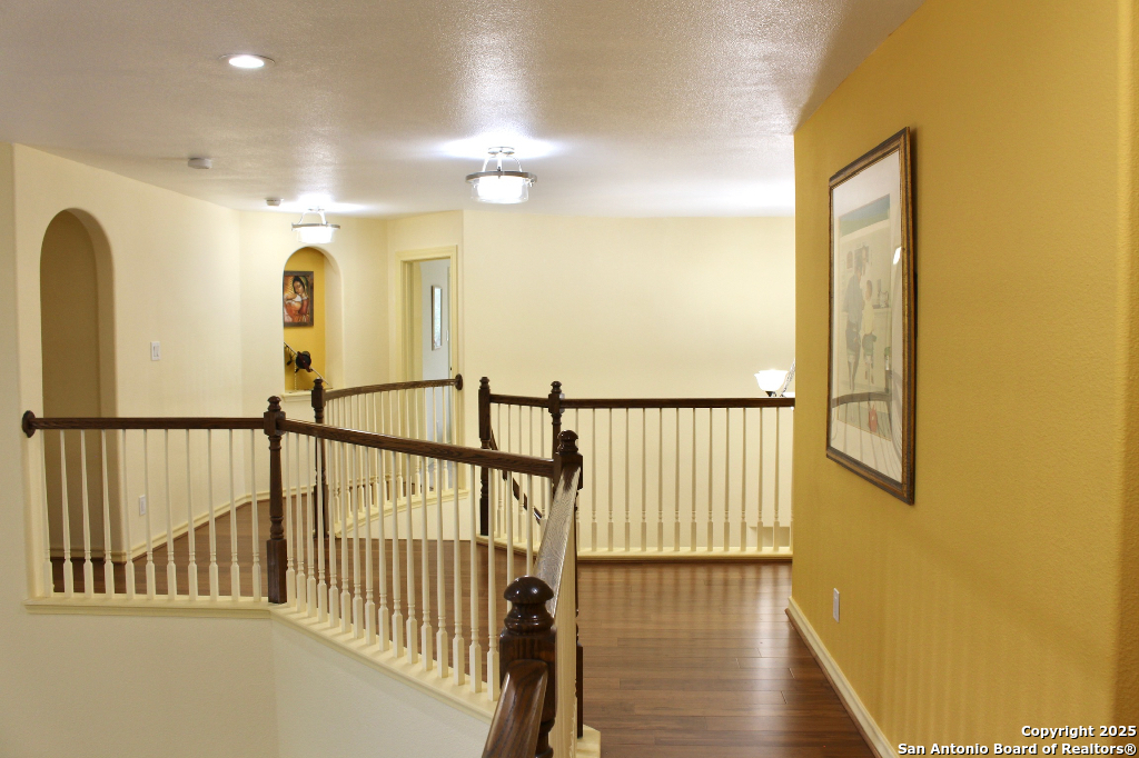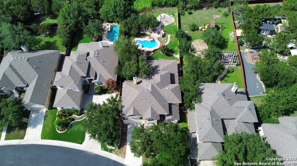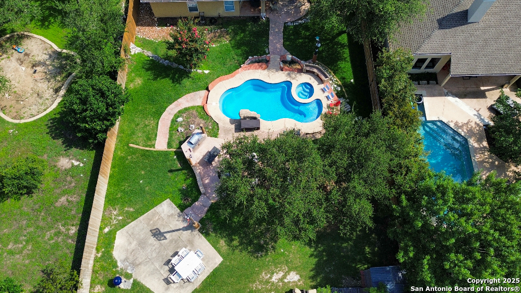 This amazing custom home is in the gated Rogers Ranch Point Bluff community. It boasts a beautiful back yard retreat with a pool/spa and cavernous 3 car garage. It's a freshly painted young home with too many updates to list but the hardwood floors are incredible. It features an open floor plan that is perfect for entertaining. The warm and spacious kitchen features beautiful hardware, double ovens, a gas stove and granite countertops. The Family room has beautiful stone fireplace and tons of natural light. This home features 5 bedrooms. Two primary 1st floor bedroom suites complete with shower, separate bathtub and double walk-in closets with beautiful built-ins in the master. Upstairs you will find the media room and game/flex room with 3 additional bedrooms and 2 full bathrooms. The Greenbelt backyard is great for entertaining and privacy. Enjoy your pool/spa with custom waterfalls, a covered patio, a gas lit outdoor fire pit, a built in grill, and a basketball hoop for enjoyment. Incentives are included for new carpet and fresh paint. Come see you beautiful private retreat in amazing northern San Antonio.