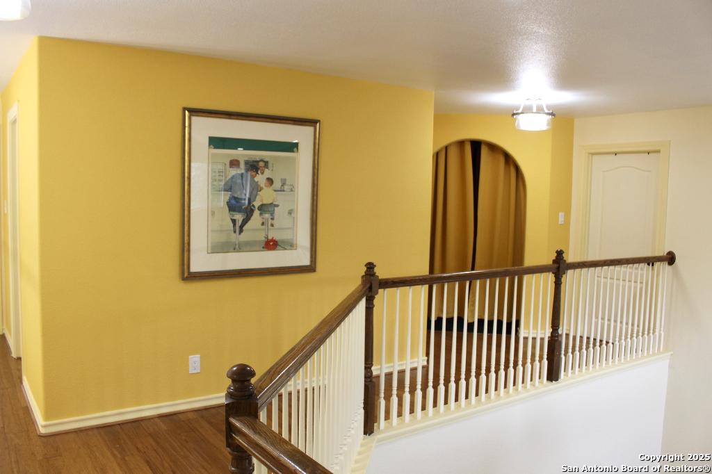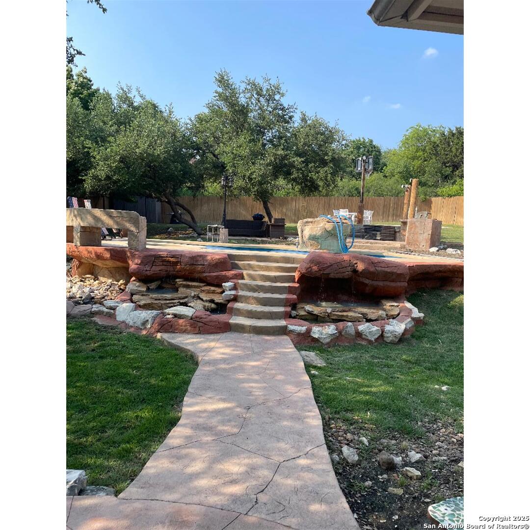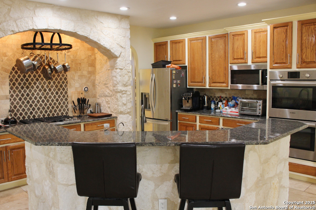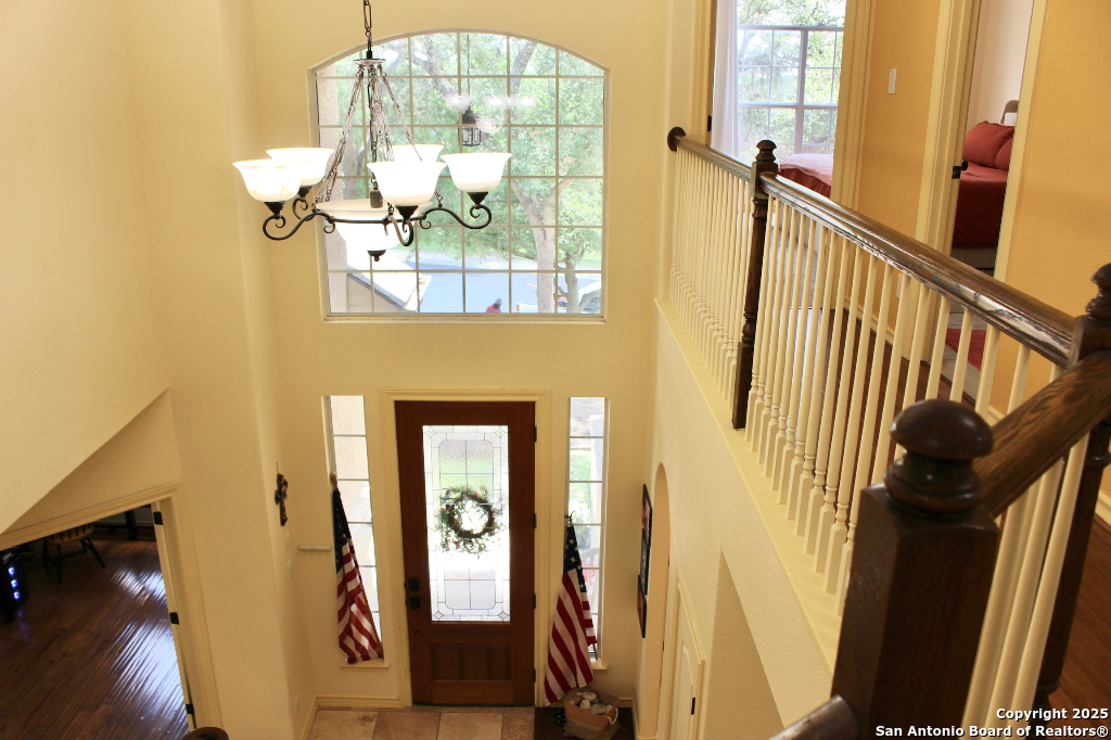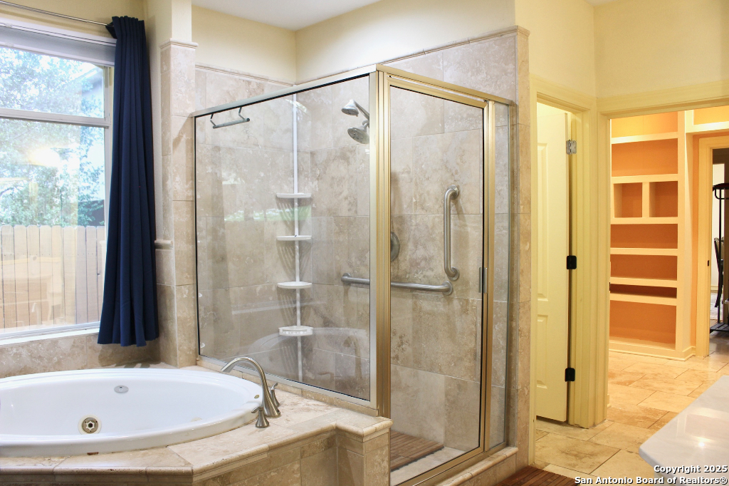 This amazing custom home is in the gated Rogers Ranch Point Bluff community. It boasts a beautiful back yard retreat with a pool/spa and cavernous 3 car garage. It's a freshly painted young home with too many updates to list but the hardwood floors are incredible. It features an open floor plan that is perfect for entertaining. The warm and spacious kitchen features beautiful hardware, double ovens, a gas stove and granite countertops. The Family room has beautiful stone fireplace and tons of natural light. This home features 5 bedrooms. Two primary 1st floor bedroom suites complete with shower, separate bathtub and double walk-in closets with beautiful built-ins in the master. Upstairs you will find the media room and game/flex room with 3 additional bedrooms and 2 full bathrooms. The Greenbelt backyard is great for entertaining and privacy. Enjoy your pool/spa with custom waterfalls, a covered patio, a gas lit outdoor fire pit, a built in grill, and a basketball hoop for enjoyment. Incentives are included for new carpet and fresh paint. Come see you beautiful private retreat in amazing northern San Antonio.