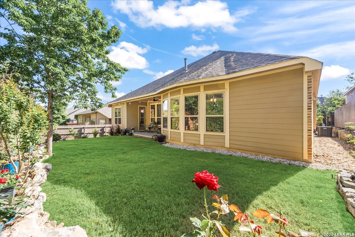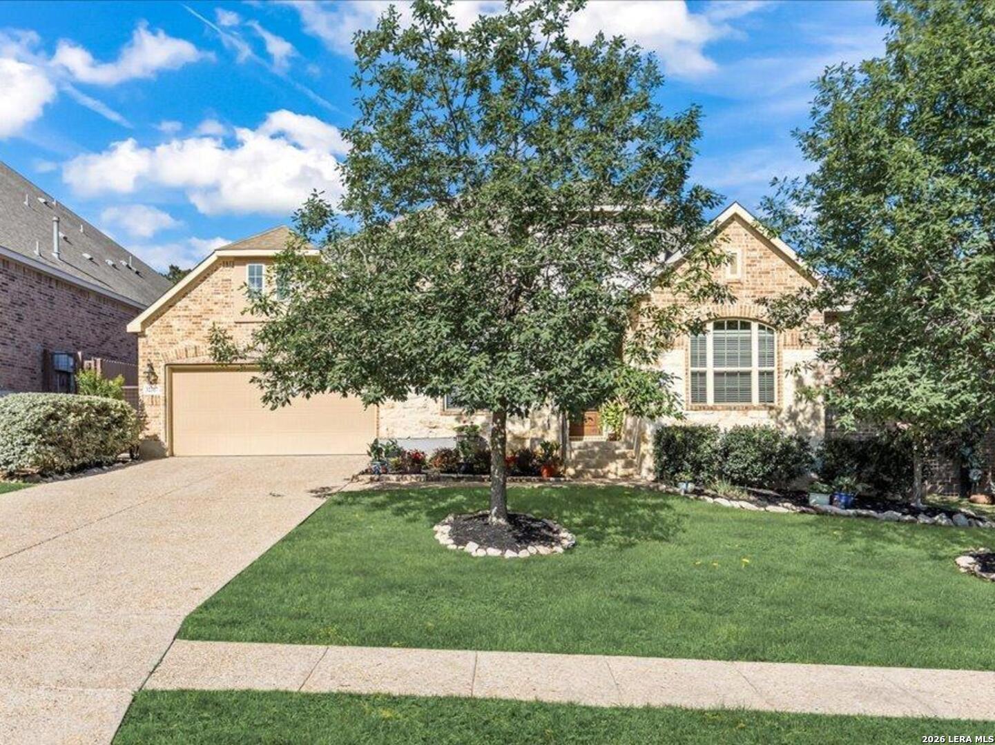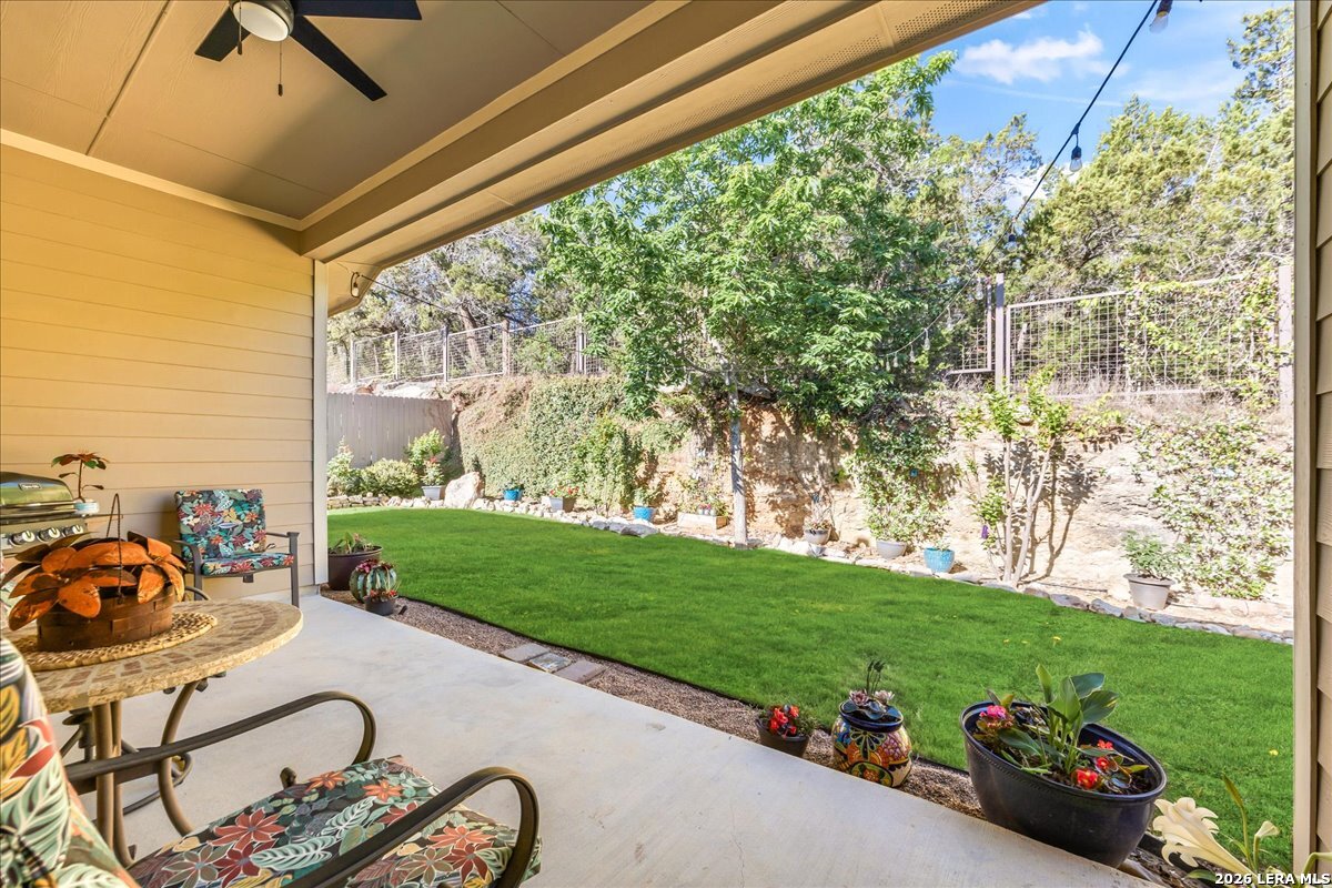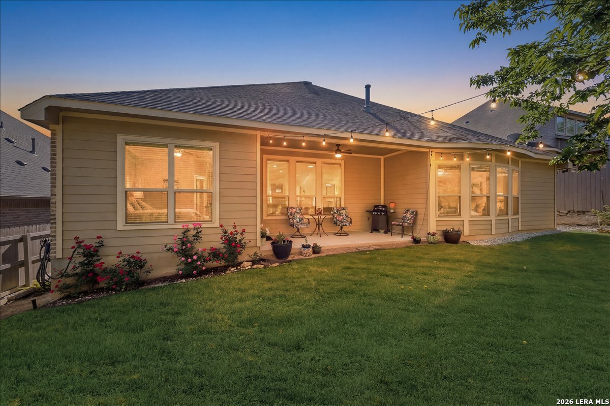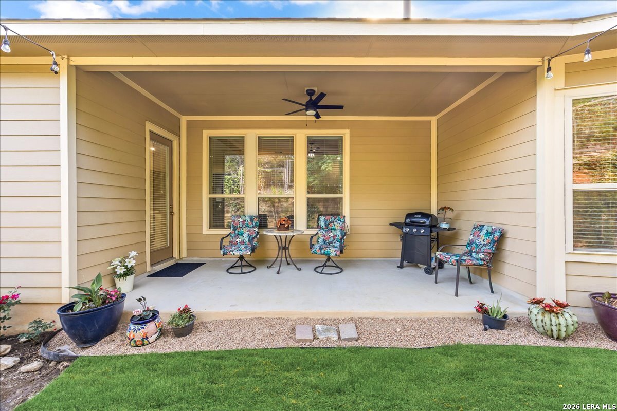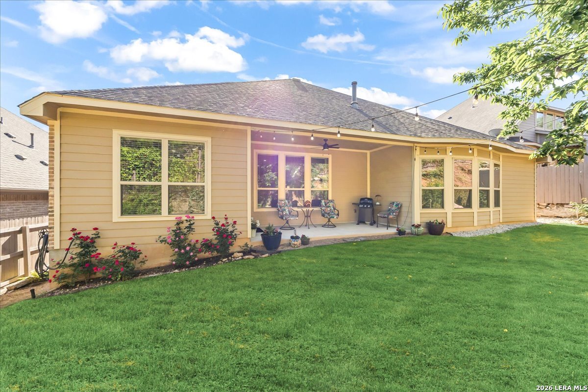 Stunning one story home in a gated section of Johnson Ranch, showcasing true pride of ownership throughout. This 4 bedroom, 3 full bathroom home offers a functional layout with comfortable, easy living all on one level; perfect for buyers looking for space, privacy, and convenience. As you enter, you are welcomed by abundant natural light that fills the open living areas, creating a bright and inviting feel. High ceilings throughout the home enhance the sense of space and provide a light, airy environment. The spacious family room, anchored by a cozy fireplace, flows seamlessly into the kitchen, making it ideal for both everyday living and entertaining. A dedicated dining room with hardwood floors is perfect for holiday gatherings, while the private office or flex space features double doors for added privacy and can easily serve as a home office, media room, or playroom depending on your needs. The kitchen is designed with both style and function in mind, featuring gas cooking, a newly installed dishwasher, a large walk-in pantry, and a butler's pantry for added storage and prep space. The breakfast nook offers plenty of room for casual dining and overlooks the main living area, making it easy to stay connected. Tucked away at the back of the home for added privacy, the spacious primary suite offers a relaxing retreat. The primary bathroom includes dual vanities, a standalone shower, and a garden tub, along with a generous layout that enhances comfort. Two secondary bedrooms share a convenient Jack and Jill bathroom, while the fourth bedroom is ideal for guests or additional living needs. Recent updates include freshly installed carpet in the primary bedroom and office. Step outside to enjoy a private backyard with blooming flowers, offering a peaceful setting for relaxing or entertaining outdoors. Storage and parking are not an issue, as this home features a three car tandem garage with ample space for vehicles and additional storage needs. Located in the highly desirable Comal ISD and within a sought-after community, this home also offers an easy access to Hwy 281, one of the main arteries connecting to San Antonio. Combining location, layout, and features that today's buyers are searching for such as open floor plan, high ceilings, natural light, gas cooking, and flexible living spaces; this is a great opportunity to own a well-maintained home in Johnson Ranch. Welcome home!
