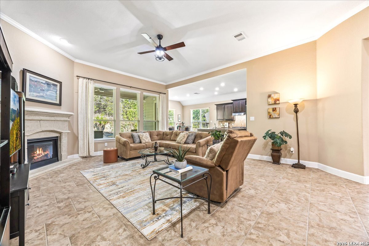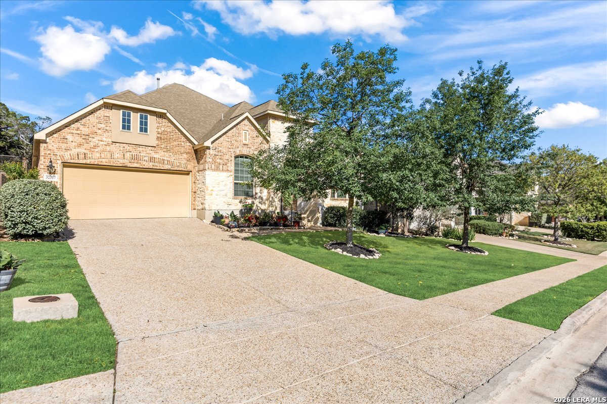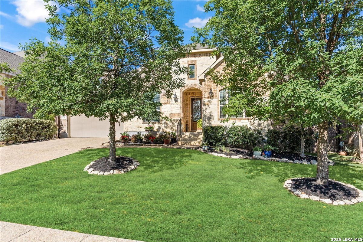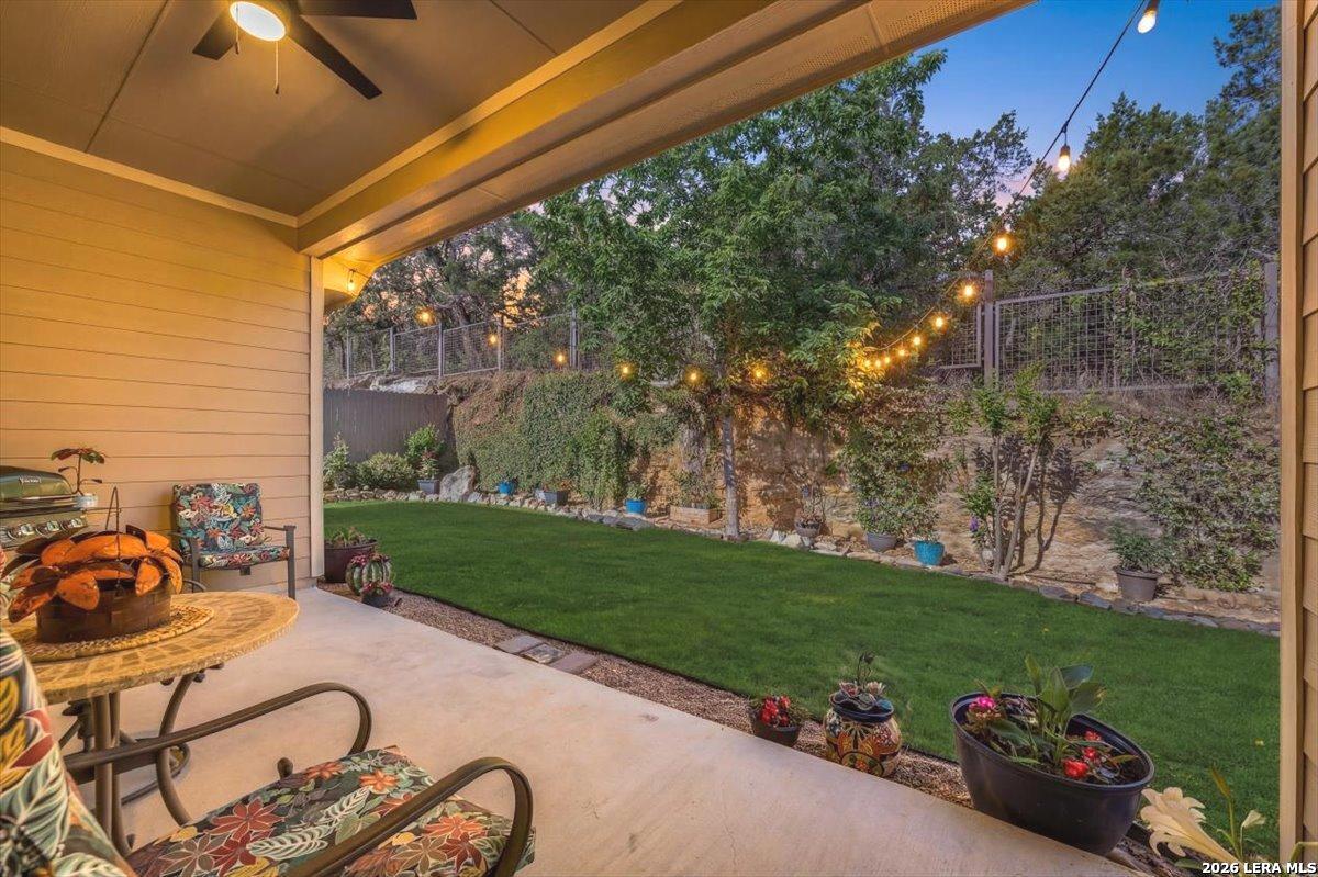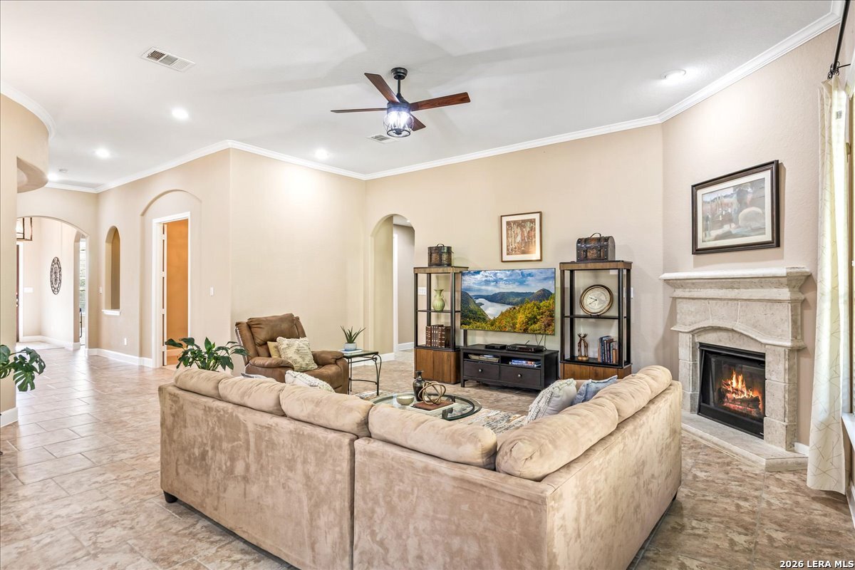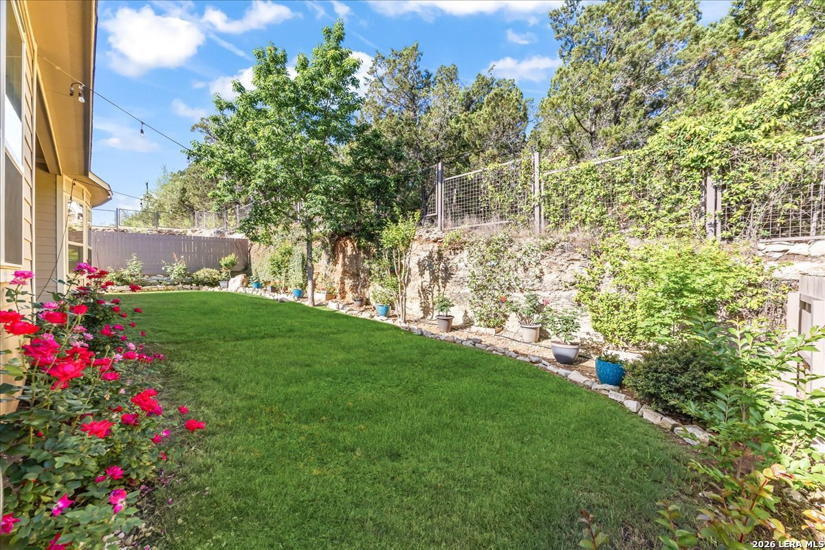 Stunning one story home in a gated section of Johnson Ranch, showcasing true pride of ownership throughout. This 4 bedroom, 3 full bathroom home offers a functional layout with comfortable, easy living all on one level; perfect for buyers looking for space, privacy, and convenience. As you enter, you are welcomed by abundant natural light that fills the open living areas, creating a bright and inviting feel. High ceilings throughout the home enhance the sense of space and provide a light, airy environment. The spacious family room, anchored by a cozy fireplace, flows seamlessly into the kitchen, making it ideal for both everyday living and entertaining. A dedicated dining room with hardwood floors is perfect for holiday gatherings, while the private office or flex space features double doors for added privacy and can easily serve as a home office, media room, or playroom depending on your needs. The kitchen is designed with both style and function in mind, featuring gas cooking, a newly installed dishwasher, a large walk-in pantry, and a butler's pantry for added storage and prep space. The breakfast nook offers plenty of room for casual dining and overlooks the main living area, making it easy to stay connected. Tucked away at the back of the home for added privacy, the spacious primary suite offers a relaxing retreat. The primary bathroom includes dual vanities, a standalone shower, and a garden tub, along with a generous layout that enhances comfort. Two secondary bedrooms share a convenient Jack and Jill bathroom, while the fourth bedroom is ideal for guests or additional living needs. Recent updates include freshly installed carpet in the primary bedroom and office. Step outside to enjoy a private backyard with blooming flowers, offering a peaceful setting for relaxing or entertaining outdoors. Storage and parking are not an issue, as this home features a three car tandem garage with ample space for vehicles and additional storage needs. Located in the highly desirable Comal ISD and within a sought-after community, this home also offers an easy access to Hwy 281, one of the main arteries connecting to San Antonio. Combining location, layout, and features that today's buyers are searching for such as open floor plan, high ceilings, natural light, gas cooking, and flexible living spaces; this is a great opportunity to own a well-maintained home in Johnson Ranch. Welcome home!