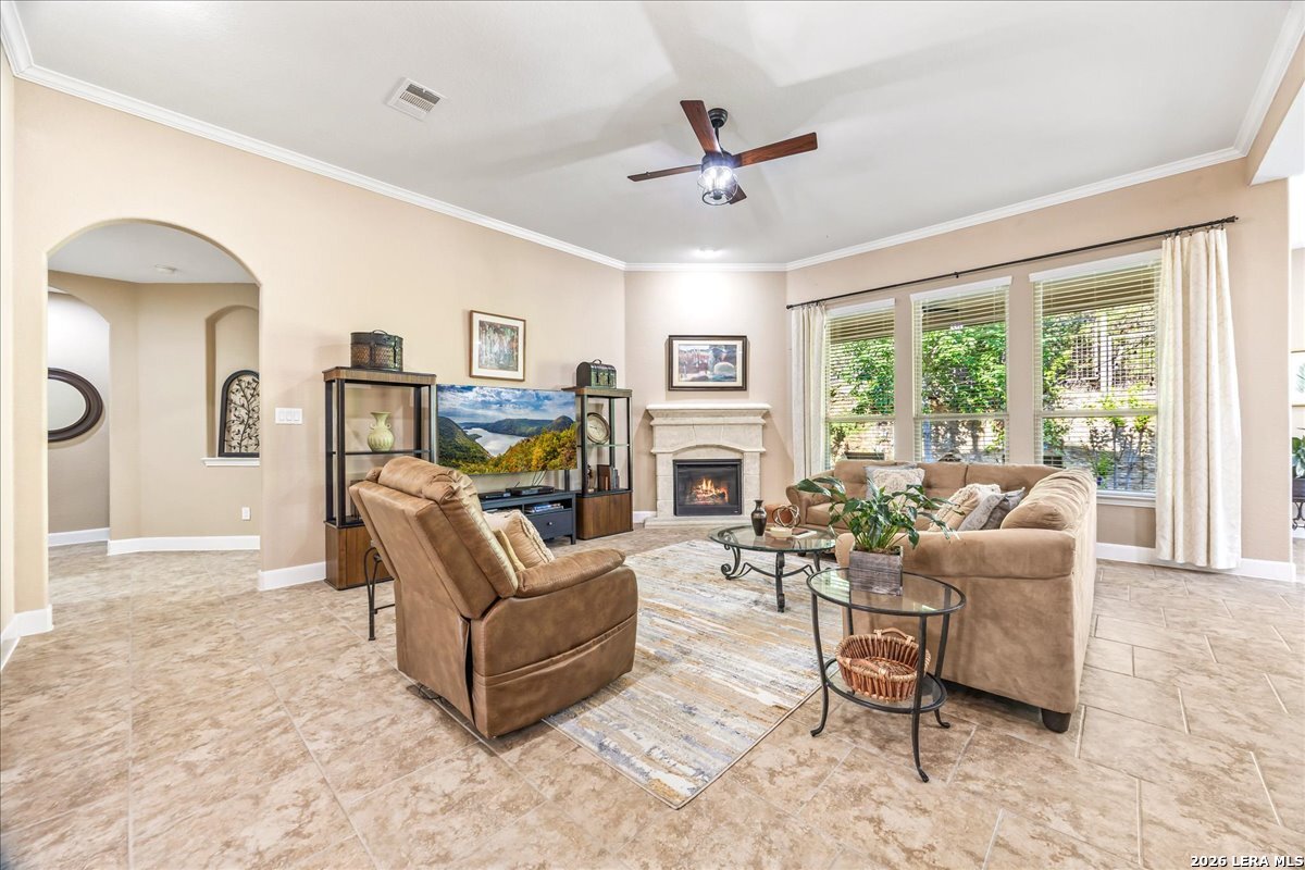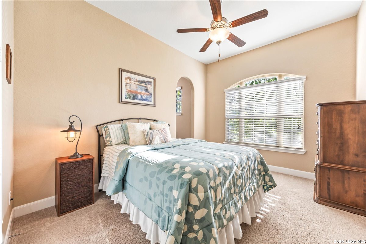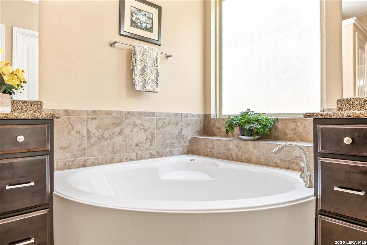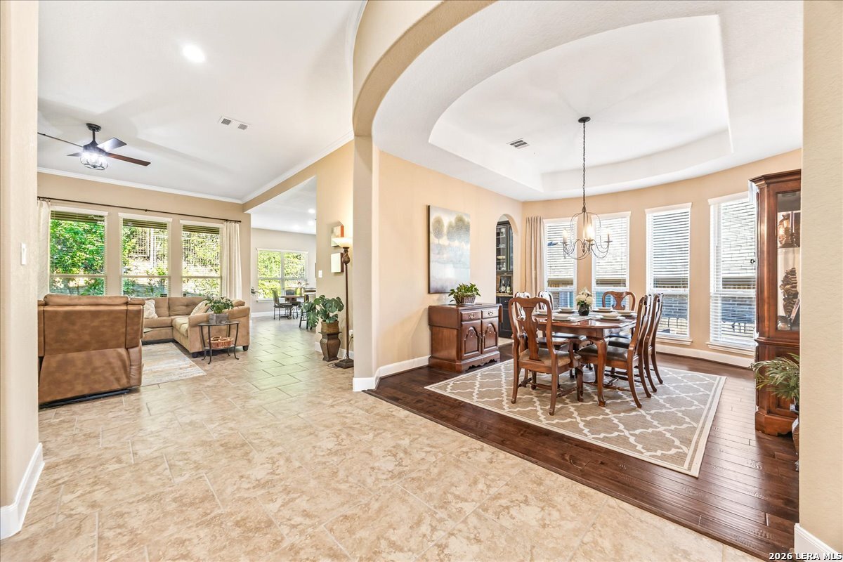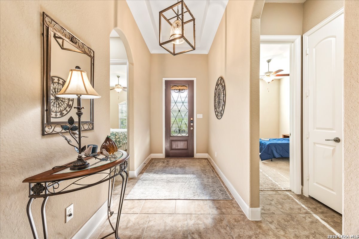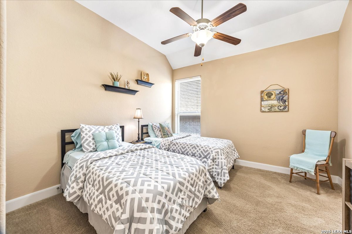 Stunning one story home in a gated section of Johnson Ranch, showcasing true pride of ownership throughout. This 4 bedroom, 3 full bathroom home offers a functional layout with comfortable, easy living all on one level; perfect for buyers looking for space, privacy, and convenience. As you enter, you are welcomed by abundant natural light that fills the open living areas, creating a bright and inviting feel. High ceilings throughout the home enhance the sense of space and provide a light, airy environment. The spacious family room, anchored by a cozy fireplace, flows seamlessly into the kitchen, making it ideal for both everyday living and entertaining. A dedicated dining room with hardwood floors is perfect for holiday gatherings, while the private office or flex space features double doors for added privacy and can easily serve as a home office, media room, or playroom depending on your needs. The kitchen is designed with both style and function in mind, featuring gas cooking, a newly installed dishwasher, a large walk-in pantry, and a butler's pantry for added storage and prep space. The breakfast nook offers plenty of room for casual dining and overlooks the main living area, making it easy to stay connected. Tucked away at the back of the home for added privacy, the spacious primary suite offers a relaxing retreat. The primary bathroom includes dual vanities, a standalone shower, and a garden tub, along with a generous layout that enhances comfort. Two secondary bedrooms share a convenient Jack and Jill bathroom, while the fourth bedroom is ideal for guests or additional living needs. Recent updates include freshly installed carpet in the primary bedroom and office. Step outside to enjoy a private backyard with blooming flowers, offering a peaceful setting for relaxing or entertaining outdoors. Storage and parking are not an issue, as this home features a three car tandem garage with ample space for vehicles and additional storage needs. Located in the highly desirable Comal ISD and within a sought-after community, this home also offers an easy access to Hwy 281, one of the main arteries connecting to San Antonio. Combining location, layout, and features that today's buyers are searching for such as open floor plan, high ceilings, natural light, gas cooking, and flexible living spaces; this is a great opportunity to own a well-maintained home in Johnson Ranch. Welcome home!