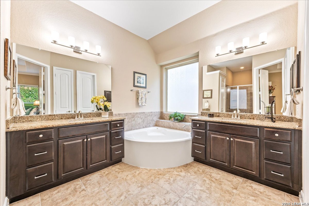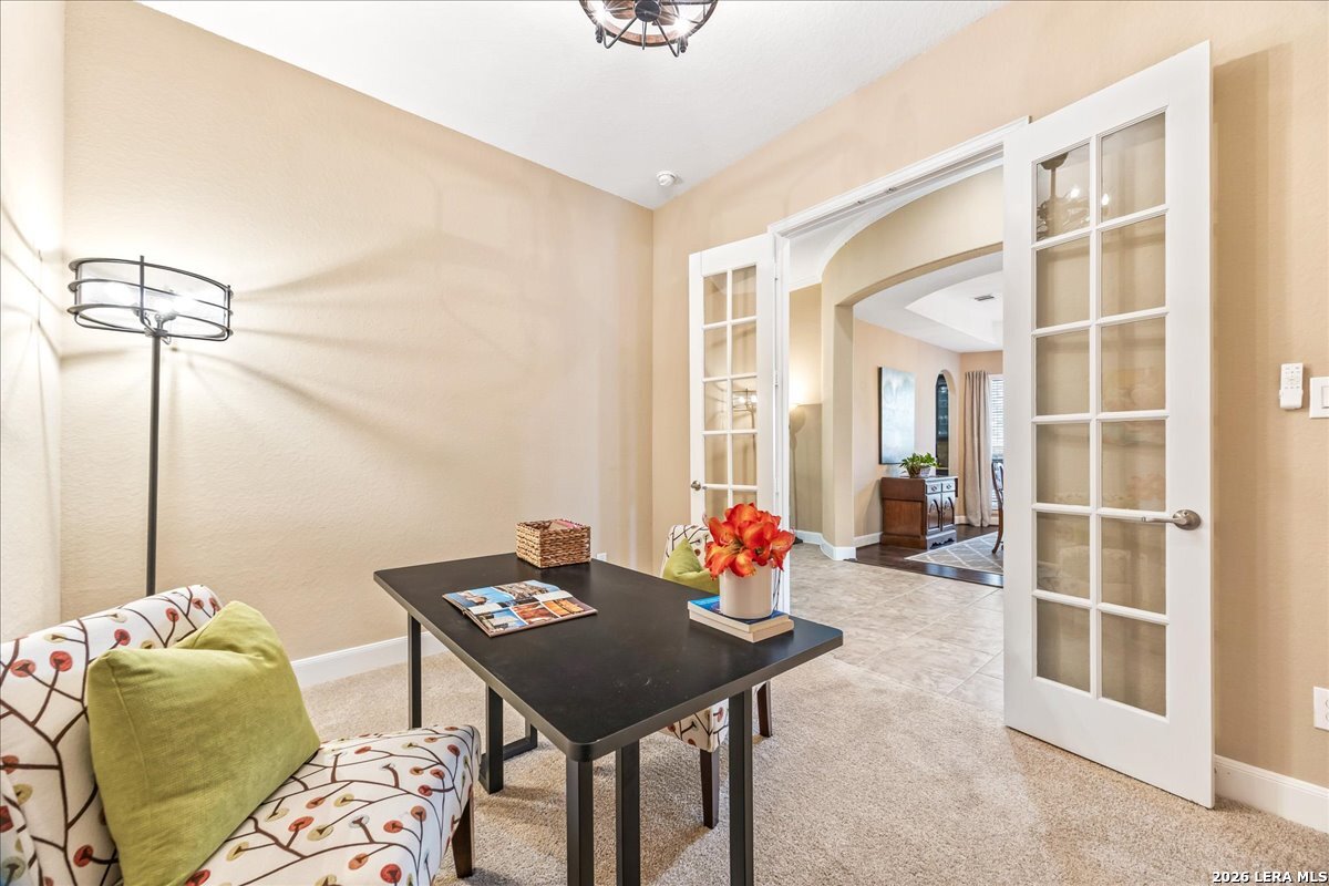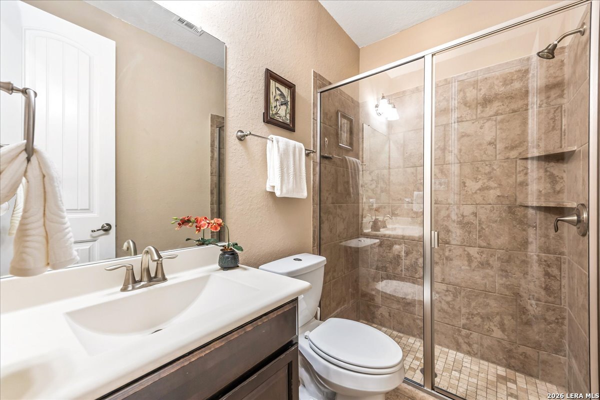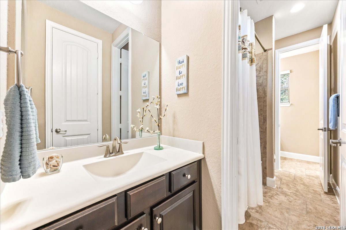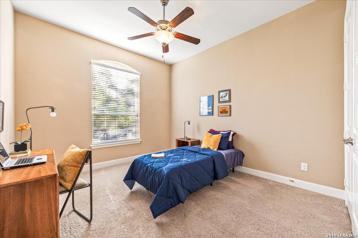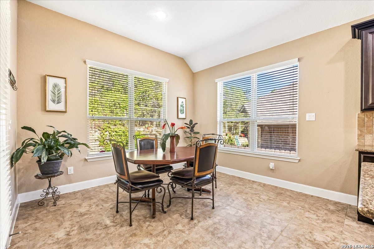 Stunning one story home in a gated section of Johnson Ranch, showcasing true pride of ownership throughout. This 4 bedroom, 3 full bathroom home offers a functional layout with comfortable, easy living all on one level; perfect for buyers looking for space, privacy, and convenience. As you enter, you are welcomed by abundant natural light that fills the open living areas, creating a bright and inviting feel. High ceilings throughout the home enhance the sense of space and provide a light, airy environment. The spacious family room, anchored by a cozy fireplace, flows seamlessly into the kitchen, making it ideal for both everyday living and entertaining. A dedicated dining room with hardwood floors is perfect for holiday gatherings, while the private office or flex space features double doors for added privacy and can easily serve as a home office, media room, or playroom depending on your needs. The kitchen is designed with both style and function in mind, featuring gas cooking, a newly installed dishwasher, a large walk-in pantry, and a butler's pantry for added storage and prep space. The breakfast nook offers plenty of room for casual dining and overlooks the main living area, making it easy to stay connected. Tucked away at the back of the home for added privacy, the spacious primary suite offers a relaxing retreat. The primary bathroom includes dual vanities, a standalone shower, and a garden tub, along with a generous layout that enhances comfort. Two secondary bedrooms share a convenient Jack and Jill bathroom, while the fourth bedroom is ideal for guests or additional living needs. Recent updates include freshly installed carpet in the primary bedroom and office. Step outside to enjoy a private backyard with blooming flowers, offering a peaceful setting for relaxing or entertaining outdoors. Storage and parking are not an issue, as this home features a three car tandem garage with ample space for vehicles and additional storage needs. Located in the highly desirable Comal ISD and within a sought-after community, this home also offers an easy access to Hwy 281, one of the main arteries connecting to San Antonio. Combining location, layout, and features that today's buyers are searching for such as open floor plan, high ceilings, natural light, gas cooking, and flexible living spaces; this is a great opportunity to own a well-maintained home in Johnson Ranch. Welcome home!