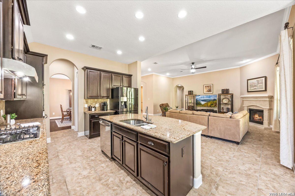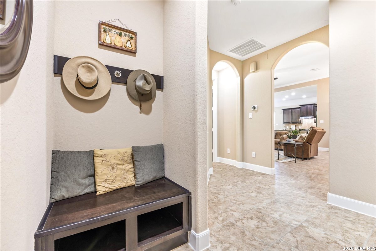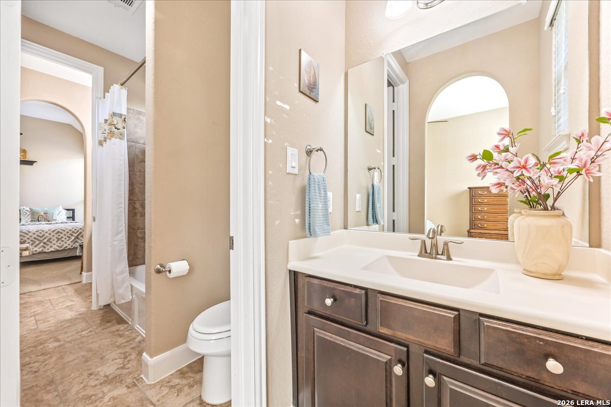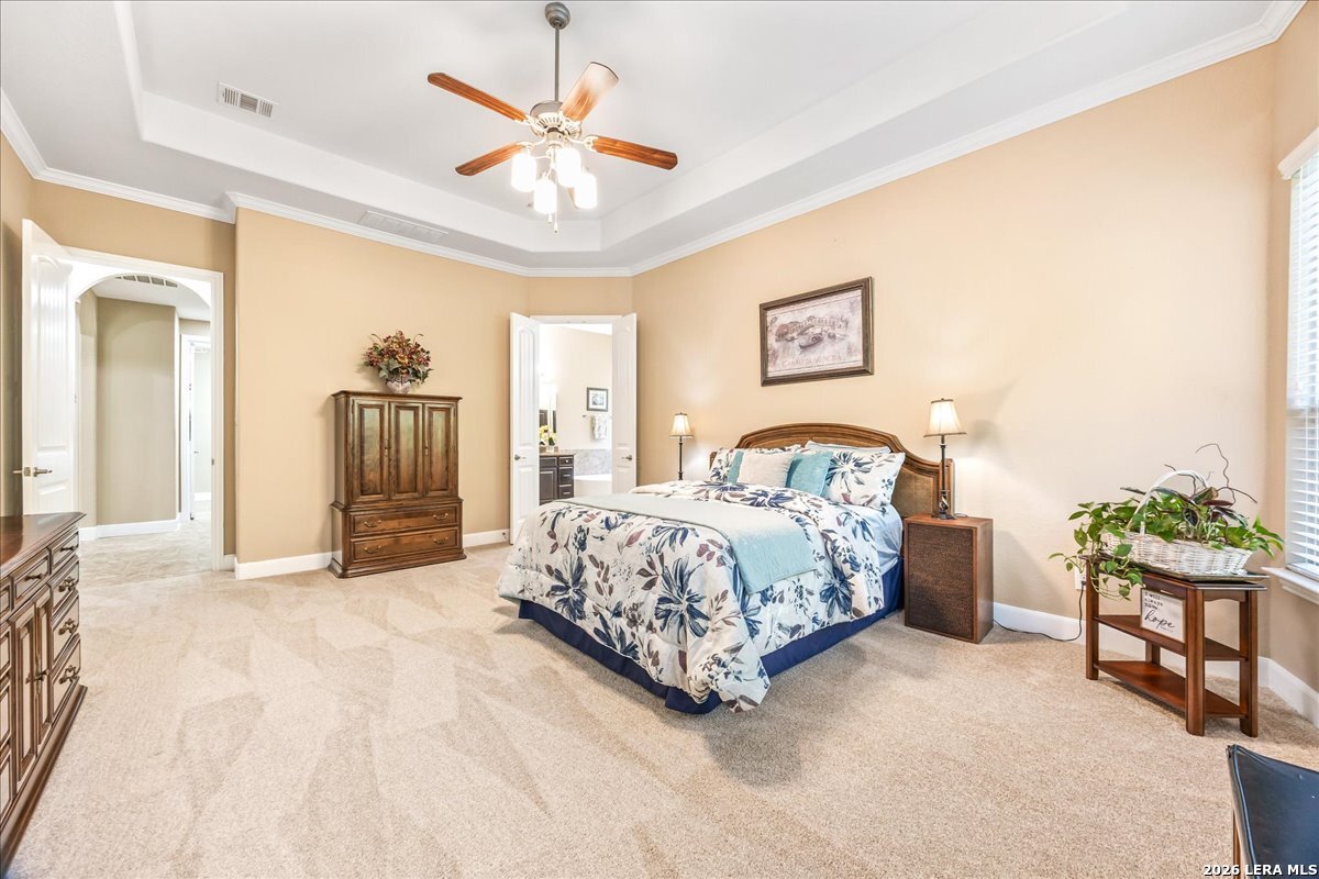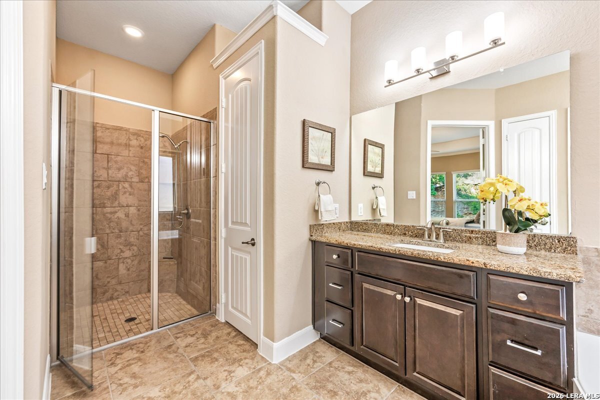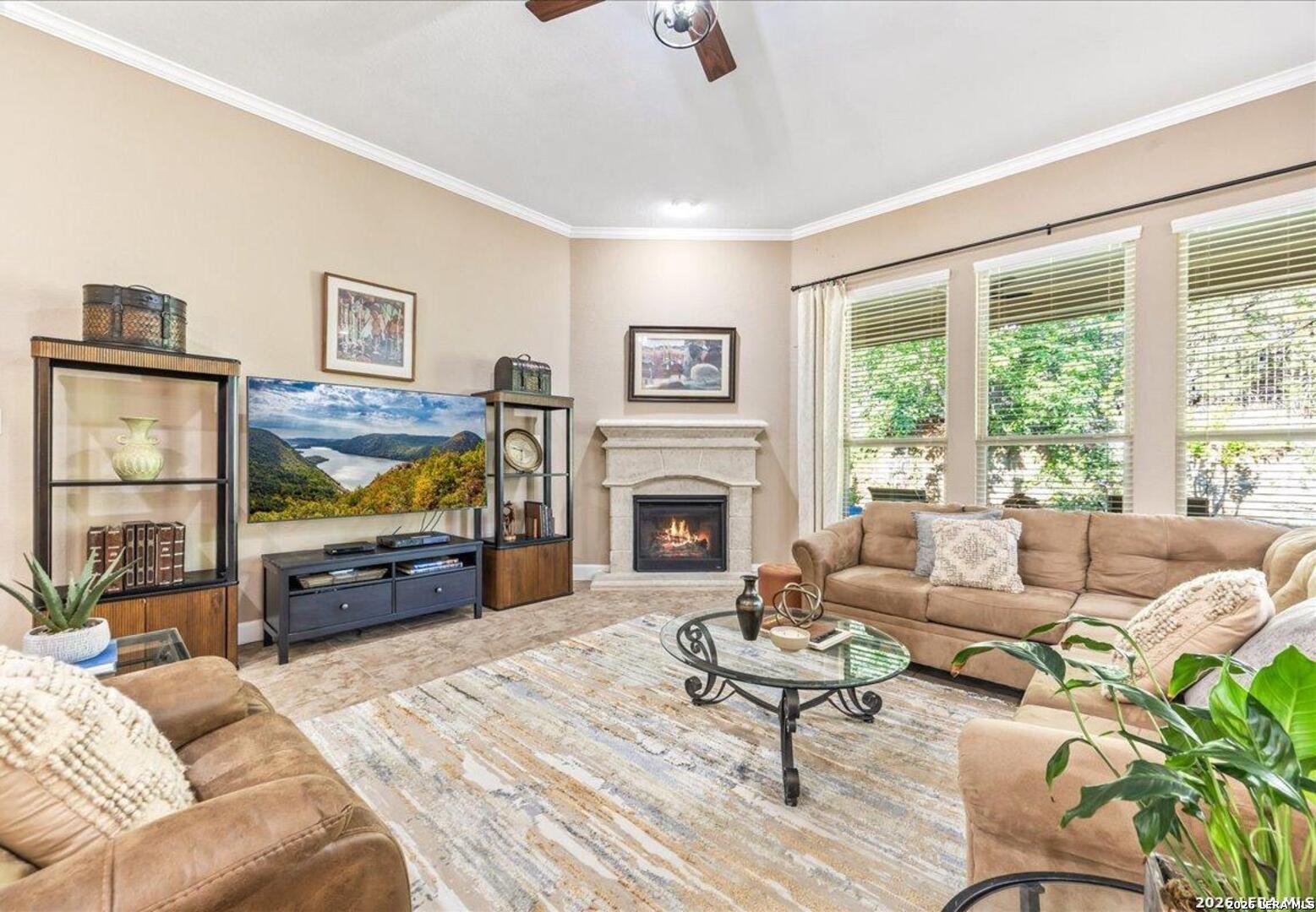 Stunning one story home in a gated section of Johnson Ranch, showcasing true pride of ownership throughout. This 4 bedroom, 3 full bathroom home offers a functional layout with comfortable, easy living all on one level; perfect for buyers looking for space, privacy, and convenience. As you enter, you are welcomed by abundant natural light that fills the open living areas, creating a bright and inviting feel. High ceilings throughout the home enhance the sense of space and provide a light, airy environment. The spacious family room, anchored by a cozy fireplace, flows seamlessly into the kitchen, making it ideal for both everyday living and entertaining. A dedicated dining room with hardwood floors is perfect for holiday gatherings, while the private office or flex space features double doors for added privacy and can easily serve as a home office, media room, or playroom depending on your needs. The kitchen is designed with both style and function in mind, featuring gas cooking, a newly installed dishwasher, a large walk-in pantry, and a butler's pantry for added storage and prep space. The breakfast nook offers plenty of room for casual dining and overlooks the main living area, making it easy to stay connected. Tucked away at the back of the home for added privacy, the spacious primary suite offers a relaxing retreat. The primary bathroom includes dual vanities, a standalone shower, and a garden tub, along with a generous layout that enhances comfort. Two secondary bedrooms share a convenient Jack and Jill bathroom, while the fourth bedroom is ideal for guests or additional living needs. Recent updates include freshly installed carpet in the primary bedroom and office. Step outside to enjoy a private backyard with blooming flowers, offering a peaceful setting for relaxing or entertaining outdoors. Storage and parking are not an issue, as this home features a three car tandem garage with ample space for vehicles and additional storage needs. Located in the highly desirable Comal ISD and within a sought-after community, this home also offers an easy access to Hwy 281, one of the main arteries connecting to San Antonio. Combining location, layout, and features that today's buyers are searching for such as open floor plan, high ceilings, natural light, gas cooking, and flexible living spaces; this is a great opportunity to own a well-maintained home in Johnson Ranch. Welcome home!