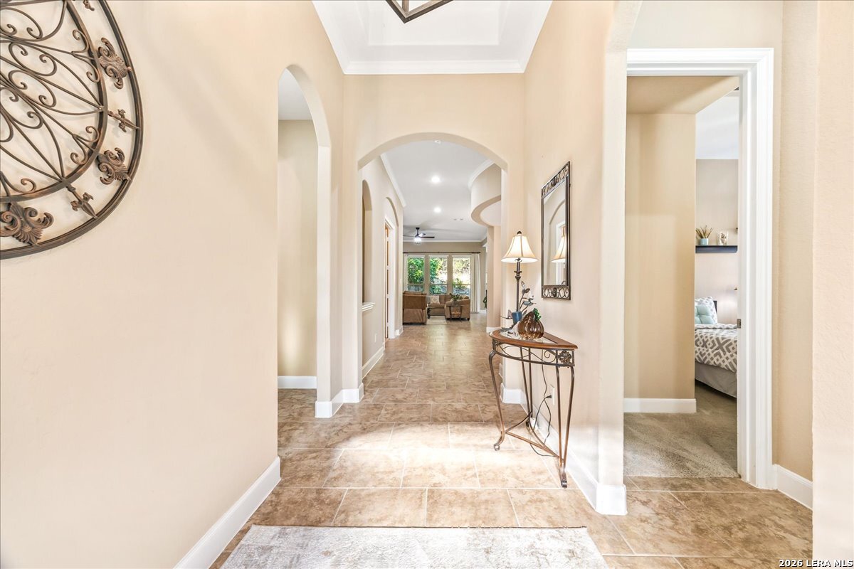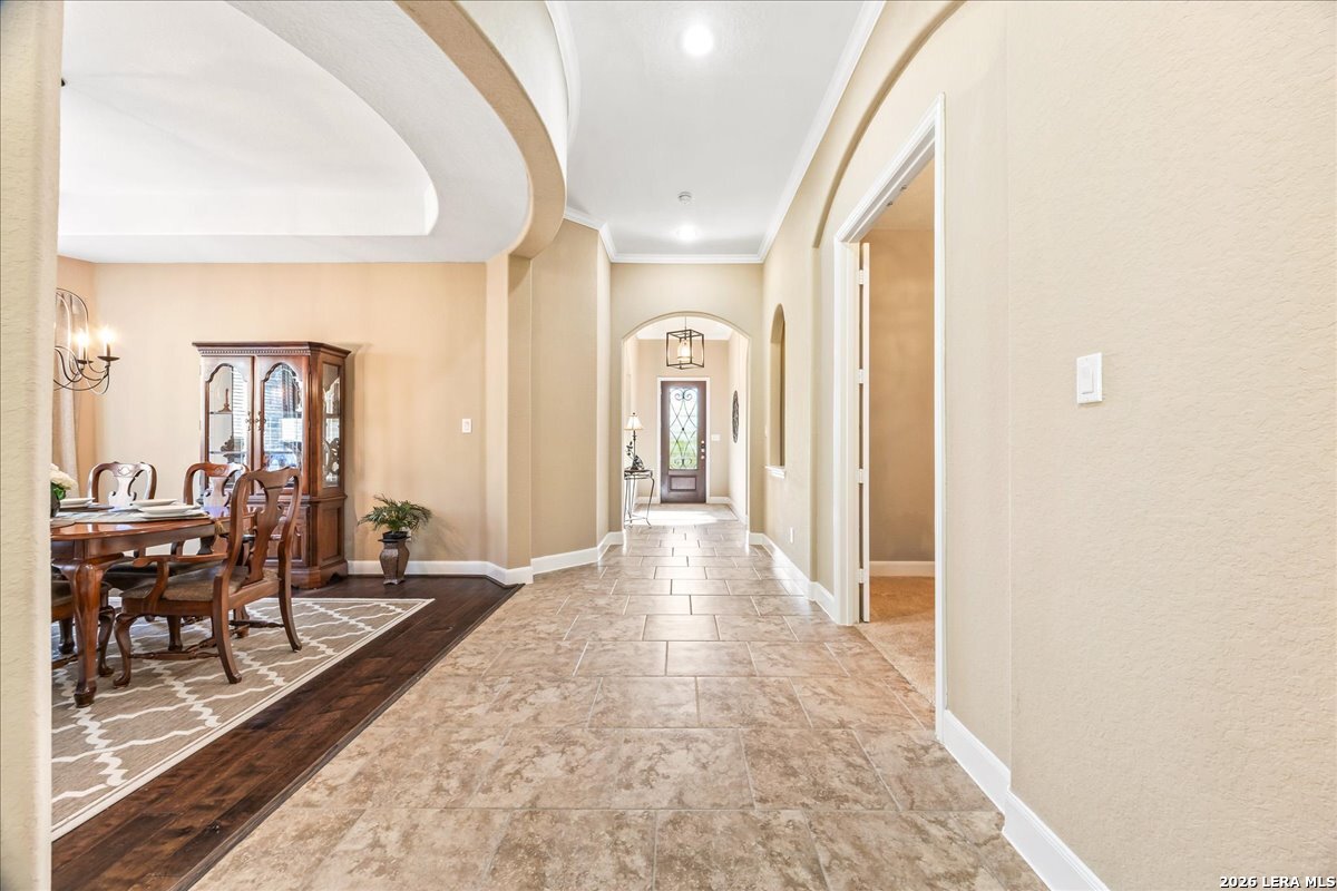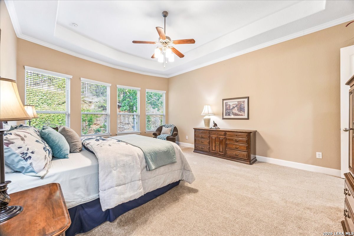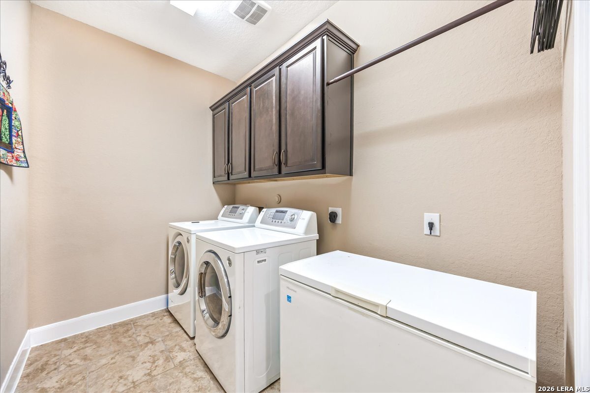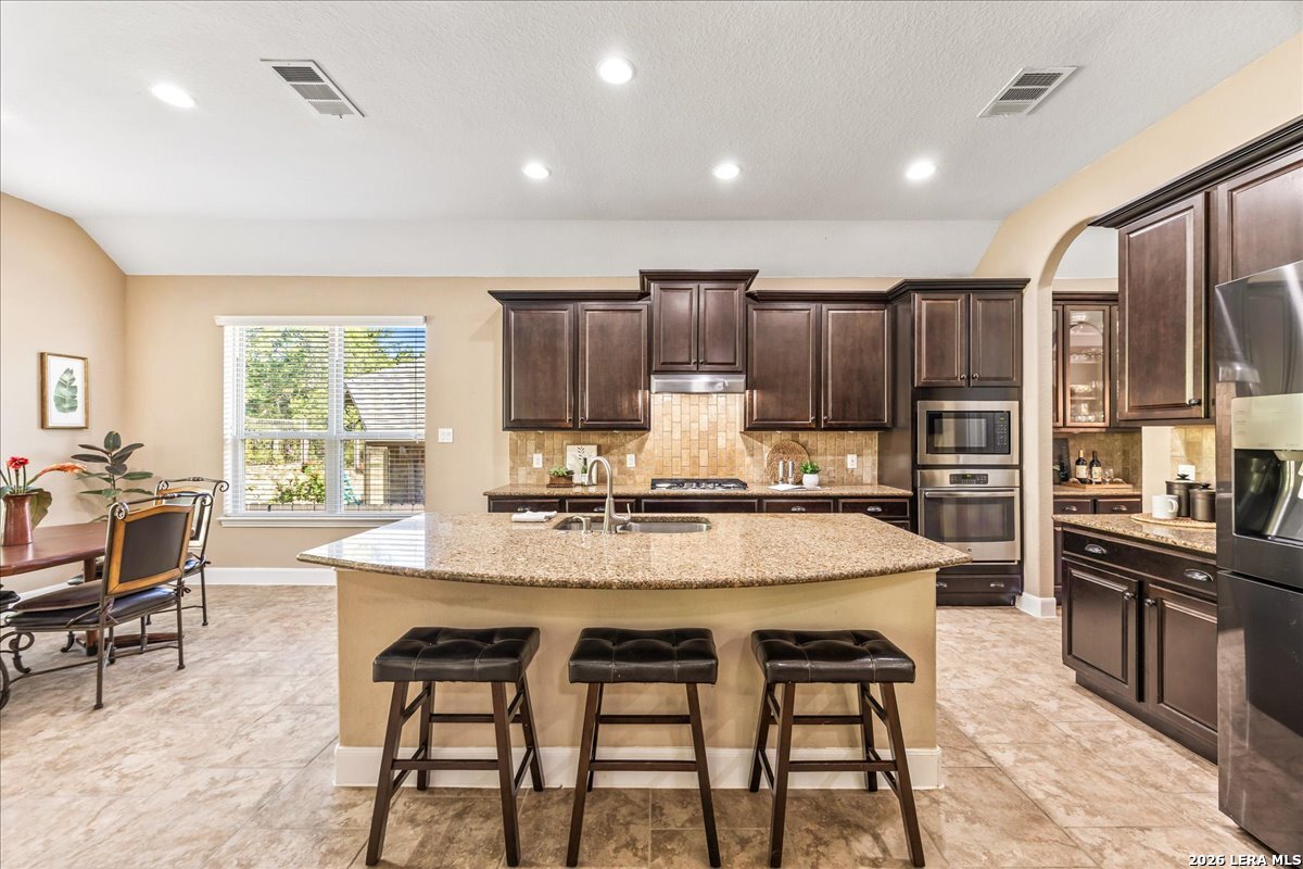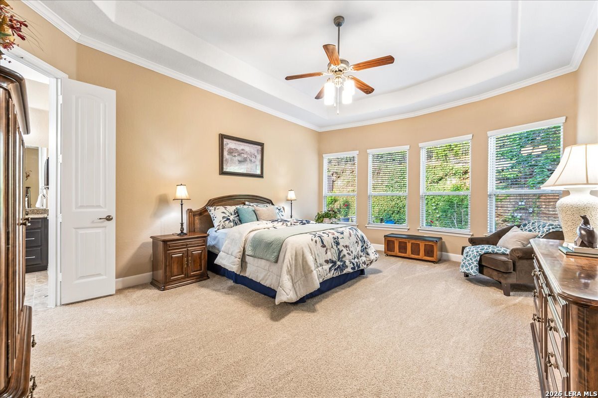 Stunning one story home in a gated section of Johnson Ranch, showcasing true pride of ownership throughout. This 4 bedroom, 3 full bathroom home offers a functional layout with comfortable, easy living all on one level; perfect for buyers looking for space, privacy, and convenience. As you enter, you are welcomed by abundant natural light that fills the open living areas, creating a bright and inviting feel. High ceilings throughout the home enhance the sense of space and provide a light, airy environment. The spacious family room, anchored by a cozy fireplace, flows seamlessly into the kitchen, making it ideal for both everyday living and entertaining. A dedicated dining room with hardwood floors is perfect for holiday gatherings, while the private office or flex space features double doors for added privacy and can easily serve as a home office, media room, or playroom depending on your needs. The kitchen is designed with both style and function in mind, featuring gas cooking, a newly installed dishwasher, a large walk-in pantry, and a butler's pantry for added storage and prep space. The breakfast nook offers plenty of room for casual dining and overlooks the main living area, making it easy to stay connected. Tucked away at the back of the home for added privacy, the spacious primary suite offers a relaxing retreat. The primary bathroom includes dual vanities, a standalone shower, and a garden tub, along with a generous layout that enhances comfort. Two secondary bedrooms share a convenient Jack and Jill bathroom, while the fourth bedroom is ideal for guests or additional living needs. Recent updates include freshly installed carpet in the primary bedroom and office. Step outside to enjoy a private backyard with blooming flowers, offering a peaceful setting for relaxing or entertaining outdoors. Storage and parking are not an issue, as this home features a three car tandem garage with ample space for vehicles and additional storage needs. Located in the highly desirable Comal ISD and within a sought-after community, this home also offers an easy access to Hwy 281, one of the main arteries connecting to San Antonio. Combining location, layout, and features that today's buyers are searching for such as open floor plan, high ceilings, natural light, gas cooking, and flexible living spaces; this is a great opportunity to own a well-maintained home in Johnson Ranch. Welcome home!
