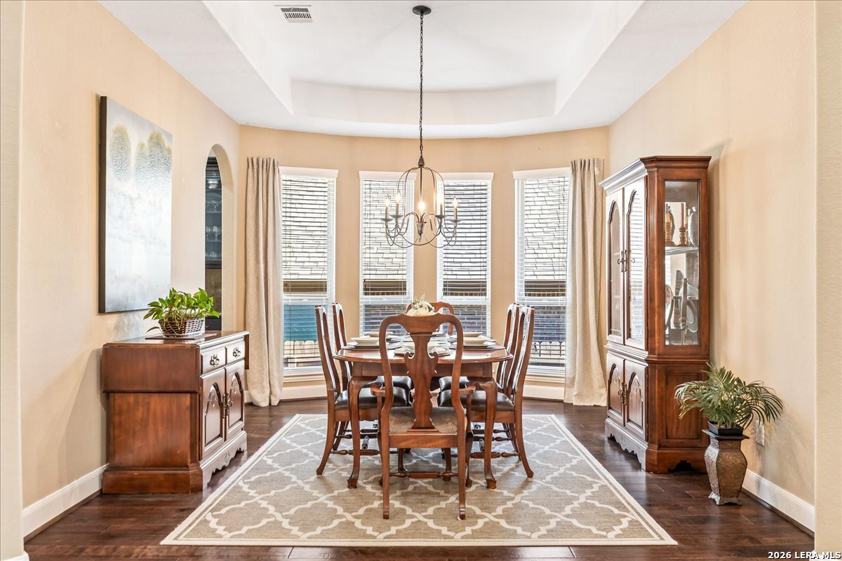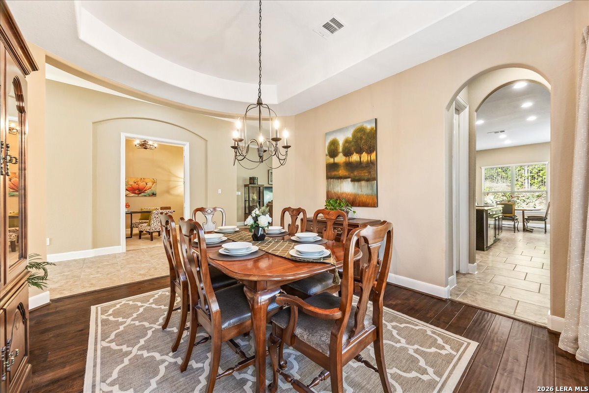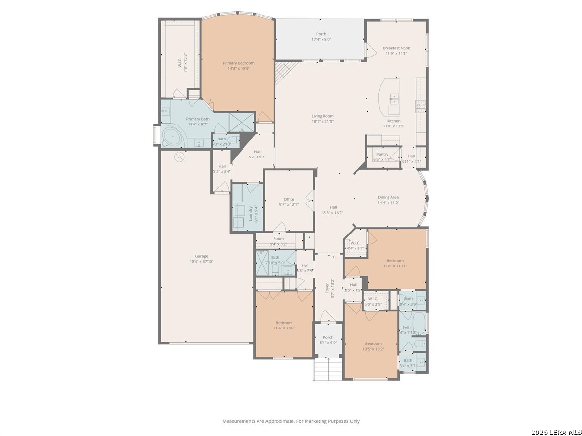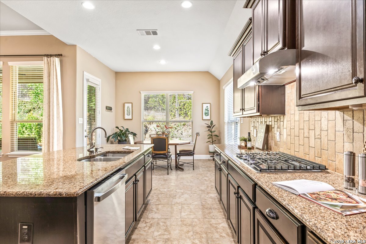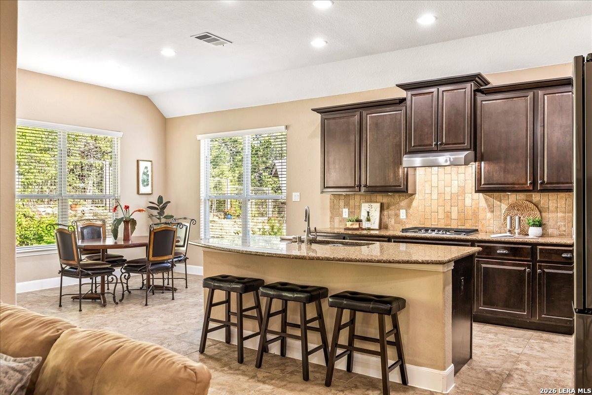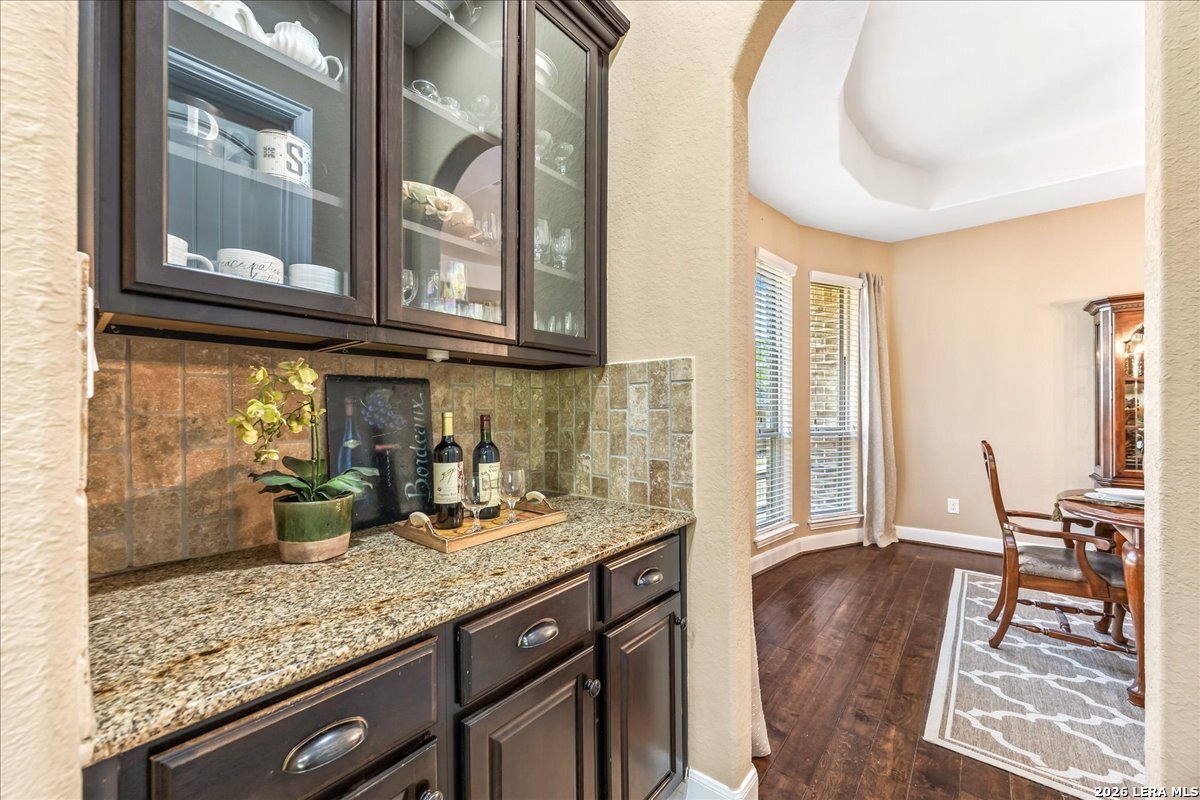 Stunning one story home in a gated section of Johnson Ranch, showcasing true pride of ownership throughout. This 4 bedroom, 3 full bathroom home offers a functional layout with comfortable, easy living all on one level; perfect for buyers looking for space, privacy, and convenience. As you enter, you are welcomed by abundant natural light that fills the open living areas, creating a bright and inviting feel. High ceilings throughout the home enhance the sense of space and provide a light, airy environment. The spacious family room, anchored by a cozy fireplace, flows seamlessly into the kitchen, making it ideal for both everyday living and entertaining. A dedicated dining room with hardwood floors is perfect for holiday gatherings, while the private office or flex space features double doors for added privacy and can easily serve as a home office, media room, or playroom depending on your needs. The kitchen is designed with both style and function in mind, featuring gas cooking, a newly installed dishwasher, a large walk-in pantry, and a butler's pantry for added storage and prep space. The breakfast nook offers plenty of room for casual dining and overlooks the main living area, making it easy to stay connected. Tucked away at the back of the home for added privacy, the spacious primary suite offers a relaxing retreat. The primary bathroom includes dual vanities, a standalone shower, and a garden tub, along with a generous layout that enhances comfort. Two secondary bedrooms share a convenient Jack and Jill bathroom, while the fourth bedroom is ideal for guests or additional living needs. Recent updates include freshly installed carpet in the primary bedroom and office. Step outside to enjoy a private backyard with blooming flowers, offering a peaceful setting for relaxing or entertaining outdoors. Storage and parking are not an issue, as this home features a three car tandem garage with ample space for vehicles and additional storage needs. Located in the highly desirable Comal ISD and within a sought-after community, this home also offers an easy access to Hwy 281, one of the main arteries connecting to San Antonio. Combining location, layout, and features that today's buyers are searching for such as open floor plan, high ceilings, natural light, gas cooking, and flexible living spaces; this is a great opportunity to own a well-maintained home in Johnson Ranch. Welcome home!