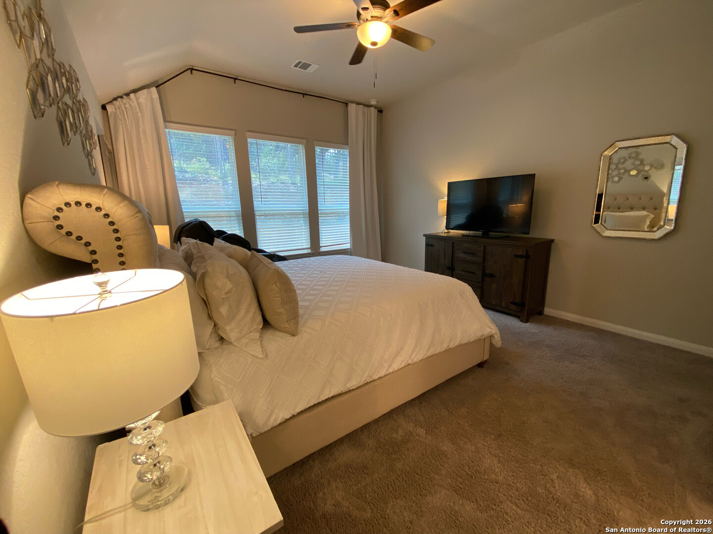This is the one buyers wait for. Located in the highly desirable gated Johnson Ranch community, this stunning home sits on a private cul de sac lot with no back neighbors, offering rare privacy and a true backyard retreat. The main level features four bedrooms and three full bathrooms, including a spacious primary suite, making this home ideal for everyday living without stairs. Soaring cathedral ceilings, an open concept layout, and tile flooring throughout the main living areas create a bright, expansive feel the moment you walk in. The chef inspired kitchen showcases quartz countertops and overlooks the living space, perfect for entertaining or family gatherings. Upstairs offers a versatile loft with a full bathroom and closet, currently used as a 5th bedroom, game room, or guest suite, providing flexibility for growing families, multigenerational living, or work from home needs. Step outside to a true backyard sanctuary featuring a retaining wall for added privacy, no rear neighbors, and a peaceful setting ideal for relaxing or hosting events. Additional highlights include a three car garage, tinted windows for energy efficiency, Kinetico water softener, reverse osmosis drinking water, full sprinkler irrigation system, and a newly added patio deck. The home may be available furnished for added convenience. Homes with this layout, privacy, and location are rare. Schedule your private showing today before it is gone.