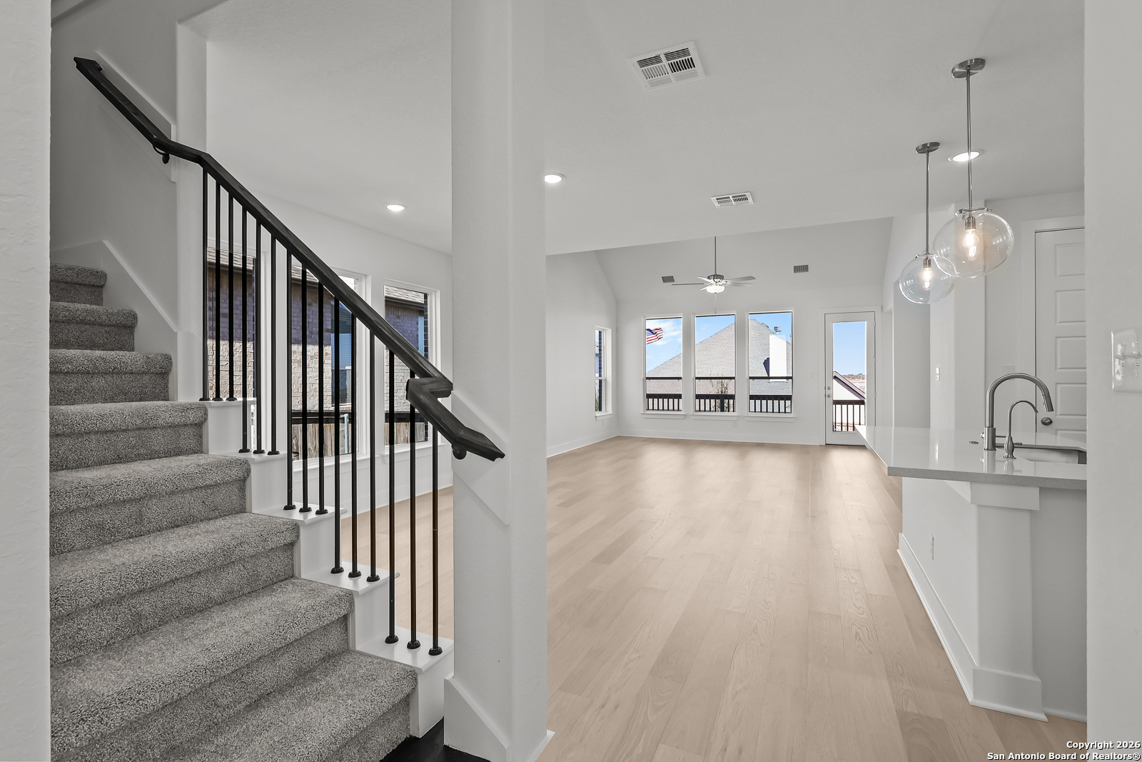 The Woodlake floorplan is an elegant two-story design that seamlessly combines practicality with charm. This spacious home offers four bedrooms and two and a half bathrooms, providing ample room for family and guests. The first floor invites you into a thoughtfully designed living space, perfect for both everyday living and entertaining. An open-concept layout connects the kitchen, dining area, and family room, creating a harmonious flow that suits any occasion.