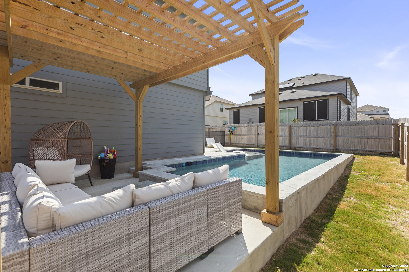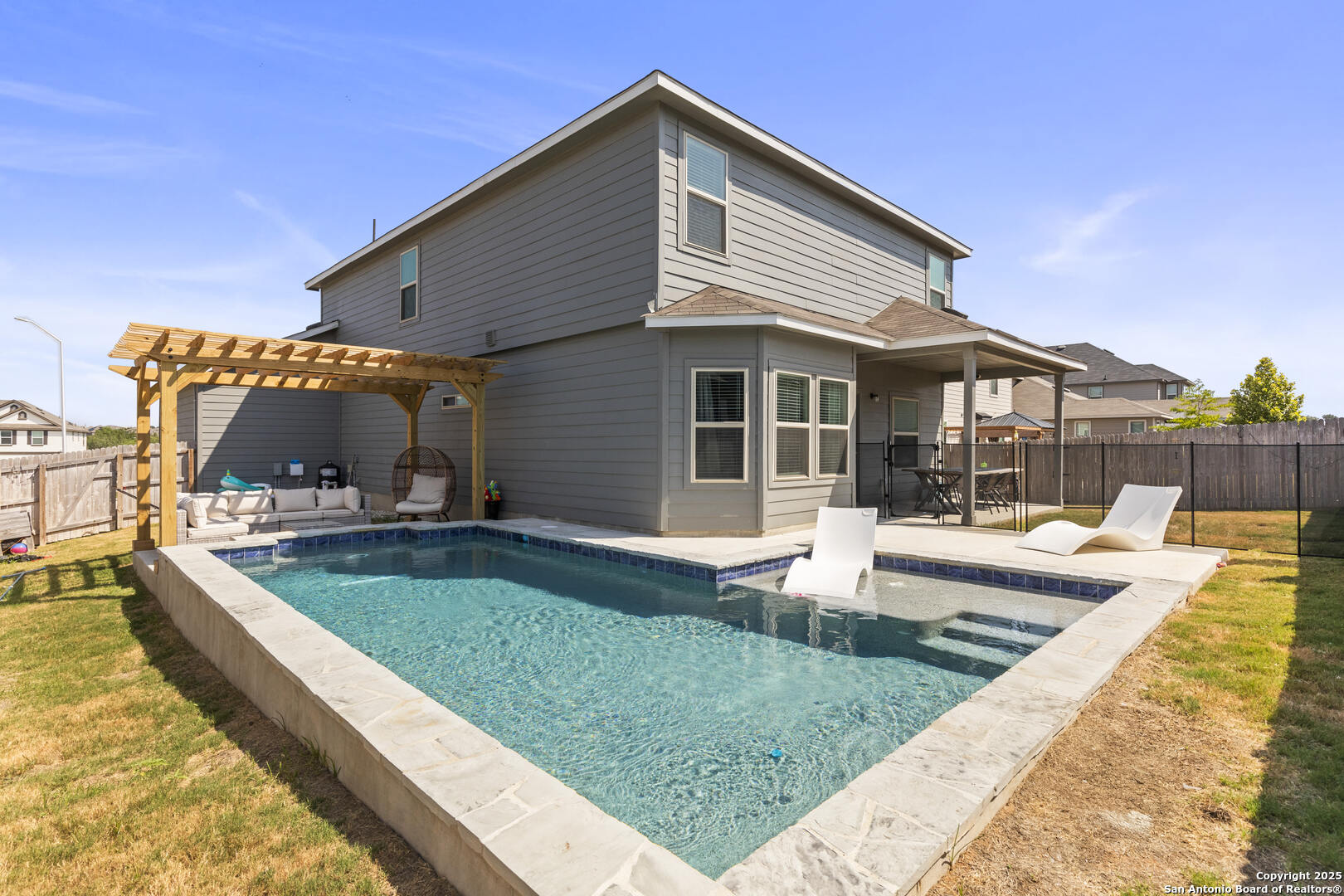 OPEN HOUSE SAT 13TH 2-4 PM. This stunning open-concept home is designed for both everyday living and unforgettable gatherings. At the heart of of the home, a chef's kitchen with custom wine cabinets and an oversized beverage fridge flows seamlessly into the dining area perfect for entertaining. The primary suite, located conveniently downstairs features a beautiful bay window with views of the sparkling inground 2024 SALTWATER pool. Upstairs discover a spacious loft, a dedicated media room and three stylish bedrooms with a designer accent wall plus a versatile office/bedroom flex space ideal for working from home, guests or hobbies. Step outside to your personal oasis: a saltwater pool under FULL WARRANTY, complete with lounging pergola for year-round enjoyment. Whether hosting a summer pool party or enjoying a quiet evening retreat, this backyard was made for memories.
