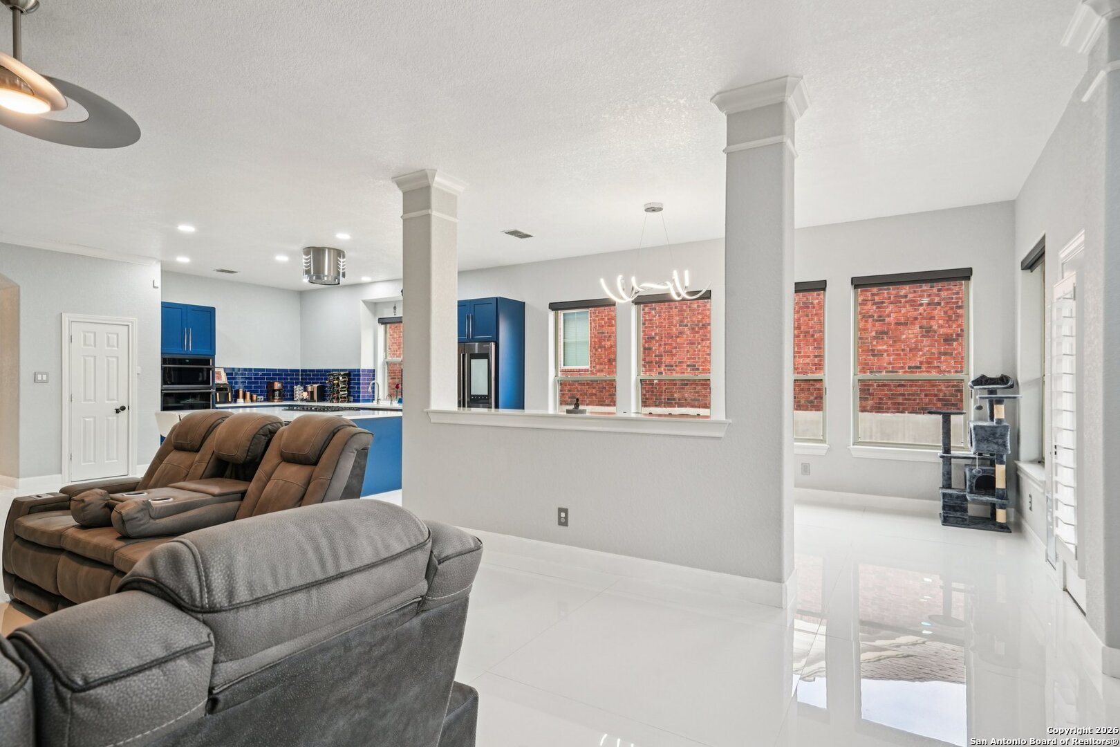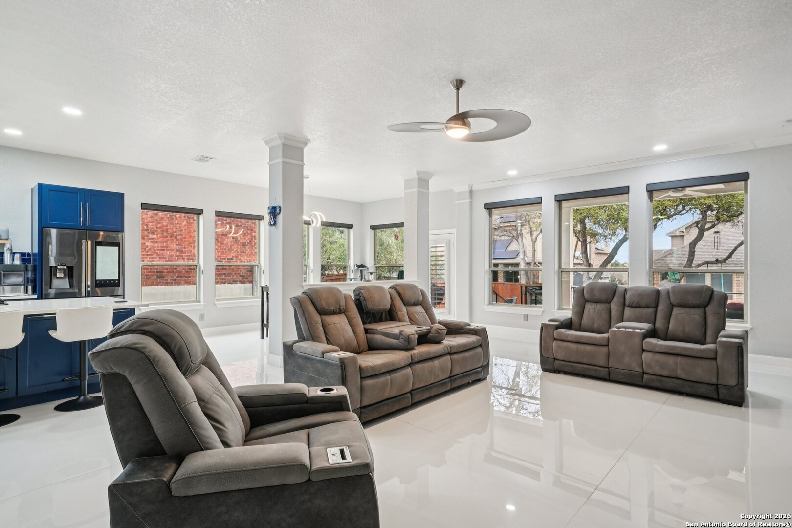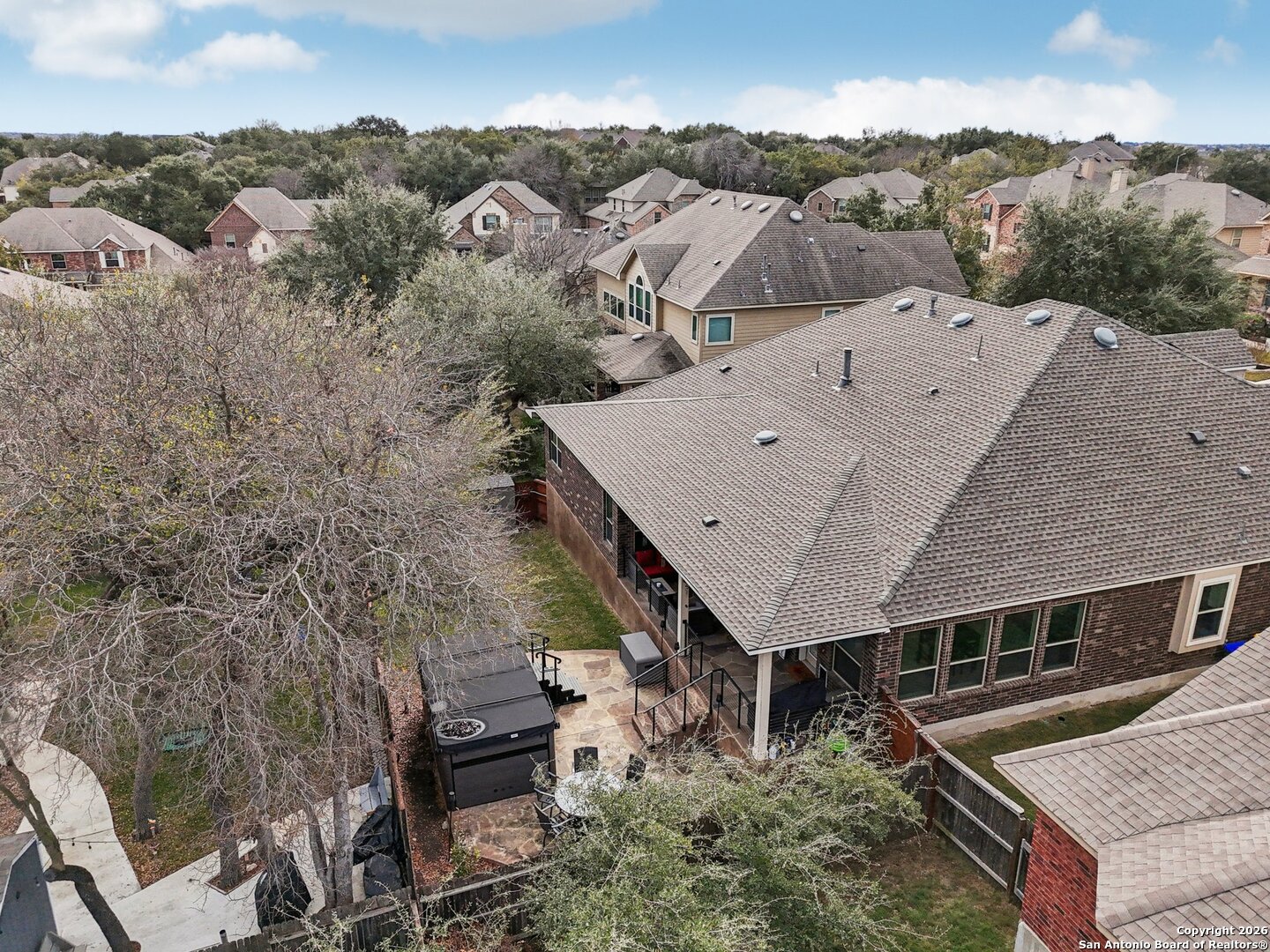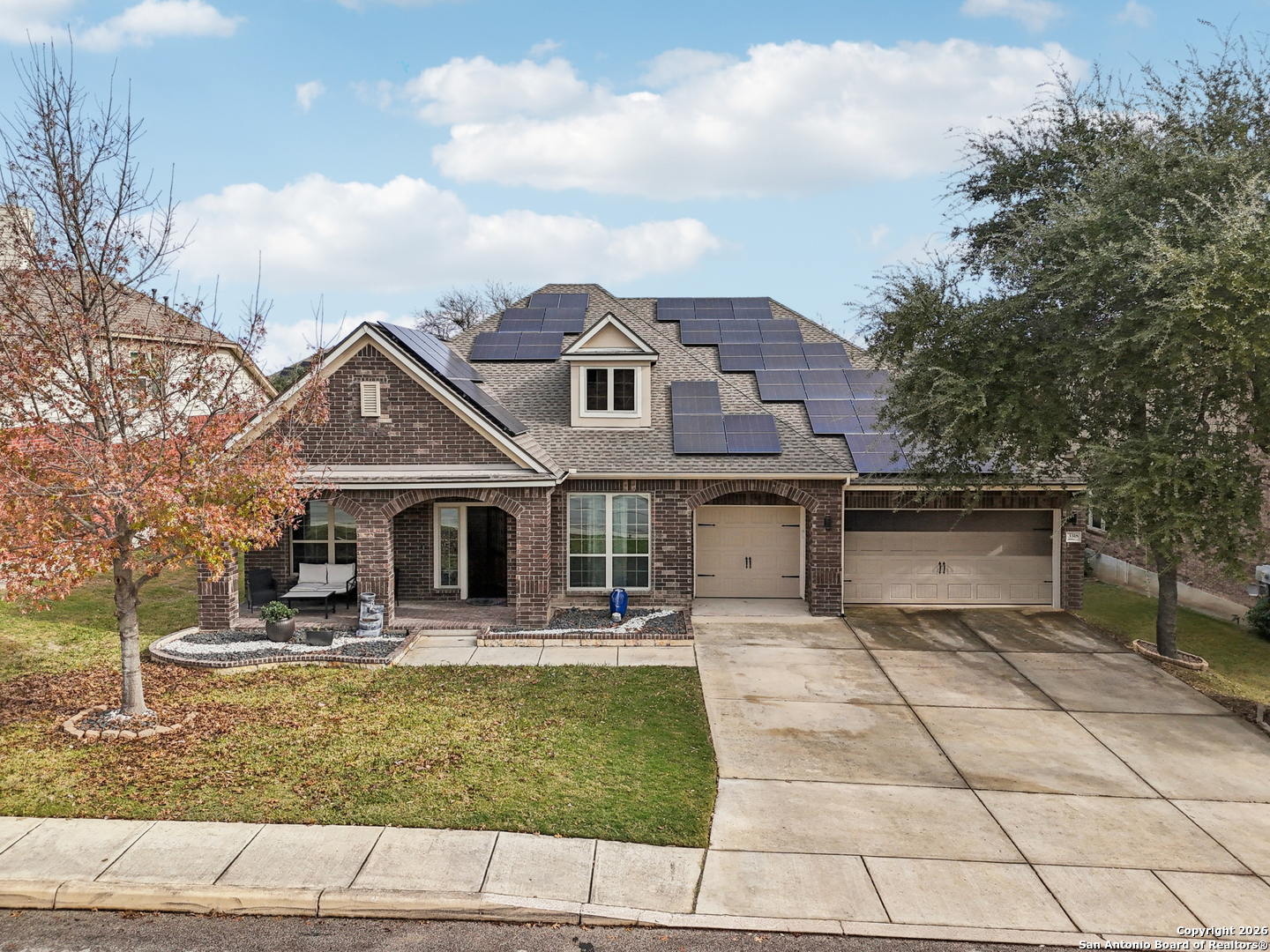 ** OPEN HOUSE on Saturday, 01/31/2026 from 11am-2pm ** Located within a gated community, this modern smart home delivers a refined blend of technology, design, and everyday functionality. Meticulously well kept, the residence features 4x4 white porcelain tile flooring throughout the main living areas, creating a clean and contemporary aesthetic. Elegant modern light fixtures and recessed lighting enhance the open layout and elevate the overall ambiance. The kitchen serves as a true centerpiece, offering quartz countertops, an oversized island with built in phone charging, and sleek stainless and black steel appliances. A gas stove paired with a retractable Faber vent combines performance with thoughtful design, making the space ideal for both entertaining and daily living. The primary suite provides a private retreat with a comfortable sitting area and a spa inspired bathroom featuring a large walk in shower, separate garden tub, and an expansive walk in closet. Two additional bedrooms are complemented by a flex room suitable for a home office, exercise room, or creative space. A dedicated theater room adds an additional layer of versatility and entertainment. Outdoors, the covered patio with ceiling fans creates an inviting extension of the living space. The backyard is highlighted by a Michael Phelps Signature Swim Spa that can function as a lap pool or convert to a hot tub, along with a convenient storage shed. The home is equipped with solar panels and advanced smart home technology, enhancing efficiency and comfort. The three car garage features epoxy flooring and built in heavy duty shelving for excellent organization and durability. Ideally positioned with easy access to Loop 1604 and Highway 151, the property is centrally located in the Alamo Ranch area near SeaWorld San Antonio, shopping, dining, and entertainment. Neighborhood amenities include a community pool, park, and playground. The property is part of the award winning NISD school district.
