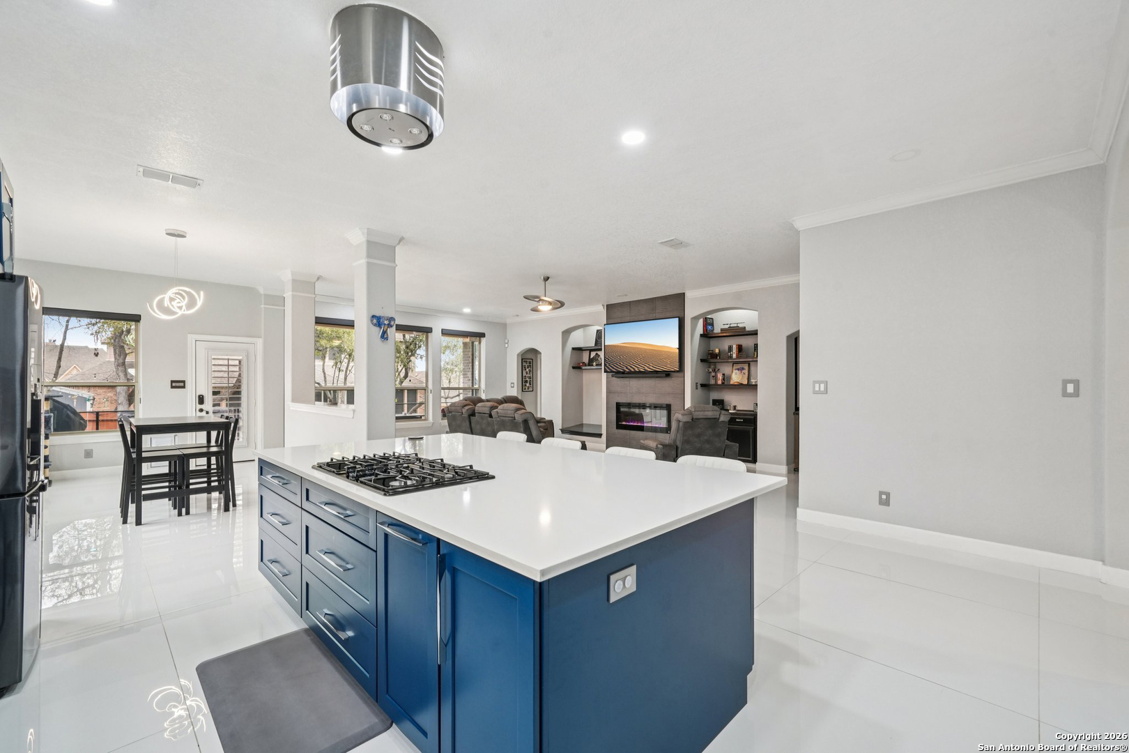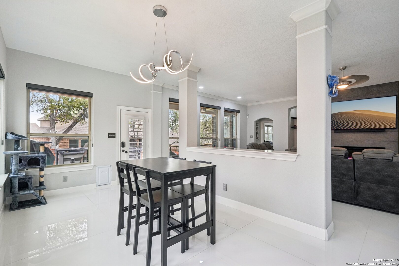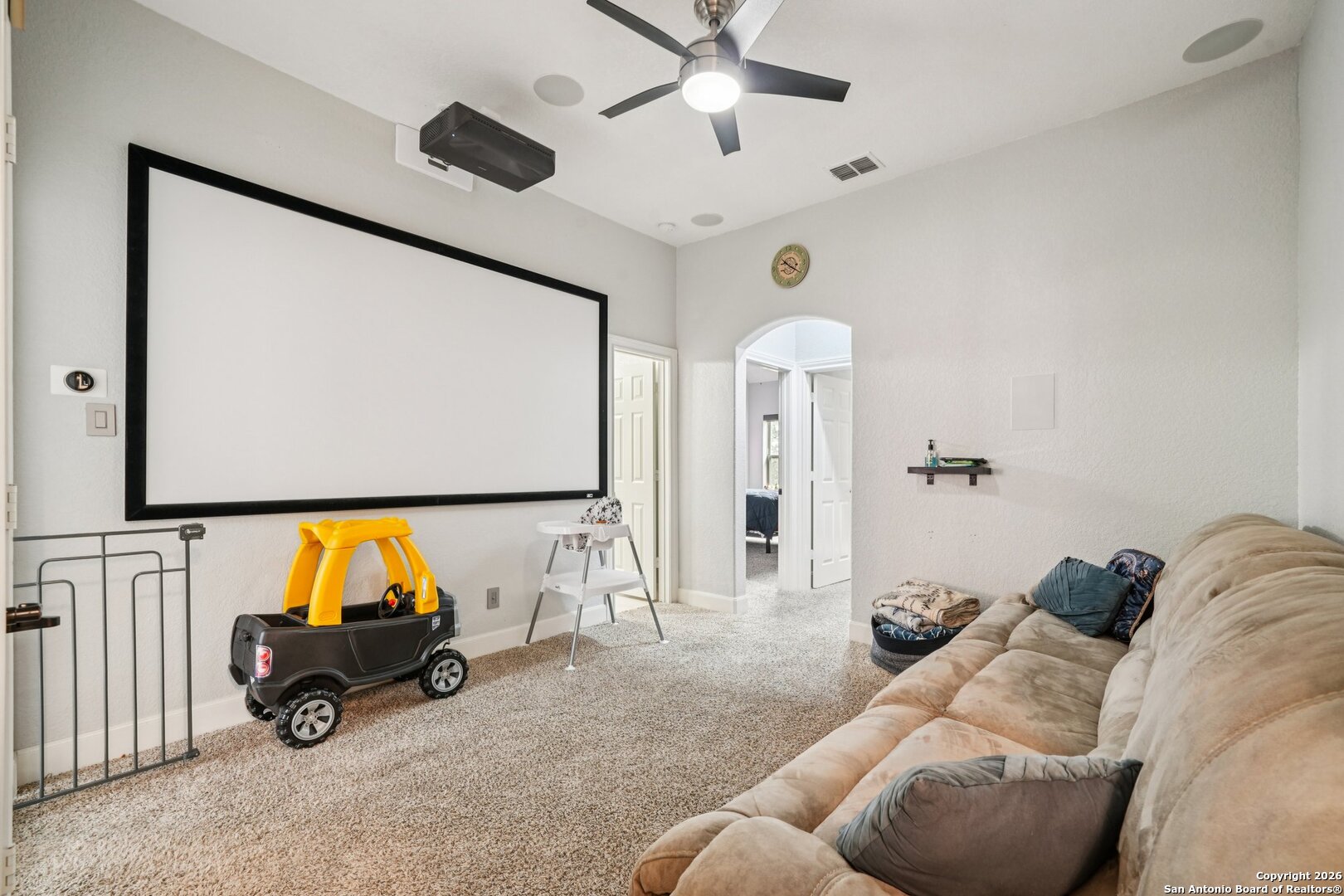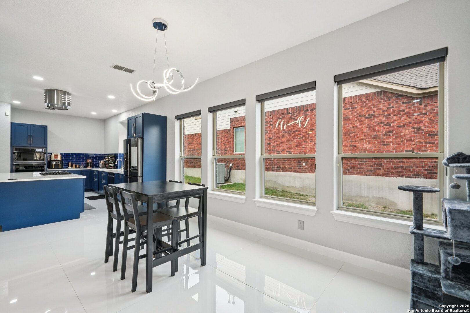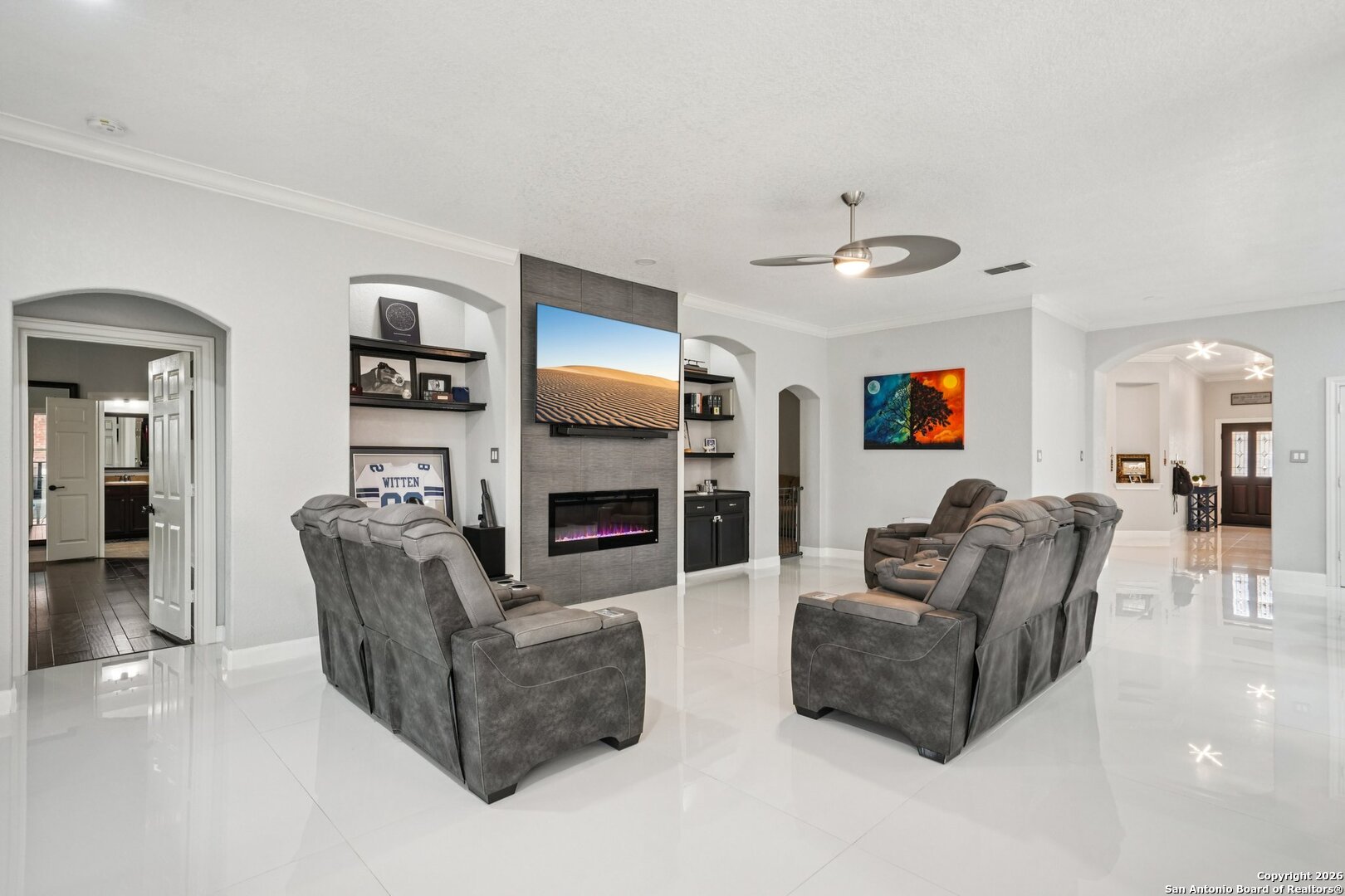 ** OPEN HOUSE on Saturday, 01/31/2026 from 11am-2pm ** Located within a gated community, this modern smart home delivers a refined blend of technology, design, and everyday functionality. Meticulously well kept, the residence features 4x4 white porcelain tile flooring throughout the main living areas, creating a clean and contemporary aesthetic. Elegant modern light fixtures and recessed lighting enhance the open layout and elevate the overall ambiance. The kitchen serves as a true centerpiece, offering quartz countertops, an oversized island with built in phone charging, and sleek stainless and black steel appliances. A gas stove paired with a retractable Faber vent combines performance with thoughtful design, making the space ideal for both entertaining and daily living. The primary suite provides a private retreat with a comfortable sitting area and a spa inspired bathroom featuring a large walk in shower, separate garden tub, and an expansive walk in closet. Two additional bedrooms are complemented by a flex room suitable for a home office, exercise room, or creative space. A dedicated theater room adds an additional layer of versatility and entertainment. Outdoors, the covered patio with ceiling fans creates an inviting extension of the living space. The backyard is highlighted by a Michael Phelps Signature Swim Spa that can function as a lap pool or convert to a hot tub, along with a convenient storage shed. The home is equipped with solar panels and advanced smart home technology, enhancing efficiency and comfort. The three car garage features epoxy flooring and built in heavy duty shelving for excellent organization and durability. Ideally positioned with easy access to Loop 1604 and Highway 151, the property is centrally located in the Alamo Ranch area near SeaWorld San Antonio, shopping, dining, and entertainment. Neighborhood amenities include a community pool, park, and playground. The property is part of the award winning NISD school district.