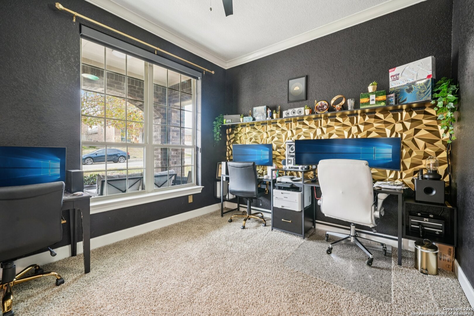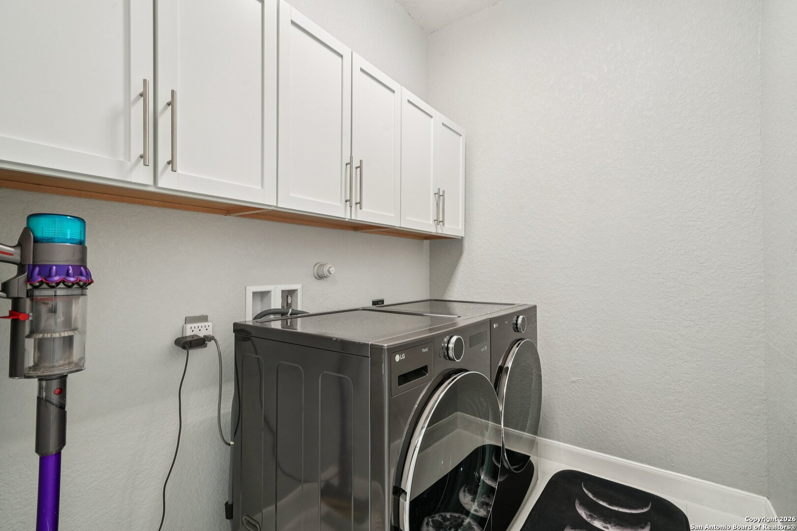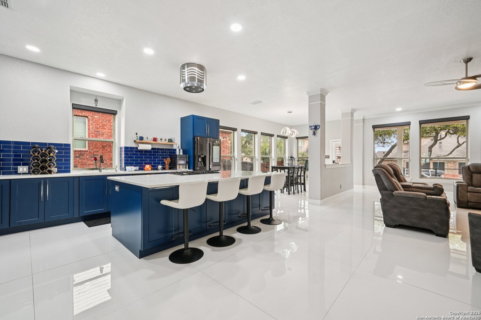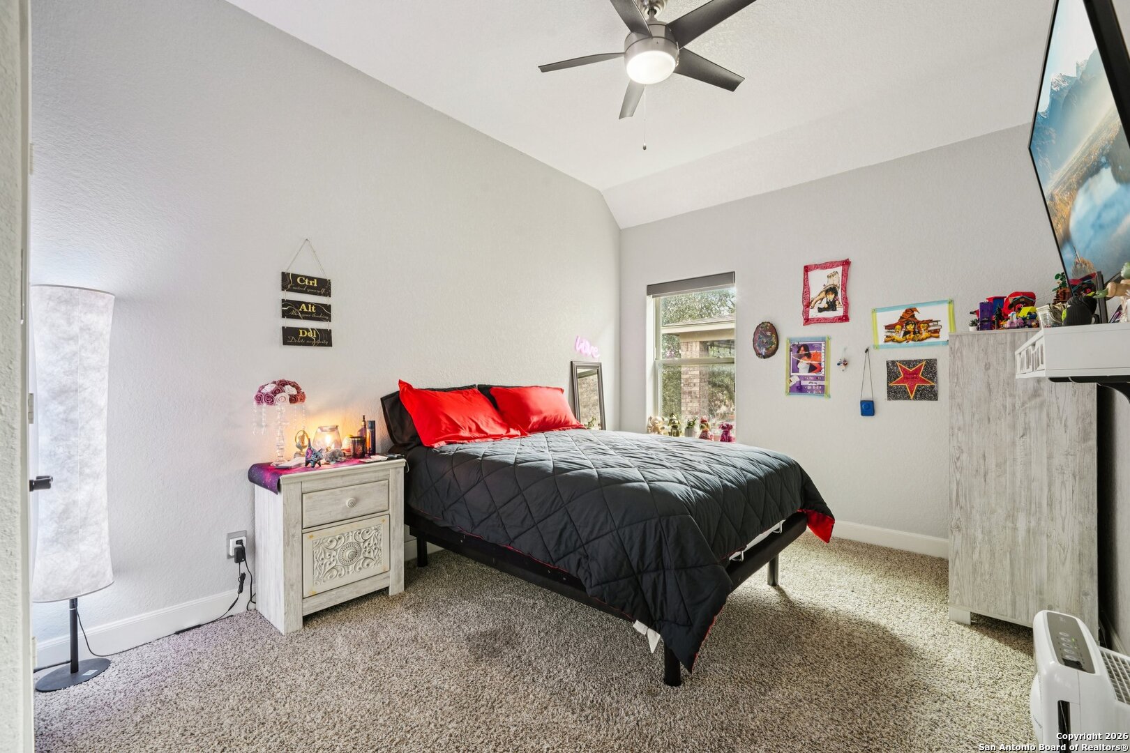 ** OPEN HOUSE on Saturday, 01/31/2026 from 11am-2pm ** Located within a gated community, this modern smart home delivers a refined blend of technology, design, and everyday functionality. Meticulously well kept, the residence features 4x4 white porcelain tile flooring throughout the main living areas, creating a clean and contemporary aesthetic. Elegant modern light fixtures and recessed lighting enhance the open layout and elevate the overall ambiance. The kitchen serves as a true centerpiece, offering quartz countertops, an oversized island with built in phone charging, and sleek stainless and black steel appliances. A gas stove paired with a retractable Faber vent combines performance with thoughtful design, making the space ideal for both entertaining and daily living. The primary suite provides a private retreat with a comfortable sitting area and a spa inspired bathroom featuring a large walk in shower, separate garden tub, and an expansive walk in closet. Two additional bedrooms are complemented by a flex room suitable for a home office, exercise room, or creative space. A dedicated theater room adds an additional layer of versatility and entertainment. Outdoors, the covered patio with ceiling fans creates an inviting extension of the living space. The backyard is highlighted by a Michael Phelps Signature Swim Spa that can function as a lap pool or convert to a hot tub, along with a convenient storage shed. The home is equipped with solar panels and advanced smart home technology, enhancing efficiency and comfort. The three car garage features epoxy flooring and built in heavy duty shelving for excellent organization and durability. Ideally positioned with easy access to Loop 1604 and Highway 151, the property is centrally located in the Alamo Ranch area near SeaWorld San Antonio, shopping, dining, and entertainment. Neighborhood amenities include a community pool, park, and playground. The property is part of the award winning NISD school district.