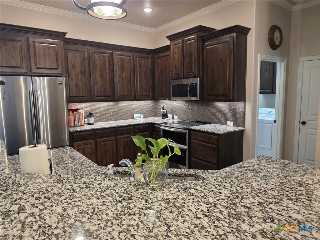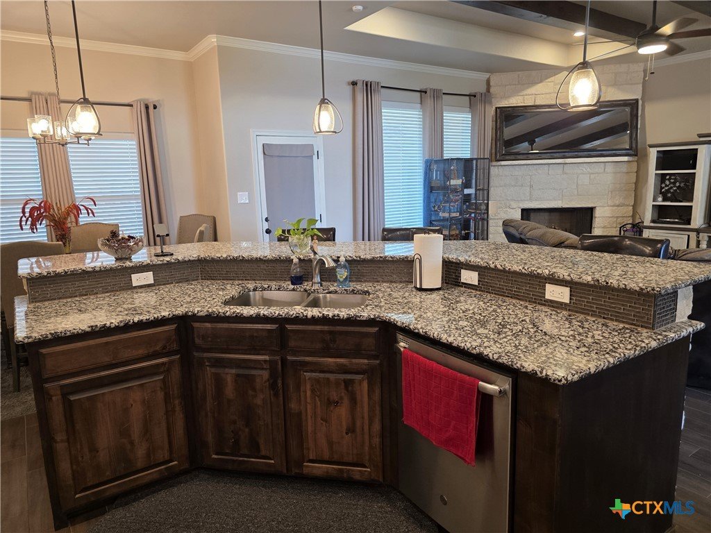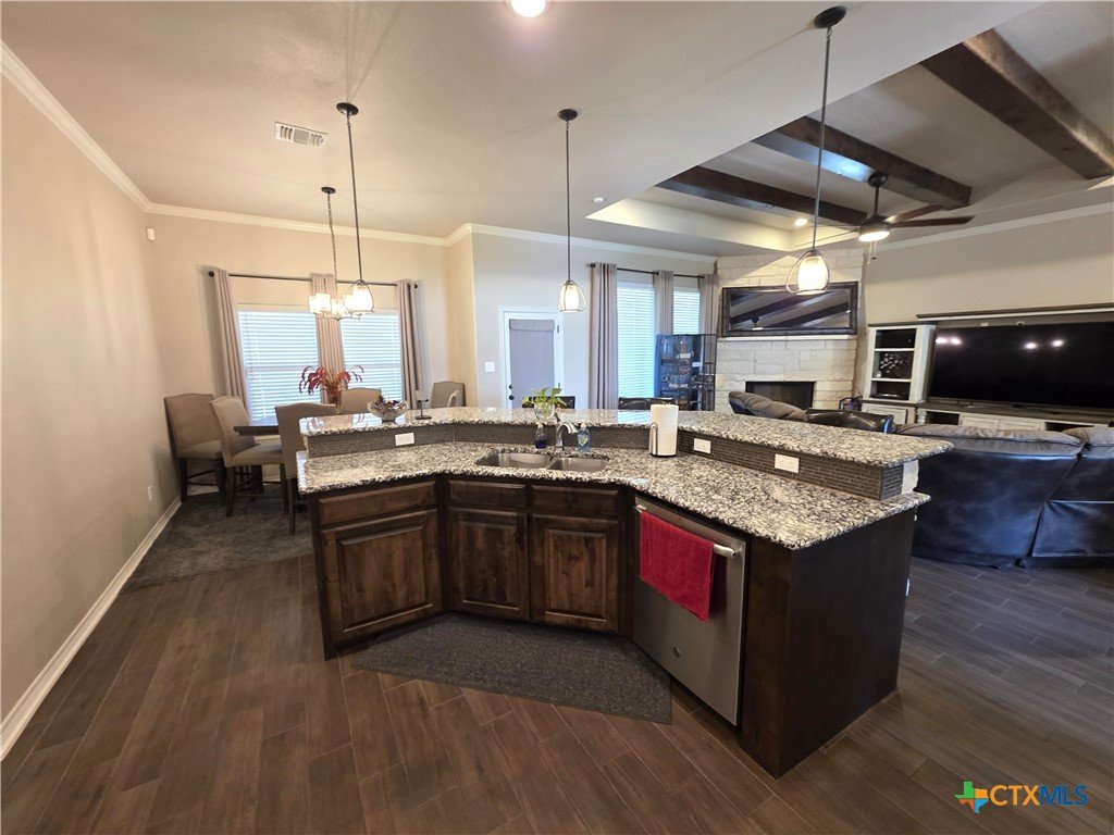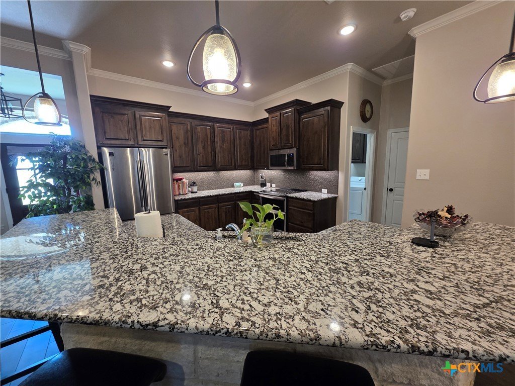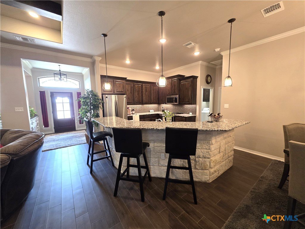 **Elegant Hill Country Living in Salado’s Laurel Highlands** Welcome to 3318 Laurel Highlands — a beautifully crafted stone and brick home that perfectly blends sophistication, warmth, and everyday comfort. This spacious single-story offers a thoughtful open floor plan designed for entertaining and effortless living. Inside, you’re greeted by rich wood-look tile flooring and exposed ceiling beams that add rustic charm to the expansive living area. The inviting family room flows seamlessly into a stunning kitchen, featuring gleaming granite countertops, custom cabinetry, stainless steel appliances, and an oversized island with breakfast bar seating — perfect for casual mornings or hosting friends. Natural light fills every corner, highlighting the home’s fine finishes and timeless design. The dining area sits just off the kitchen, creating an easy flow between meals and conversation. The cozy stone fireplace anchors the living space, making it the true heart of the home. The primary suite is a serene retreat with a luxurious ensuite bath and ample closet space, while secondary bedrooms provide flexibility for family, guests, or a home office. Outside, a wide front walkway welcomes you to the home’s classic Texas stone façade, surrounded by neatly landscaped grounds and plenty of room to play or unwind. Located in the sought-after Salado community — known for its small-town charm, and easy access to I-35 — this home offers the best of Hill Country living with modern style and comfort.
