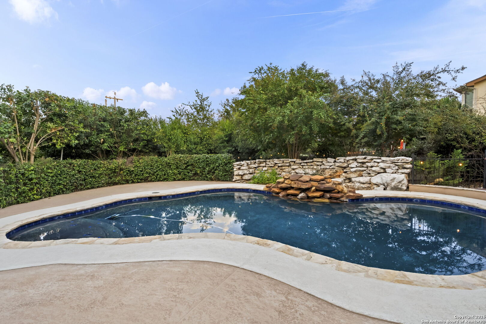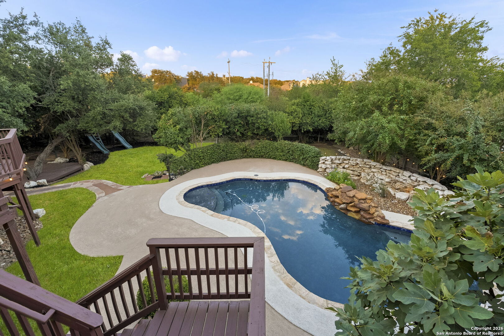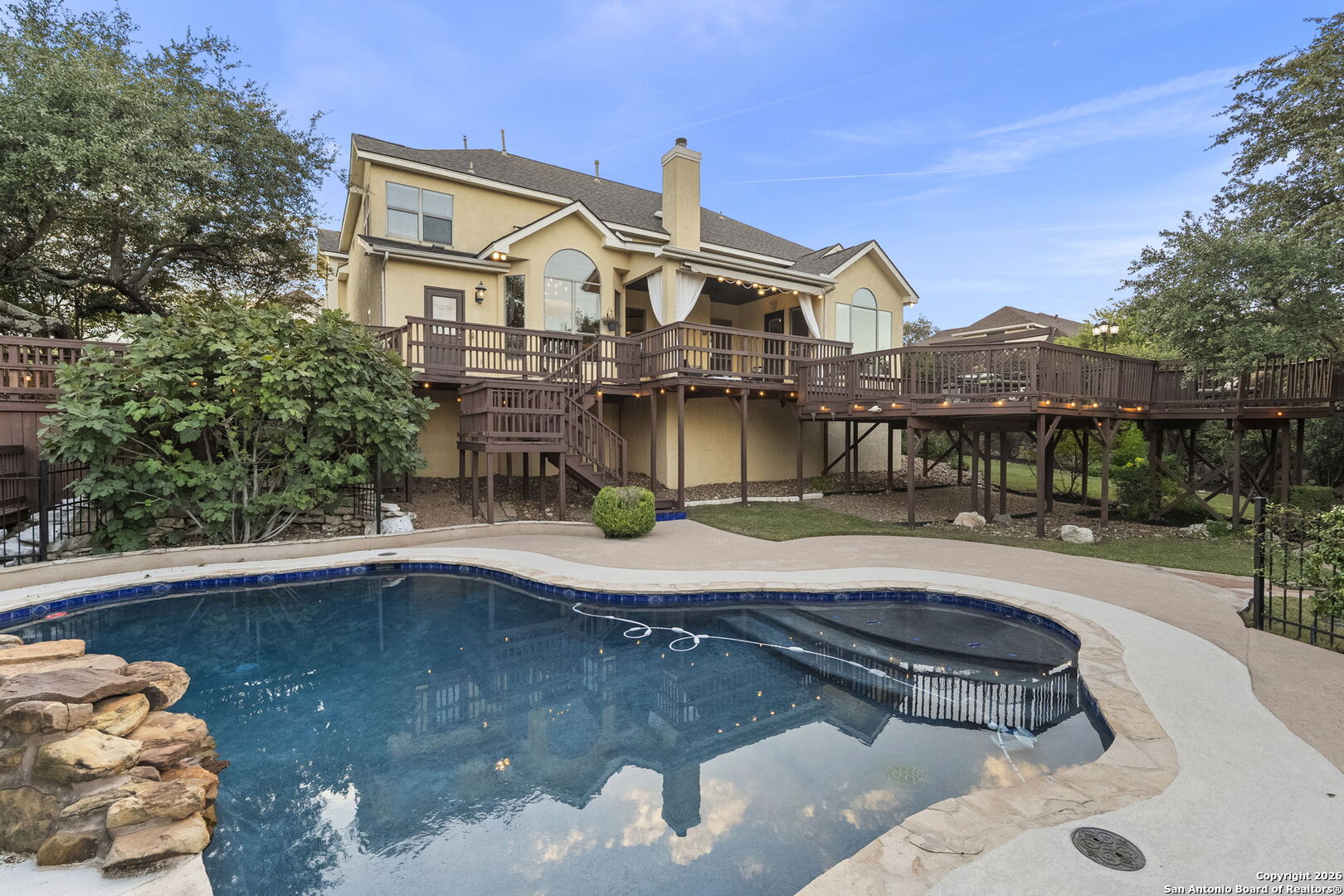 Welcome to this rare half-acre greenbelt retreat in the prestigious gated community of Evans Ranch. Offering timeless design and exceptional value, this meticulously maintained 4,356 sq ft home features 4 bedrooms, 3 full baths, 2 half baths, a dedicated study, and an expansive game/media room-perfect for both everyday living and entertaining. The chef's kitchen boasts granite countertops, custom cabinetry, gas cooking, and a walk-in pantry, flowing seamlessly into the bright family room with fireplace and large windows framing serene greenbelt views. Step outside to your private green belt resort-style oasis, complete with a lagoon-style pool, 1,200 sq ft of decking, covered patio, and lush mature trees-including fruit and flowering varieties. The primary suite is a luxurious retreat with high ceilings, outdoor access, dual walk-in closets, and a spa-inspired bath with Jacuzzi tub and oversized rain shower. Additional highlights include formal living and dining areas, a cabana bath for poolside convenience, and direct walkway access to Roan Forest Elementary. With its premium lot, abundant privacy, and NEISD location near shopping, dining, and 281, this home offers the perfect blend of elegance, comfort, and convenience.