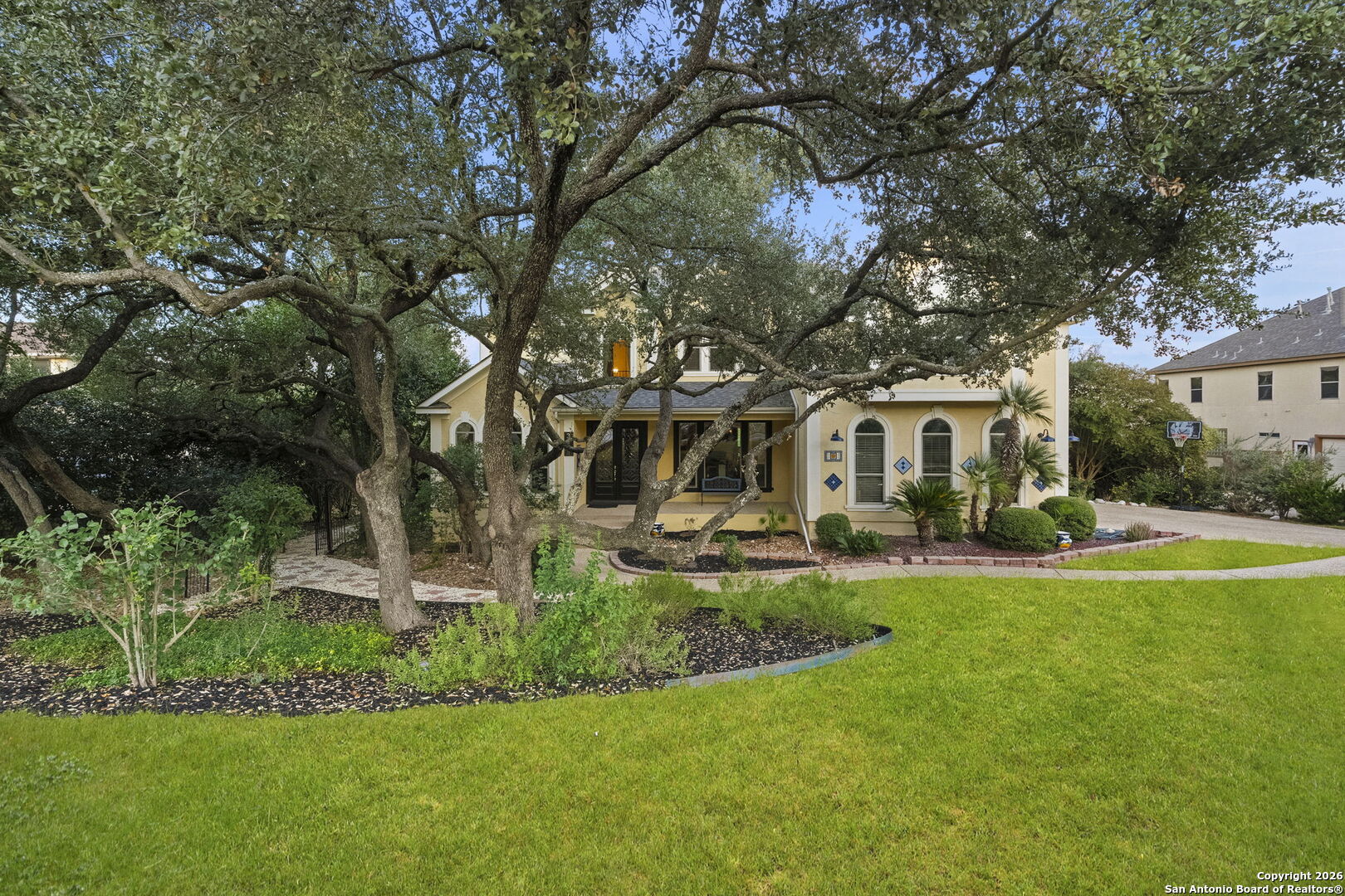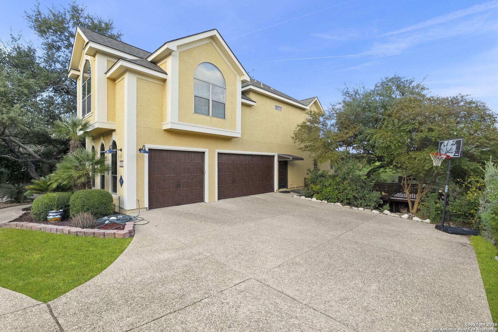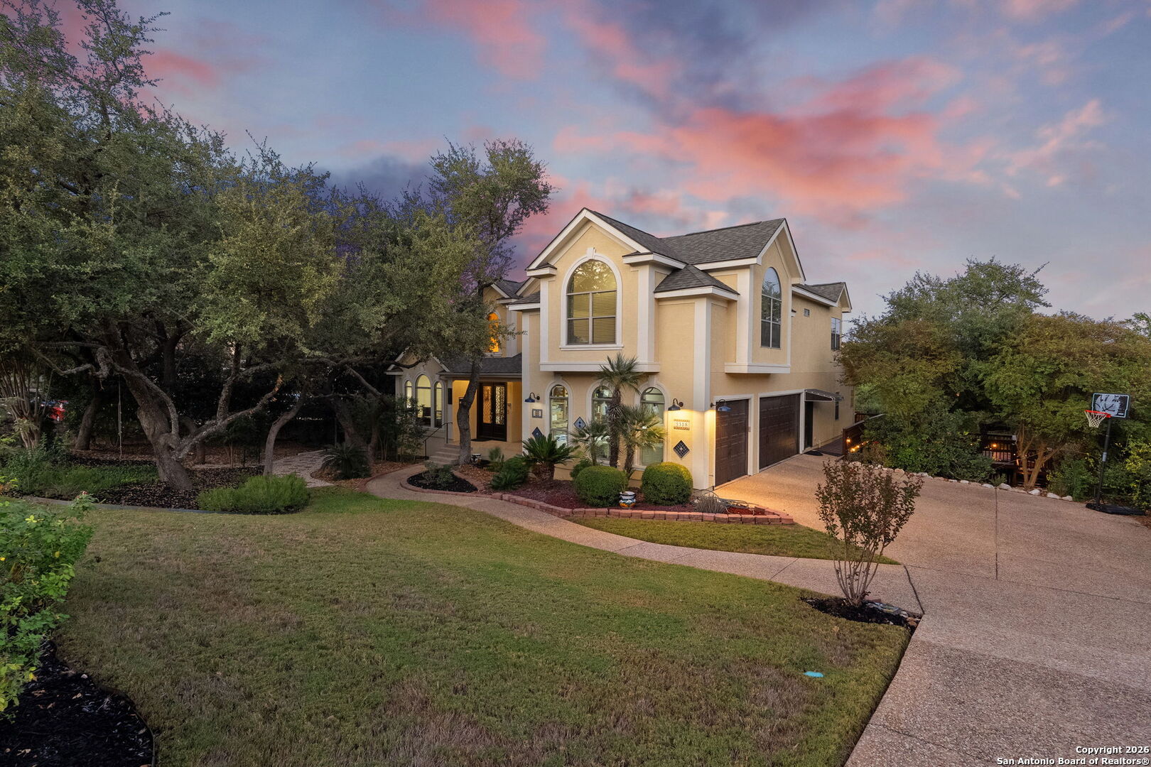 Welcome to this rare half-acre greenbelt retreat in the prestigious gated community of Evans Ranch. Offering timeless design and exceptional value, this meticulously maintained 4,356 sq ft home features 4 bedrooms, 3 full baths, 2 half baths, a dedicated study, and an expansive game/media room-perfect for both everyday living and entertaining. The chef's kitchen boasts granite countertops, custom cabinetry, gas cooking, and a walk-in pantry, flowing seamlessly into the bright family room with fireplace and large windows framing serene greenbelt views. Step outside to your private green belt resort-style oasis, complete with a lagoon-style pool, 1,200 sq ft of decking, covered patio, and lush mature trees-including fruit and flowering varieties. The primary suite is a luxurious retreat with high ceilings, outdoor access, dual walk-in closets, and a spa-inspired bath with Jacuzzi tub and oversized rain shower. Additional highlights include formal living and dining areas, a cabana bath for poolside convenience, and direct walkway access to Roan Forest Elementary. With its premium lot, abundant privacy, and NEISD location near shopping, dining, and 281, this home offers the perfect blend of elegance, comfort, and convenience.