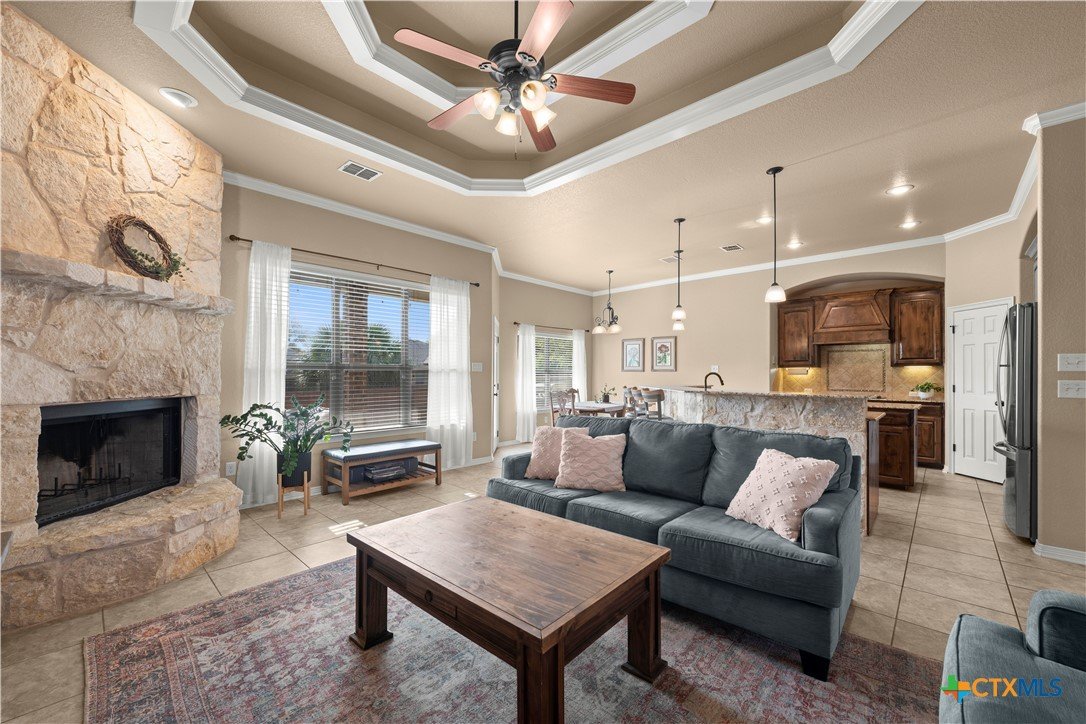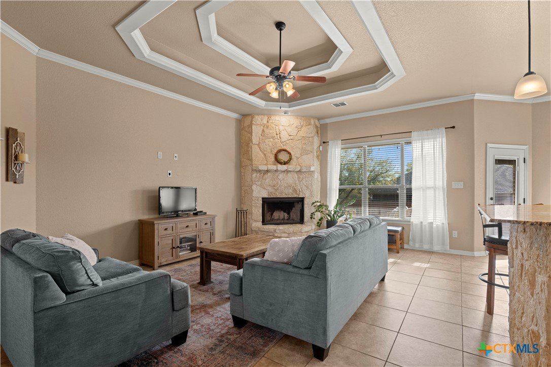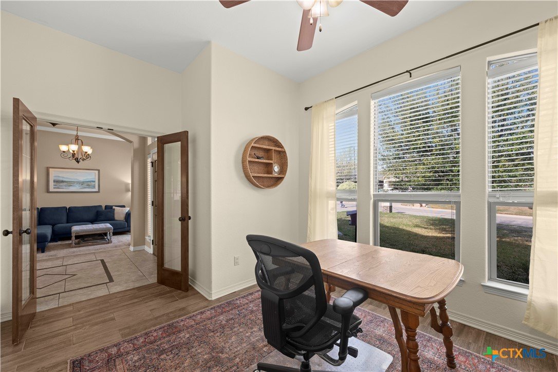 Beautiful Carothers built family home. Excellent condition and move in ready. Home is in sought after Dawson Ranch. Jogging and walking trails nearby and close to schools. Great open floor plan, kitchen open to family room with cozy fireplace. Dedicated office space perfect for remote worker. 2 additional generous sized bedrooms on one side of home with well appointed bath and master on opposite side. Home has a large corner lot fenced yard and an amazing covered patio, perfect for entertaining or family time.