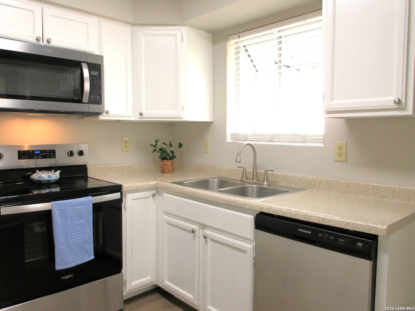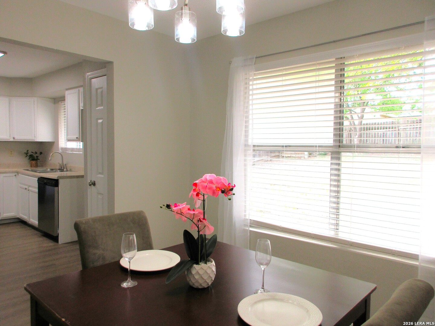 Completely updated and beautiful. Kitchen features new stainless appliances and a breakfast bar. New light fixtures. New door and cabinet hardware. New faux wood flooring in the living area, dining, and kitchen. New carpet in the bedrooms. High ceilings. Fresh paint inside and out. New 2 inch blinds and window treatments are included. Covered patio. New AC and heat system 2026.