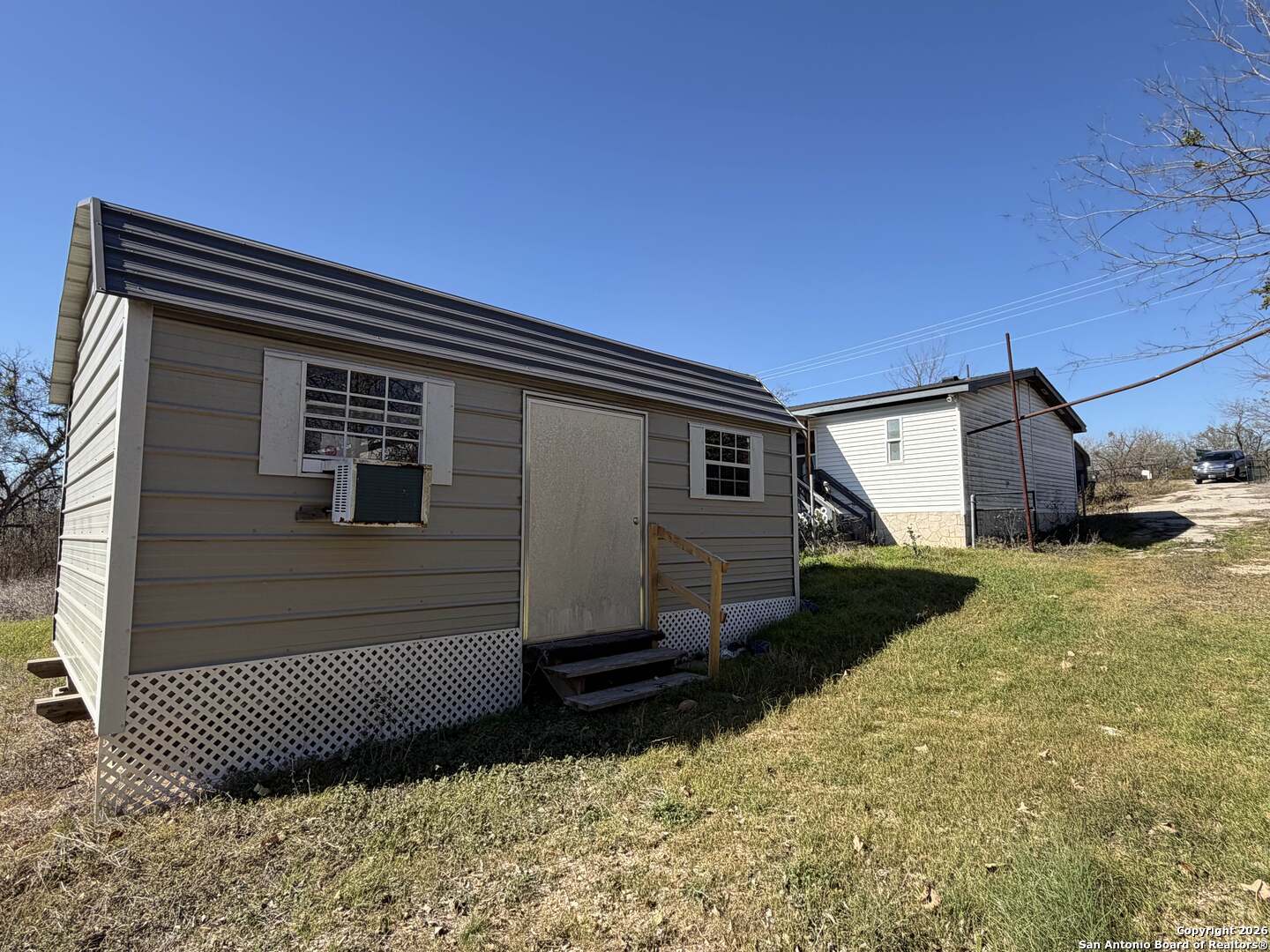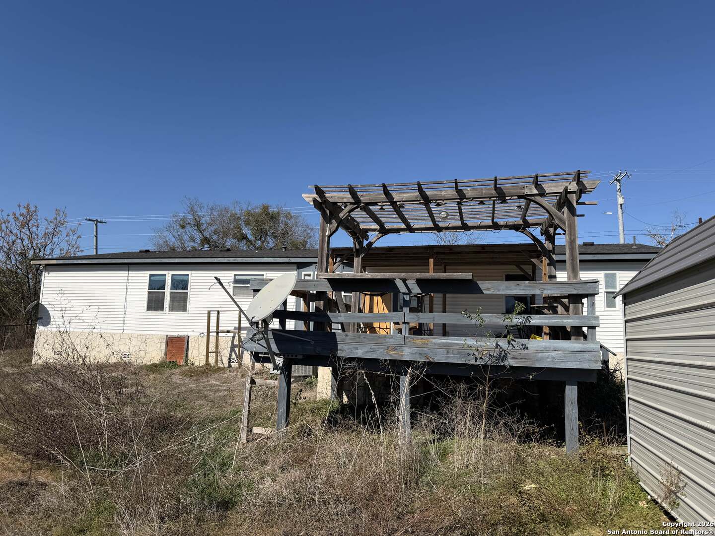 Must SEE! 4-bedroom, 2-bath double-wide manufactured home on approx. 0.8 acres of land, offering peaceful country living just minutes from New Braunfels. The home features laminate flooring in the living areas and kitchen with carpeted bedrooms, a spacious living room with fireplace, and an eat-in kitchen with ample cabinetry, smooth cooktop, and dining space. The primary suite includes a walk-in closet, double vanity, and separate tub and shower. Outside, enjoy a fully fenced yard with plenty of room for pets, projects, or outdoor entertaining, plus a detached garage, two-car carport, deck, and storage shed. Note: Requires short sale.